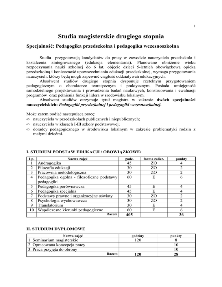 1 Studia magisterskie drugiego stopnia Specjalność: Pedagogika przedszkolna i pedagogika wczesnoszkolna Studia przygotowują kandydatów do pracy w zawodzie nauczyciela przedszkola i kształcenia zintegrowanego (edukacja elementarna). Planowane obniżenie wieku rozpoczynania nauki szkolnej do 6 lat, objęcie dzieci 5-letnich obowiązkową opieką przedszkolną i konieczność upowszechniania edukacji przedszkolnej, wymaga przygotowania nauczycieli, którzy będą mogli zapewnić ciągłość oddziaływań edukacyjnych. Absolwent studiów drugiego stopnia dysponuje rzetelnym przygotowaniem pedagogicznym o charakterze teoretycznym i praktycznym. Posiada umiejętność samodzielnego projektowania i prowadzenia badań naukowych, konstruowania i ewaluacji programów oraz pełnienia funkcji lidera w środowisku lokalnym. Absolwent studiów otrzymuje tytuł magistra w zakresie dwóch specjalności nauczycielskich: Pedagogiki przedszkolnej i pedagogiki wczesnoszkolnej. Może zatem podjąć następującą pracę: • nauczyciela w przedszkolach publicznych i niepublicznych; • nauczyciela w klasach I-III szkoły podstawowej; • doradcy pedagogicznego w środowisku lokalnym w zakresie problematyki rodzin z małymi dziećmi. I. STUDIUM PODSTAW EDUKACJI / OBOWIĄZKOWE/ Lp. Nazwa zajęć 1 2 3 4 Andragogika Filozofia edukacji Pracownia metodologiczna Pedagogika ogólna - filozoficzne podstawy pedagogiki 5 Pedagogika porównawcza 6 Pedagogika specjalna 7 Podstawy prawne i organizacyjne oświaty 8 Psychologia wychowawcza 9 Translatorium 10 Współczesne kierunki pedagogiczne Razem godz. forma zalicz. punkty 45 30 30 60 ZO ZO ZO E 4 2 2 6 45 45 30 30 30 60 405 E E ZO ZO E E 4 4 2 2 4 6 36 II. STUDIUM DYPLOMOWE Nazwa zajęć 1. Seminarium magisterskie 2. Opracowana koncepcja pracy 3. Praca przyjęta do obrony Razem godziny punkty 120 8 10 10 28 120 2 III. PRAKTYKI Lp. Nazwa zajęć godz. forma zalicz. punkty 1 Praktyka zarządzanie w placówkach edukacyjnych Projektowanie programów placówki edukacyjnej (wg różnych koncepcji pedagogicznych) 30 ZO 3 30 ZO 3 Razem 60 2 6 IV. SPECJALNOŚĆ GŁÓWNA - PEDAGOGIKA PRZEDSZKOLNA Lp. Nazwa przedmiotu godz. punkty 1 3 Pedagogika przedszkolna Kompetencje zawodowe doradcy metodycznego w przedszkolu (prawo oświatowe) Etyka zawodu nauczyciela Wewnątrzszkolne doskonalenie nauczycieli przedszkolaprojekty Współpraca z organizacjami pozarządowymi Międzynarodowe programy i projekty edukacyjne Metody aktywizujące rozwój i uczenie się dziecka Działania edukacyjne w środowisku lokalnym oraz w rodzinnym Polityka edukacyjna Edukacja małych dzieci na świecie. Edukacja medialna małego dziecka Edukacja obywatelska Edukacja wielokulturowa Razem 60 E 30 ZO 6 2 30 ZO 30 ZO 2 2 30 ZO 30 ZO 30 ZO 30 ZO 30 ZO 30 ZO 30 ZO 30 ZO 390 2 2 2 2 2 2 2 2 22 4 5 6 7 8 9 10 11. 12. 13. V. SPECJALNOŚC DODATKOWA – PEDAGOGIKA WCZESNOSZKOLNA Lp. Nazwa przedmiotu godz. punkty 1 2 3 Pedagogika wczesnoszkolna Ewaluacja instytucji edukacyjnych. Kompetencje zawodowe doradcy metodycznego w szkole (prawo oświatowe) Ocenianie w szkole Wewnątrzszkolne doskonalenie nauczycieli – projekty Różnice indywidualne a nauczanie-praca z uczniem zdolnym Technologia informacyjna Emisja głosu 60 E 30 ZO 30 ZO 6 2 2 30 ZO 30 ZO 30 ZO 30 ZO 30 ZO 270 2 2 2 2 2 20 4 5 6 7 8 Razem 3 VI. STUDIUM UZUPEŁNIAJĄCE – do wyboru 120 godz. ( 8pkt) ( STUDIUMWIEDZY HUMANISTYCZNO-SPOŁECZNEJ) (do wyboru, opis jak wyżej) ZESTAWIENIE GODZIN I PUNKTÓW Nazwa grupy przedmiotów Studium podstaw edukacji Specjalność główna Specjalność dodatkowa Studium dyplomowe Studium uzupełniające Praktyki Razem Liczba godzin 405 390 270 120 120 60 1365 Liczba punktów 36 22 20 28 8 6 120
