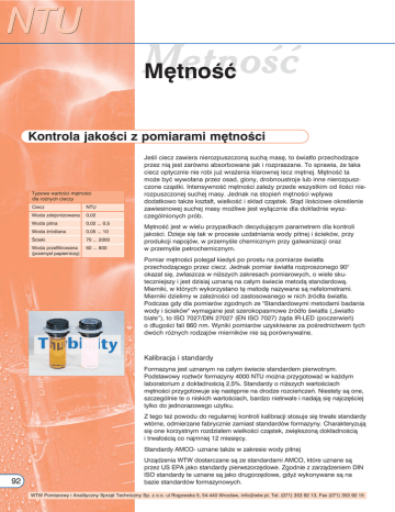 NTU Mętność Mętność Kontrola jakości z pomiarami mętności Typowe wartości mętności dla rożnych cieczy Ciecz NTU Woda zdejonizowana 0,02 Woda pitna 0,02 ... 0,5 Woda źródlana 0,05 ... 10 Ścieki 70 ... 2000 Woda przefiltrowana (przemysł papierniczy) 60 ... 800 Jeśli ciecz zawiera nierozpuszczoną suchą masę, to światło przechodzące przez nią jest zarówno absorbowane jak i rozpraszane. To sprawia, że taka ciecz optycznie nie robi już wrażenia klarownej lecz mętnej. Mętność ta może być wywołana przez osad, glony, drobnoustroje lub inne nierozpuszczone cząstki. Intensywność mętności zależy przede wszystkim od ilości nierozpuszczonej suchej masy. Jednak na stopień mętności wpływa dodatkowo także kształt, wielkość i skład cząstek. Stąd ilościowe określenie zawiesinowej suchej masy możliwe jest wyłącznie dla dokładnie wyszczególnionych prób. Mętność jest w wielu przypadkach decydującym parametrem dla kontroli jakości. Dzieje się tak w procesie uzdatniania wody pitnej i ścieków, przy produkcji napojów, w przemyśle chemicznym przy galwanizacji oraz w przemyśle petrochemicznym. Pomiar mętności polegał kiedyś po prostu na pomiarze światła przechodzącego przez ciecz. Jednak pomiar światła rozproszonego 90° okazał się, zwłaszcza w niższych zakresach pomiarowych, o wiele skuteczniejszy i jest dzisiaj uznaną na całym świecie metodą standardową. Mierniki, w których wykorzystano tę metodę nazywane są nefelometrami. Mierniki dzielimy w zależności od zastosowanego w nich źródła światła. Podczas gdy dla pomiarów zgodnych ze "Standardowymi metodami badania wody i ścieków" wymagane jest szerokopasmowe źródło światła („światło białe”), to ISO 7027/DIN 27027 (EN ISO 7027) żąda IR-LED (poczerwień) o długości fali 860 nm. Wyniki pomiarów uzyskiwane za pośrednictwem tych dwóch różnych rodzajów mierników nie są porównywalne. Kalibracja i standardy Formazyna jest uznanym na całym świecie standardem pierwotnym. Podstawowy roztwór formazyny 4000 NTU można przygotować w każdym laboratorium z dokładnością 2,5%. Standardy o niższych wartościach mętności przygotowuje się następnie na drodze rozcieńczeń. Niestety są one, szczególnie te o niskich wartościach, bardzo nietrwałe i nadają się najczęściej tylko do jednorazowego użytku. Z tego też powodu do regularnej kontroli kalibracji stosuje się trwałe standardy wtórne, odmierzane fabrycznie zamiast standardów formazyny. Charakteryzują się one korzystnym rozdziałem wielkości cząstek, zwiększoną dokładnością i trwałością co najmniej 12 miesięcy. Standardy AMCO- uznane także w zakresie wody pitnej 92 Urządzenia WTW dostarczane są ze standardami AMCO, które uznane są przez US EPA jako standardy pierwszorzędowe. Zgodnie z zarządzeniem DIN ISO standardy te uznane są jako drugorzędowe, gdyż wykonywane są na bazie standardów formazynowych. WTW Pomiarowy i Analityczny Sprzęt Techniczny Sp. z o.o. ul Rogowska 5, 54-440 Wrocław, [email protected], Tel. (071) 353 92 13, Fax (071) 353 92 15 Labolatorium i środowisko Mętność Pomiar potencjału Redox WTW oferuje 3 modele w różnych wykonaniach: - przenośne urządzenie pracujące w zakresie światła podczerwonego lub widzialnego - mierniki laboratoryjne pracujące w zakresie światła podczerwonego lub widzialnego pH -metry Które urządzenie do jakich zastosowań? Zastosowanie Mobilne prace ze ściekami, wodami powierzchniowymi i gruntowymi Rutynowe pomiary dla wszystkich zakresów zadań w laboratorium, wody pitne Precyzyjny miernik do rutynowych i precyzyjnych pomiarów w laboratorium Źródło światła Lampa wolframowa/IR LED Lampa wolframowa/IR LED Lampa wolframowa/IR LED Zakres pomiarowy 0-1100 NTU/FNU 0-1000 NTU/FNU 0-10000 NTU/FNU/FAU Kalibracja Automatyczna 1-3 punktowa Automatyczna 1-3 punktowa Automatyczna 1-5 punktowa Szczególne funkcje Przenośne urządzenie terenowe AQS pomiary w przepływie AQS z hasłem ochronnym, metoda Ratio do redukcji zakłóceń, transmisja, pomiary w przepływie (bezciśnieniowe/do 4 bar) Mierniki wieloparamtowe Turb 555/Turb 555 IR Pomiar BZT Turb 550/Turb 550 IR Standardy AMCO Przy pomiarach ruchomych cząstek, możliwe są wahania wartości pomiarowych. Aby możliwe było utrzymanie reprezentatywnych wyników, powinno się przestrzegać następujących reguł: - Natychmiastowy pomiar prób, których cząstki osadzają się - Stabilna temperatura operacyjna - Unikać kondensacji pary na próbie - Oznaczać pozycję standardów, aby wyeliminować wpływ niejednorodności szkła Funkcje AQS Funkcja AutoRange do automatycznego rozpoznawania zakresu pomiarowego DIN/ISO + US EPA WTW Pomiarowy i Analityczny Sprzęt Techniczny Sp. z o.o. ul Rogowska 5, 54-440 Wrocław, [email protected], Tel. (071) 353 92 13, Fax (071) 353 92 15 Oprogramowanie, drukarki Proszę zwrócić uwagę! Licznik kolonii bakterii Pomiar mętności Turb 355 T/IR Fotometry Zakres zastosowań Konduktometry Tlenomierze Jonometry NOWOŚĆ 93 NTU Mętność Mętnościomierze laboratoryjne Turb 550 / Turb 550 IR 2 Automatyczne przełączanie zakresów pomiarowych AutoRange Automatyczna kalibracja 1-3 punktowa Pomiary w przepływie Lata Gwarancji Profesjonalny mętnościomierz do 1000 NTU Mętnościomierze laboratoryjne do pomiarów nefelometrycznych z automatyczną kalibracją 5-punktową, wyjściem RS 232, zintegrowanym zegarem czasu rzeczywistego i kontrolą interwału kalibracyjnego. Wybór zakresu pomiarowego od 0,01 do 1000 NTU odbywa się automatycznie. Przy pomiarach porównawczych istnieje możliwość jednoczesnego odczytu wartości aktualnie mierzonej i poprzedniej. Dostawa, oprócz aparatu ze skróconą instrukcją obsługi, obejmuje wyposażenie zawierające 3 puste kuwety, 3 standardy wtórne (0,02-10,01000 NTU, AMCO® standardy także dla wody pitnej wg EN ISO 7027 względnie jako pierwszorzędowe standardy wg US EPA). Ciągłe pomi