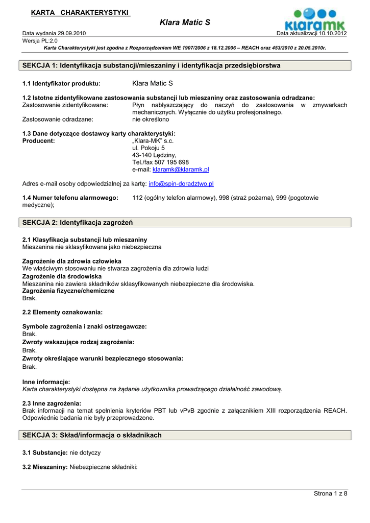 KARTA CHARAKTERYSTYKI Klara Matic S Data wydania 29.09.2010 Wersja PL:2.0 Data aktualizacji 10.10.2012 Karta Charakterystyki jest zgodna z Rozporządzeniem WE 1907/2006 z 18.12.2006 – REACH oraz 453/2010 z 20.05.2010r. SEKCJA 1: Identyfikacja substancji/mieszaniny i identyfikacja przedsiębiorstwa 1.1 Identyfikator produktu: Klara Matic S 1.2 Istotne zidentyfikowane zastosowania substancji lub mieszaniny oraz zastosowania odradzane: Zastosowanie zidentyfikowane: Płyn nabłyszczający do naczyń do zastosowania w zmywarkach mechanicznych. Wyłącznie do użytku profesjonalnego. Zastosowanie odradzane: nie określono 1.3 Dane dotyczące dostawcy karty charakterystyki: Producent: „Klara-MK” s.c. ul. Pokoju 5 43-140 Lędziny, Tel./fax 507 195 698 e-mail: [email protected] Adres e-mail osoby odpowiedzialnej za kartę: [email protected] 1.4 Numer telefonu alarmowego: medyczne); 112 (ogólny telefon alarmowy), 998 (straż pożarna), 999 (pogotowie SEKCJA 2: Identyfikacja zagrożeń 2.1 Klasyfikacja substancji lub mieszaniny Mieszanina nie sklasyfikowana jako niebezpieczna Zagrożenie dla zdrowia człowieka We właściwym stosowaniu nie stwarza zagrożenia dla zdrowia ludzi Zagrożenie dla środowiska Mieszanina nie zawiera składników sklasyfikowanych niebezpieczne dla środowiska. Zagrożenia fizyczne/chemiczne Brak. 2.2 Elementy oznakowania: Symbole zagrożenia i znaki ostrzegawcze: Brak. Zwroty wskazujące rodzaj zagrożenia: Brak. Zwroty określające warunki bezpiecznego stosowania: Brak. Inne informacje: Karta charakterystyki dostępna na żądanie użytkownika prowadzącego działalność zawodową. 2.3 Inne zagrożenia: Brak informacji na temat spełnienia kryteriów PBT lub vPvB zgodnie z załącznikiem XIII rozporządzenia REACH. Odpowiednie badania nie były przeprowadzone. SEKCJA 3: Skład/informacja o składnikach 3.1 Substancje: nie dotyczy 3.2 Mieszaniny: Niebezpieczne składniki: Strona 1 z 8 KARTA CHARAKTERYSTYKI Klara Matic S Data wydania 29.09.2010 Wersja PL:2.0 Data aktualizacji 10.10.2012 Karta Charakterystyki jest zgodna z Rozporządzeniem WE 1907/2006 z 18.12.2006 – REACH oraz 453/2010 z 20.05.2010r. Identyfikator produktu Zawartość % Alkohol etylowy CAS: 64-17-5 WE: 200-578-6 Nr indeksowy: 603-002-00-5 Nr REACH: substancja podlega przepisom okresu przejściowego 5 - 10 Alkohol izopropylowy CAS: 67-63-0 WE: 200-661-7 Nr indeksowy: 603-117-00-0 Nr REACH: substancja podlega przepisom okresu przejściowego 1-5 Kwas cytrynowy CAS: 77-92-9 WE: 201-069-1 Nr indeksowy: Nr REACH: substancja podlega przepisom okresu przejściowego 1-3 Siarczan etyloheksylo – sodowy CAS: 126-92-1 WE: 204-812-8 Nr indeksowy: Nr REACH: substancja podlega przepisom okresu przejściowego 1-3 Benzoesan denatonium CAS: 3734-33-6 WE: 223-095-2 Nr indeksowy: Nr REACH: substancja podlega przepisom okresu przejściowego Klasyfikacja wg 67/548/EWG F; R11 F; R11 Xi; R36 Klasyfikacja CLP Kody zwrotów Klasa zagrożenia i wskazujących kody kategorii rodzaj zagrożenia Flam.Liq.2 H225 Flam.Liq.2 Eye Irrit.2 STOT SE 3 H225 H319 H336 Eye Irrit.2 H319 Skin Irrit.2 Eye Dam.1 H315 H318 Acute Tox.3 Eye Irrit.2 STOT SE 3 Skin Irrit.2 H301 H319 H335 H315 R67 <0,2 Xi; R36 Xi;R38, R41 T: R25 Xi;R36/37/8 Pełna treść zwrotów R i H w sekcji 16 SEKCJA 4: Środki pierwszej pomocy 4.1 Opis środków pierwszej pomocy W przypadku kontaktu ze skórą: Należy zdjąć zanieczyszczone ubranie, umyć zabrudzoną skórę wodą z mydłem, spłukać dokładnie wodą. W przypadku pojawienia się podrażnienia, skontaktować się z lekarzem. W przypadku kontaktu z oczami: Przepłukać oczy przez kilkanaście minut (ok. 15) dużą ilością wody, trzymając powieki szeroko rozwarte. Unikać silnego strumienia, ze względu na niebezpieczeństwo uszkodzenia rogówki, w przypadku pojawienia się podrażnienia skontaktować się z lekarzem. Narażenie inhalacyjne: W razie zawrotów głowy lub nudności wyprowadzić poszkodowanego na świeże powietrze, w razie braku szybkiej poprawy zasięgnąć porady lekarza. W razie wystąpienia niepokojących objawów skontaktować się z lekarzem. W przypadku połknięcia: Nie wywoływać wymiotów, przepłukać jamę ustną wodą, podać do wypicia dużą ilość wody. Natychmiast skontaktować się z lekarzem. Strona 2 z 8 KARTA CHARAKTERYSTYKI Klara Matic S Data wydania 29.09.2010 Wersja PL:2.0 Data aktualizacji 10.10.2012 Karta Charakterystyki jest zgodna z Rozporządzeniem WE 1907/2006 z 18.12.2006 – REACH oraz 453/2010 z 20.05.2010r. 4.2 Najważniejsze ostre i opóźnione objawy oraz skutki narażenia: Układ oddechowy. W wyniku narażenia na stężone pary mogą wystąpić podrażnienia górnych dróg oddechowych. Przewód pokarmowy. Spożycie może wywoływać podrażnienia chemiczne błon śluzowych jamy ustnej, gardła i dalszych odcinków przewodu pokarmowego. Kontakt z oczami. Może powodować delikatne podrażnienia w przypadku bezpośredniego narażenia. Kontakt ze skórą. Częsty i długotrwały kontakt może powodować wysuszenie skóry. 4.3 Wskazania dotyczące wszelkiej natychmiastowej pomocy lekarskiej i szczególnego postępowania z poszkodowanym: Decyzję o sposobie postępowania podejmuje lekarz po ocenie stanu poszkodowanego. SEKCJA 5: Postępowanie w przypadku pożaru 5.1 Środki gaśnicze: Odpowiednie środki gaśnicze: piana alkoholoodporna lub suche proszki gaśnicze (A,B,C), dwutlenek węgla (gaśnica śniegowa), piasek lub ziemia, mgła wodna. Stosować metody gaśnicze odpowiednie do warunków otoczenia. Niewłaściwe środki gaśnicze: Silny strumień wody. 5.2 Szczególne zagrożenia związane z substancją lub mieszaniną: w warunkach pożaru, pod wpływem działania wysokich temperatur mogą uwalniać się niebezpieczne produkty rozkładu zawierające min. tlenki węgla. 5.3 Informacje dla straży pożarnej: Pojemniki znajdujące się w strefie pożaru chłodzić rozproszonym strumieniem wody, o ile jest to możliwe usunąć ze strefy zagrożenia. W p