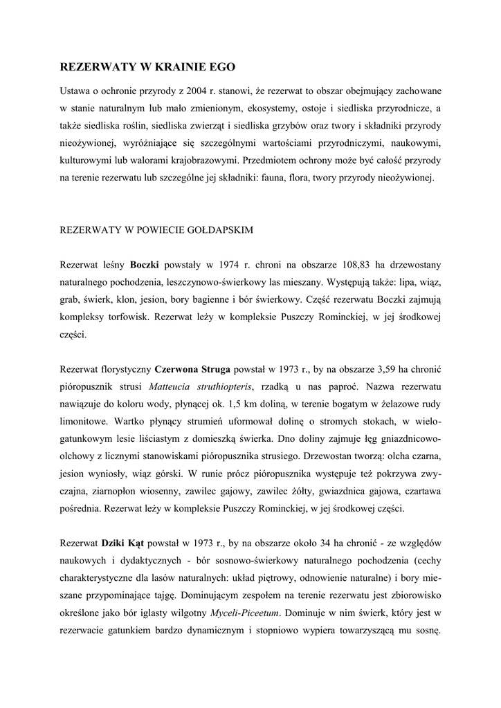 REZERWATY W KRAINIE EGO Ustawa o ochronie przyrody z 2004 r. stanowi, że rezerwat to obszar obejmujący zachowane w stanie naturalnym lub mało zmienionym, ekosystemy, ostoje i siedliska przyrodnicze, a także siedliska roślin, siedliska zwierząt i siedliska grzybów oraz twory i składniki przyrody nieożywionej, wyróżniające się szczególnymi wartościami przyrodniczymi, naukowymi, kulturowymi lub walorami krajobrazowymi. Przedmiotem ochrony może być całość przyrody na terenie rezerwatu lub szczególne jej składniki: fauna, flora, twory przyrody nieożywionej. REZERWATY W POWIECIE GOŁDAPSKIM Rezerwat leśny Boczki powstały w 1974 r. chroni na obszarze 108,83 ha drzewostany naturalnego pochodzenia, leszczynowo-świerkowy las mieszany. Występują także: lipa, wiąz, grab, świerk, klon, jesion, bory bagienne i bór świerkowy. Część rezerwatu Boczki zajmują kompleksy torfowisk. Rezerwat leży w kompleksie Puszczy Rominckiej, w jej środkowej części. Rezerwat florystyczny Czerwona Struga powstał w 1973 r., by na obszarze 3,59 ha chronić pióropusznik strusi Matteucia struthiopteris, rzadką u nas paproć. Nazwa rezerwatu nawiązuje do koloru wody, płynącej ok. 1,5 km doliną, w terenie bogatym w żelazowe rudy limonitowe. Wartko płynący strumień uformował dolinę o stromych stokach, w wielogatunkowym lesie liściastym z domieszką świerka. Dno doliny zajmuje łęg gniazdnicowoolchowy z licznymi stanowiskami pióropusznika strusiego. Drzewostan tworzą: olcha czarna, jesion wyniosły, wiąz górski. W runie prócz pióropusznika występuje też pokrzywa zwyczajna, ziarnopłon wiosenny, zawilec gajowy, zawilec żółty, gwiazdnica gajowa, czartawa pośrednia. Rezerwat leży w kompleksie Puszczy Rominckiej, w jej środkowej części. Rezerwat Dziki Kąt powstał w 1973 r., by na obszarze około 34 ha chronić - ze względów naukowych i dydaktycznych - bór sosnowo-świerkowy naturalnego pochodzenia (cechy charakterystyczne dla lasów naturalnych: układ piętrowy, odnowienie naturalne) i bory mieszane przypominające tajgę. Dominującym zespołem na terenie rezerwatu jest zbiorowisko określone jako bór iglasty wilgotny Myceli-Piceetum. Dominuje w nim świerk, który jest w rezerwacie gatunkiem bardzo dynamicznym i stopniowo wypiera towarzyszącą mu sosnę. Większość drzew ma ponad 180 lat. Rezerwat leży w kompleksie Puszczy Rominckiej, w jej północno-wschodniej części. Rezerwat Mechacz Wielki (powstał w 1974 r.) – to jeden z największych rezerwatów torfowiskowych w Europie, ma powierzchnię 146,72 ha. W słabo wykształconej warstwie krzewów występuje pojedynczo świerk, brzoza omszona i podrost sosny. W runie dominuje wełnianka pochwowata Eriophorum vaginatum, modrzewnica zwyczajna Andromeda polifolia, żurawina błotna, mniej licznie występuje rosiczka okrągłolistna Drosera rotundifolia, żurawina drobnolistkowa, bażyna czarna Empetrum nigrum, malina moroszka. W obrębie torfowiska wysokiego, reprezentującego zespół Sphagnetum magellanici, występują niewielkie płaty zespołów torfowisk mszysto-turzycowych: turzycy bagiennnej i przygiełki białej. Na obwodzie torfowiska występują płaty boru bagiennego, świerczyny na torfach oraz olesu. Rezerwat leży w kompleksie Puszczy Rominckiej, w jej zachodniej części. Rezerwat „Uroczysko Kramnik” (utworzony w 2002 r. na terenie otuliny Parku) to rezerwat leśno-torfowiskowy o powierzchni 75,96 ha, z licznymi stanowiskami rzadkich i reliktowych gatunków roślin. Powołano go głównie dla zachowania i ochrony stanowisk maliny moroszki (Rubus chamaemorus) oraz bagiennych zbiorowisk leśnych. Na jego terenie wyróżniono 227 gatunków roślin naczyniowych. Wśród nich znalazły się m.in.: stokłosa Benekena Bromus benekenii; kukułka Fuchsa Dactylorhiza fuchsii; kukułka krwista Dactylorhiza incarnata; kukułka plamista Dactylorhiza maculata; rosiczka okrągłolistna Drosera rotundifolia; bażyna czarna Empetrum nigrum; kocanki piaskowe Helichrysum arenarium; groszek błotny Lathyrus palustris; bagno zwyczajne Ledum palustre; widłak jałowcowaty Lycopodium annotinum; widłak goździsty Lycopodium clavatum; czworolist pospolity Paris quadrifolia; dziewięciornik błotny Parnassia palustris; biedrzeniec wielki Pimpinella major; podkolan biały Platanthera bifolia; podkolan zielonawy Platanthera chlorantha; malina moroszka Rubus chamaemorus; jeżogłówka najmniejsza Sparganium minimum; czarcikęs łąkowy Succisa pratensis; rutewka orlikolistna Thalictrum aquilegiifolium. Rezerwat leży na wschodniej krawędzi Puszczy Rominckiej. Rezerwat florystyczno-faunistyczny „Żytkiejmska Struga” powstał w 1982 r. Jest bardzo duży, na 467,07 ha zachowuje typowe siedliska Puszczy, reprezentując bogaty zestaw zespołów leśnych z naturalnym ciekiem i obszarami bagiennymi. Z ogólnej – prawie w całości leśnej powierzchni - 91,3 ha zajmują torfowiska. Starodrzew buduje głównie świerk pospolity, sosna zwyczajna, brzoza brodawkowata i omszona, miejscami olsza czarna, oraz jednostkowo dąb szypułkowy, grab, lipa drobnolistna. Bogate jest runo leśne. Rośnie w nim borówka czarna, borówka brusznica, widłak jałowcowaty, sałatnik leśny, turzyca palczasta, skrzyp leśny, kostrzewa olbrzymia. W obniżeniach terenowych występuje niezapominajka błotna i kuklik zwisły. W dolinach, szczególnie w miejscach wysięku wód, a także na obrzeżach Strugi Żytkiejmskiej, wykształciły się płaty łęgu Circaeo-Alnetum. Część gleb torfowych zalegających w dolinie Żytkiejmskiej Strugi porasta bór mieszany torfowcowy. Rezerwat ma interesującą i zróżnicowaną fauną. Występuje tu jeleń, sarna, łoś, dzik, lis, kuna leśna, jenot, borsuk, tchórz, łasica i wilk. W wodach żyje bóbr, wydra i piżmak. Rezerwat leży w kompleksie Puszczy Rominckiej, w jej północno-wschodniej części. REZERWATY W POWIECIE OLECKIM Rezerwat leśny Borki utworzono w 1958 r. w celu zachowania 