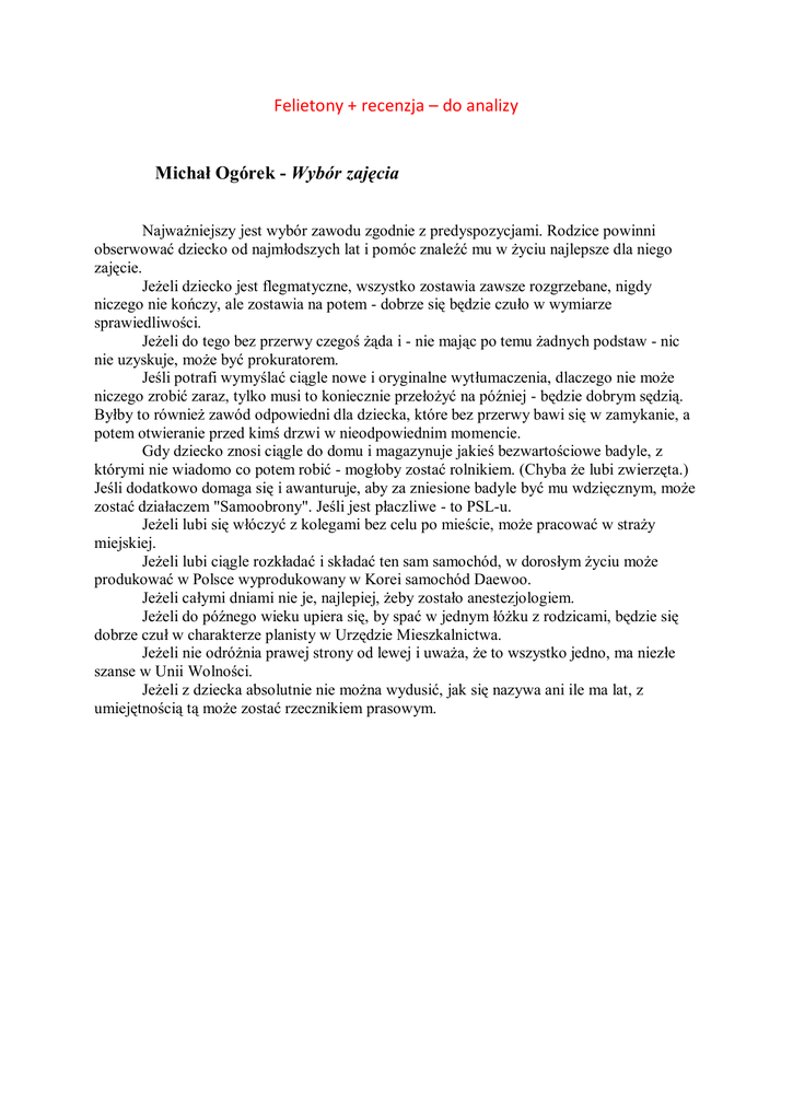Felietony + recenzja – do analizy Michał Ogórek - Wybór zajęcia Najważniejszy jest wybór zawodu zgodnie z predyspozycjami. Rodzice powinni obserwować dziecko od najmłodszych lat i pomóc znaleźć mu w życiu najlepsze dla niego zajęcie. Jeżeli dziecko jest flegmatyczne, wszystko zostawia zawsze rozgrzebane, nigdy niczego nie kończy, ale zostawia na potem - dobrze się będzie czuło w wymiarze sprawiedliwości. Jeżeli do tego bez przerwy czegoś żąda i - nie mając po temu żadnych podstaw - nic nie uzyskuje, może być prokuratorem. Jeśli potrafi wymyślać ciągle nowe i oryginalne wytłumaczenia, dlaczego nie może niczego zrobić zaraz, tylko musi to koniecznie przełożyć na później - będzie dobrym sędzią. Byłby to również zawód odpowiedni dla dziecka, które bez przerwy bawi się w zamykanie, a potem otwieranie przed kimś drzwi w nieodpowiednim momencie. Gdy dziecko znosi ciągle do domu i magazynuje jakieś bezwartościowe badyle, z którymi nie wiadomo co potem robić - mogłoby zostać rolnikiem. (Chyba że lubi zwierzęta.) Jeśli dodatkowo domaga się i awanturuje, aby za zniesione badyle być mu wdzięcznym, może zostać działaczem "Samoobrony". Jeśli jest płaczliwe - to PSL-u. Jeżeli lubi się włóczyć z kolegami bez celu po mieście, może pracować w straży miejskiej. Jeżeli lubi ciągle rozkładać i składać ten sam samochód, w dorosłym życiu może produkować w Polsce wyprodukowany w Korei samochód Daewoo. Jeżeli całymi dniami nie je, najlepiej, żeby zostało anestezjologiem. Jeżeli do późnego wieku upiera się, by spać w jednym łóżku z rodzicami, będzie się dobrze czuł w charakterze planisty w Urzędzie Mieszkalnictwa. Jeżeli nie odróżnia prawej strony od lewej i uważa, że to wszystko jedno, ma niezłe szanse w Unii Wolności. Jeżeli z dziecka absolutnie nie można wydusić, jak się nazywa ani ile ma lat, z umiejętnością tą może zostać rzecznikiem prasowym. Stanisław Dygat - ROZMYŚLANIA PRZY GOLENIU Mój przyjaciel kupił sobie pieska. Niósł w koszyczku przemiłe puchate stworzonko i cieszył się na myśl o tym, jaką radość sprawi w domu dzieciom. Spotkał znajomego, który zatrzymał go i powiedział: - 0, piesek. - Właśnie - potwierdził mój przyjaciel z uśmiechem, pogłaskał pieska po pyszczku i pociągnął go za uszko, a piesek ziewnął wyciągając różowy języczek. Znajomy zmarszczył się i spoważniał: - Bardzo mi się nie podoba, że on tak ziewa - powiedział. - Czemu niby? - Szczeniak w tym wieku, a oceniam go na siedem tygodni, ja znam się na tym, nie powinien ziewać w taki sposób. - W jaki mianowicie? - Właśnie w taki. Nie uchowa się panu. Czy pan wie przynajmniej, od kogo pan go kupił? - No, osobiście bliżej go nie znam. - Mój panie - krzyknął znajomy - jak można kupować psy od nieznajomych osób! - Ja ... - Jest pan człowiekiem nieodpowiedzialnym. Ten pies długo nie pożyje. Niech sobie pan przypomni w odpowiednim momencie, że ja to panu przepowiedziałem. W drodze do domu mój przyjaciel spotkał jeszcze wielu znajomych, którzy zatrzymywali go z powodu pieska. Każdy miał w tej sprawie coś do powiedzenia, a wszyscy oceniali sytuację pesymistycznie: że pies ma pchły i parchy, że dostanie nosacizny, że zarazi dzieci papuzią chorobą, że będzie zły i wszystkich pogryzie, że ma początki wścieklizny, że oślepnie, że ogłuchnie, że pokrzywią mu się nogi, że powypadają mu zęby. Leon Pasternak, znany przyjaciel zwierząt, nie powiedział nic, tylko zaczął płakać i złorzecząc pobiegł na skargę do Towarzystwa Opieki nad Zwierzętami. Jednocześnie wszyscy nie szczędzili oczywiście dobrych rad i jeżeli jeden z napotkanych znajomych zalecał karmienie pieska mlekiem i fasolą, a broń Boże nie kaszą i mięsem, to można było przyjąć za pewnik, iż następny zaleci coś przeciwnego. Mógłbym rzecz zakończyć w ten sposób, iż mój przyjaciel wściekł się w końcu i z rozpaczliwym ujadaniem pogryzł znajomych, ale nie uczynię tego, ponieważ pod wpływem surowych zaleceń naszej krytyki zerwałem z groteską. Zresztą przyjaciel mój jest człowiekiem pogodnym, pomyślał sobie tylko: "pies was drapał", i poszedł spokojnie do domu. Jest jednak u nas rzeczą niemożliwą do wytrzymania to natarczywe wtrącanie się ludzi do spraw prywatnych innych. Jeżeli kupisz sobie nowy krawat, ożenisz się, postanowisz zmienić życie, jeżeli wybierasz się na wakacje nad morze, zamierzasz rozegrać partię brydża albo chcesz kupić sobie wiatrówkę, dziesiątki znajomych, których czasem ledwie znasz, poddadzą twoje zamysły krytyce i udzielać ci będą dobrych rad. Na ogół nic ich nie obchodzi twoje życie i nie obchodzisz ich ty sam, a jeżeli przypadkiem rzeczywiście potrzebowałbyś jakiejś realnej pomocy, uciekną od ciebie. Ale czysta, bezinteresowna namiętność do wtrącania się w cudze sprawy wzmaga ich samopoczucie i znakomicie wypełnia im życiową pustkę wynikającą z nieróbstwa i braku własnego wewnętrznego życia. Znajomy przebywający stale w Anglii opowiadał mi, że gdy zapytał pewnego Anglika mieszkającego od czterdziestu lat w tym samym mieszkaniu, kto mieszka obok niego, ten mu odpowiedział: - Z lewej strony - nie wiem, a z prawej, zdaje mi się, że jakiś lekarz. Uznałbym to za pewną przesadę, gdybym nie był przekonany, że Anglik ów dał mojemu przyjacielowi do zrozumienia w ten taktowny sposób, że nie należy się interesować zbytnio nie swoimi sprawami. Magdalena Miecznicka Stało się! Dorota Masłowska napisała drugą książkę: Paw królowej. Świetną. Język Pawia królowej jest tak znakomity, że czytelnik obdarzony słuchem literackim poczuje skurcz w żołądku: każde słowo tej 150-stronicowej powieści jest na swoim miejscu. Ale czas już zadać 22-letniej pisarce kilka pytań. Już w Wojnie polsko-ruskiej... pokazała, że ma ucho do współczesnej muzyki. Tym ra
