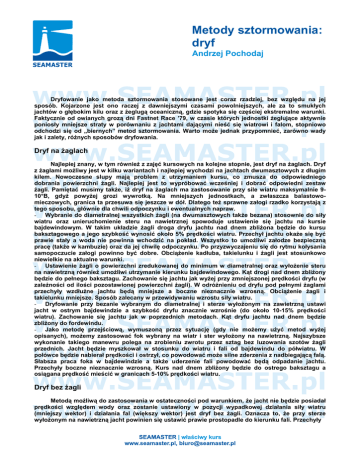 Metody sztormowania: dryf Andrzej Pochodaj Dryfowanie jako metoda sztormowania stosowane jest coraz rzadziej, bez względu na jej sposób. Kojarzone jest ono raczej z dawniejszymi czasami powolniejszych, ale za to smukłych jachtów o głębokim kilu oraz z żeglugą oceaniczną, gdzie spotyka się częściej ekstremalne warunki. Faktycznie od owianych grozą dni Fastnet Race ’79, w czasie których jednostki żeglujące aktywnie poniosły mniejsze straty w porównaniu z jachtami dającymi nieść się wiatrowi i falom, stopniowo odchodzi się od „biernych” metod sztormowania. Warto może jednak przypomnieć, zarówno wady jak i zalety, różnych sposobów dryfowania. Dryf na żaglach Najlepiej znany, w tym również z zajęć kursowych na kolejne stopnie, jest dryf na żaglach. Dryf z żaglami możliwy jest w kilku wariantach i najlepiej wychodzi na jachtach dwumasztowych z długim kilem. Nowoczesne slupy mają problem z utrzymaniem kursu, co zmusza do odpowiedniego dobrania powierzchni żagli. Najlepiej jest to wypróbować wcześniej i dobrać odpowiedni zestaw żagli. Pamiętać musimy także, iż dryf na żaglach ma zastosowanie przy sile wiatru maksymalnie 910°B, gdyż powyżej grozi wywrotką. Na mniejszych jednostkach, a zwłaszcza balastowomieczowych, granica ta przesuwa się jeszcze w dół. Dlatego też sprawne załogi rzadko korzystają z tego sposobu, głównie dla chwili odpoczynku i ewentualnych napraw. - Wybranie do diametralnej wszystkich żagli (na dwumasztowych także bezana) stosownie do siły wiatru oraz unieruchomienie steru na nawietrznej spowoduje ustawienie się jachtu na kursie bajdewindowym. W takim układzie żagli droga dryfu jachtu nad dnem zbliżona będzie do kursu baksztagowego a jego szybkość wynosić około 5% prędkości wiatru. Przechył jachtu okaże się być prawie stały a woda nie powinna wchodzić na pokład. Wszystko to umożliwi załodze bezpieczną pracę (także w kambuzie) oraz da jej chwilę odpoczynku. Po przyzwyczajeniu się do rytmu kołysania samopoczucie załogi powinno być dobre. Obciążenie kadłuba, takielunku i żagli jest stosunkowo niewielkie na aktualne warunki. - Ustawienie żagli o powierzchni zredukowanej do minimum w diametralnej oraz wyłożenie steru na nawietrzną również umożliwi utrzymanie kierunku bajdewindowego. Kąt drogi nad dnem zbliżony będzie do pełnego baksztagu. Zachowanie się jachtu jak wyżej przy zmniejszonej prędkości dryfu (w zależności od ilości pozostawionej powierzchni żagli). W odróżnieniu od dryfu pod pełnymi żaglami przechyły wzdłużne jachtu będą mniejsze a boczne nieznacznie wzrosną. Obciążenie żagli i takielunku mniejsze. Sposób zalecany w przewidywaniu wzrostu siły wiatru. - Dryfowanie przy bezanie wybranym do diametralnej i sterze wyłożonym na zawietrzną ustawi jacht w ostrym bajdewindzie a szybkość dryfu znacznie wzrośnie (do około 10-15% prędkości wiatru). Zachowanie się jachtu jak w poprzednich metodach. Kąt dryfu jachtu nad dnem będzie zbliżony do fordewindu. - Jako metodę przejściową, wymuszoną przez sytuację (gdy nie możemy użyć metod wyżej opisanych), możemy zastosować fok wybrany na wiatr i ster wyłożony na nawietrzną. Najszybsze wykonanie takiego manewru polega na zrobieniu zwrotu przez sztag bez luzowania szotów żagli przednich. Jacht będzie myszkował w stosunku do wiatru i fali od bajdewindu do półwiatru. W połówce będzie nabierał prędkości i ostrzył, co powodować może silne zderzenia z nadbiegającą falą. Słabsza praca foka w bajdewindzie a także uderzenie fali powodować będą odpadanie jachtu. Przechyły boczne nieznacznie wzrosną. Kurs nad dnem zbliżony będzie do ostrego baksztagu a osiągana prędkość mieścić w granicach 5-10% prędkości wiatru. Dryf bez żagli Metodą możliwą do zastosowania w ostateczności pod warunkiem, że jacht nie będzie posiadał prędkości względem wody oraz zostanie ustawiony w pozycji wypadkowej działania siły wiatru (mniejszy wektor) i działania fal (większy wektor) jest dryf bez żagli. Oznacza to, że przy sterze wyłożonym na nawietrzną jacht powinien się ustawić prawie prostopadle do kierunku fali. Przechyły będą znaczne lecz łagodzone dryfem i strugami wody opływającymi kadłub. Na jachcie powinna być przygotowana do zastosowania jakaś siła napędowa (silnik, żagle) na wypadek gdyby jacht zaczął wchodzić w rezonans z falą. Sposób bardzo uciążliwy dla załogi i niezbyt bezpieczny w przypadku wysokich fal (grozi wywrotką przez burtę). Na awarie narażone jest wtedy szczególnie urządzenie sterowe. Dryfkotwa Dla wielu żeglarzy znaną tylko z lektury, niemalże szamańską metodą jest sztormowanie z dryfkotwą. Wielu z nas nawet pewnie nie wie jak rozłożyć i umieścić za burtą ów tajemniczy worek „gnijący” zwykle gdzieś w zakamarkach jachtu a wciąż wymagany przez PRS. Ale to temat na osobny artykuł. Zasadniczo zadaniem tego urządzenia jest utrzymanie (poprzez stawiany opór) jachtu względem nadbiegającej fali i wiatru. Stąd inna nazwa dryfkotwy – pływająca kotwica. Jeśli już dryfujemy z dryfkotwą, to zwykle umieszczamy ją za rufą co możliwe jest do zastosowania na wszystkich jachtach. Wtedy też, większość nieprzyjemnych zjawisk występuje w znacznie mniejszym stopniu niż przy dryfkotwie z dziobu. Jacht ustawia się zwykle w pełnym baksztagu lewego halsu co powoduje dosyć znaczne przechyły boczne. Nawet przy źle dobranej długości liny fala nie powinna jednak wchodzić na pokład. Szybkość dryfu wynosi około 10% prędkości wiatru. Dryfkotwa z dziobu możliwa jest do zastosowania gdy: jacht jest dwumasztowy, kształt kadłuba zapewnia nawietrzność, fale posiadają wyrównaną długość, a długość liny dryfkotwy jest tak dobrana, aby w jednym czasie dryfkotwa i dziób jachtu znajdowały się na wierzchołku fali. Z tego też powodu na akwenach, gdzie fala jest stosunkowo krótka 