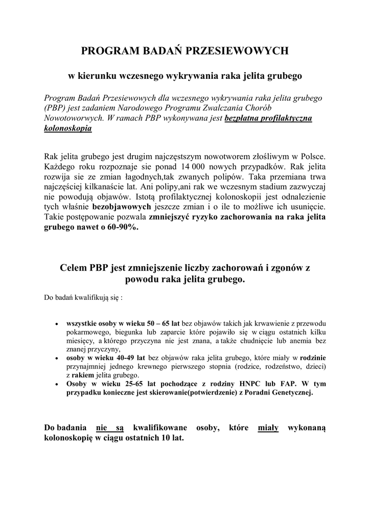 PROGRAM BADAŃ PRZESIEWOWYCH w kierunku wczesnego wykrywania raka jelita grubego Program Badań Przesiewowych dla wczesnego wykrywania raka jelita grubego (PBP) jest zadaniem Narodowego Programu Zwalczania Chorób Nowotoworwych. W ramach PBP wykonywana jest bezpłatna profilaktyczna kolonoskopia Rak jelita grubego jest drugim najczęstszym nowotworem złośliwym w Polsce. Każdego roku rozpoznaje sie ponad 14 000 nowych przypadków. Rak jelita rozwija sie ze zmian łagodnych,tak zwanych polipów. Taka przemiana trwa najczęściej kilkanaście lat. Ani polipy,ani rak we wczesnym stadium zazwyczaj nie powodują objawów. Istotą profilaktycznej kolonoskopii jest odnalezienie tych właśnie bezobjawowych jeszcze zmian i o ile to możliwe ich usunięcie. Takie postępowanie pozwala zmniejszyć ryzyko zachorowania na raka jelita grubego nawet o 60-90%. Celem PBP jest zmniejszenie liczby zachorowań i zgonów z powodu raka jelita grubego. Do badań kwalifikują się : wszystkie osoby w wieku 50 – 65 lat bez objawów takich jak krwawienie z przewodu pokarmowego, biegunka lub zaparcie które pojawiło się w ciągu ostatnich kilku miesięcy, a którego przyczyna nie jest znana, a także chudnięcie lub anemia bez znanej przyczyny, osoby w wieku 40-49 lat bez objawów raka jelita grubego, które miały w rodzinie przynajmniej jednego krewnego pierwszego stopnia (rodzice, rodzeństwo, dzieci) z rakiem jelita grubego. Osoby w wieku 25-65 lat pochodzące z rodziny HNPC lub FAP. W tym przypadku konieczne jest skierowanie(potwierdzenie) z Poradni Genetycznej. Do badania nie są kwalifikowane kolonoskopię w ciągu ostatnich 10 lat. osoby, które miały wykonaną Na kolonoskopię profilaktyczną można zapisać się po wypełnieniu ankiety (będącej jednocześnie skierowaniem) i zakwalifikowaniu do badania przez lekarza. Ankieta może być wypełniona samodzielnie lub przez lekarza każdej specjalności. Badanie jest wykonywane w Zakładzie Panendoskopii Świętokrzyskiego Centrum Onkologii (poziom -1,tel 41 3674370).