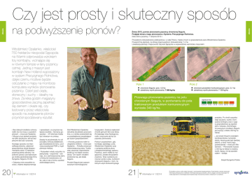 na podwyższenie plonów? zboża zboża Czy jest prosty i skuteczny sposób Żniwa 2013, pomiar plonowania pszenicy chronionej Seguris. Podgląd ekranu mapy plonowania z Systemu Precyzyjnego Rolnictwa. Data zbioru pszenicy: 7 sierpnia 2013 r. Prowadzone doświadczenia wielkopolowe, w całej Polsce, między innymi w gospodarstwie pana Włodzimierza Opalanko. Powierzchnia plantacji, na której przeprowadzono doświadczenie: 7,4 ha Lokalizacja plantacji: miejscowość Gaj koło Sępopola w województwie warmińsko‑mazurskim Włodzimierz Opalanko, właściciel 750 hektarów nieopodal Sępopola na Warmii odprowadza wzrokiem trzy kombajny, wcinające się w równym tempie w łany pszenicy ozimej. Jedną z maszyn jest kombajn New Holland wyposażony w system Precyzyjnego Rolnictwa, dzięki czemu możliwe będzie odczytanie z mapy na monitorze komputera wyników plonowania pszenicy. Dzień jest ciepły, słoneczny i suchy – idealny na żniwa. Za kilka godzin magazyny gospodarstwa zaczną zapełniać się ziarnem i okaże się, czy testowany przez właściciela sposób na zwiększenie plonów przyniósł spodziewany rezultat. – Bez dobrych środków ochrony roślin nie ma mowy o wysokich plonach – mówi pan Opalanko. – Muszą to być jednak produkty nie tylko skuteczne, ale też bezpieczne dla ludzi i przyrody. Szukając sposobu na intensyfikację zbiorów, właściciel gospodarstwa obsiał eksperymentalnie około 10 hektarów pszenicą jednej odmiany i na połowie uprawy użył najnowszego środka grzybobójczego firmy Syngenta: Seguris 215 SC. – Ciekawią mnie wszystkie nowości, chętnie eksperymentuję 20 informator nr 1/2014 i sprawdzam, co przynosi najlepsze rezultaty – tłumaczy gospodarz. – W rolnictwie trzeba być otwartym na zmiany. Pole 1 ••chronione Seguris: pow. 4,3 ha ••uśredniony wynik plonowania: 7 508 kg/ha ••chronione produktem konkurencyjnym: pow. 3,1 ha ••uśredniony wynik plonowania: 7 159 kg/ha Przewaga plonowania pszenicy na polu chronionym Seguris, w porównaniu do pola traktowanym produktem konkurencyjnym wyniosła 349 kg/ha. Dziś Włodzimierz Opalanko zatrudnia dwudziestu pracowników, a z rolnika przekształcił się w przedsiębiorcę zarządzającego dużym gospodarstwem. fungicydem. Zwalcza większość chorób górnych liści oraz kłosa. Zmniejszając stres fizjologiczny roślin, przyczynia się też do poprawy plonowania. – Choroby grzybowe roślin to utrapienie rolników – mówi pan Opalanko. – Potrafią zniweczyć wielomiesięczną pracę. Trzeba więc stosować odpowiednie – Postawiłem wtedy wszystko na środki już na etapie wzrostu jedną kartę – wspomina – wiezboża. Tym razem chciałem rząc, że z zachwaszczonej ziemi, przekonać się, jak działa w którą nie inwestowano od Seguris. lat, uda mi się w końcu uzyskać zadowalające plony. Produkt Seguris jest zaawansowanym technologicznie Późnym popołudniem, gdy kombajny zjeżdżają z pola, Włodzimierz Opalanko wraz z zarządcą podlicza plony z eksperymentalnego zasiewu. Pszenica, zanim trafiła do magazynów, została skrupulatnie zważona. Teraz wystarczy porównać wyniki z pola, na którym stosowano Seguris, z tymi, na których użyto konkurencyjnego Zasady te przyświecały mu od początku rolniczej działalności, gdy dwadzieścia lat temu, podczas prywatyzacji PGR-u, kupił pierwsze hektary. Pole 2 Legenda [w t/ha] 8,4-61,0 7,9-8,3 7,6-7,8 7,3-7,5 6,8-7,2 0,1-6,7 produktu. Po chwili wszystko staje się jasne, wyniki z komputera kombajnu oraz z wagi w gospodarstwie są zgodne: plon z obszaru chronionego innowacyjnym środkiem Seguris jest wyższy o blisko 350 kg na hektar. – Już przed żniwami oceniałem kondycję kłosów na bardzo dobrą, wiosną pole było bardziej zielone, a teraz mamy tego potwierdzenie – mówi pan Włodzimierz. – Plonowanie wyższe o 350 kg na hektar to świetny wynik, lepszy, niż się spodziewałem – dodaje. Zespół Syngenta Polska 21 informator nr 1/2014 Ze środków ochrony roślin należy korzystać z zachowaniem bezpieczeństwa. Przed każdym użyciem przeczytaj informacje zamieszczone w etykiecie i informacje dotyczące produktu. Zwróć uwagę na zwroty wskazujące na rodzaj zagrożenia i przestrzegaj zasad bezpiecznego stosowania produktu wskazanych na etykiecie.