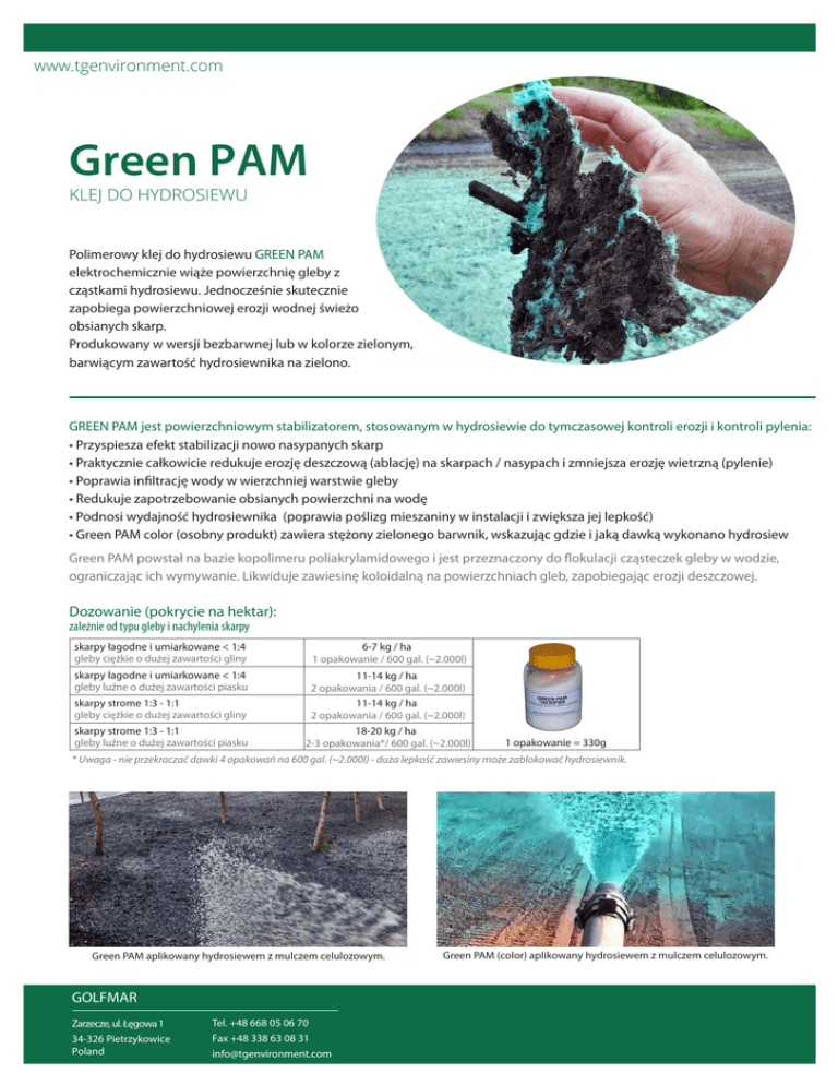 www.tgenvironment.com Green PAM KLEJ DO HYDROSIEWU Polimerowy klej do hydrosiewu GREEN PAM elektrochemicznie wiąże powierzchnię gleby z cząstkami hydrosiewu. Jednocześnie skutecznie zapobiega powierzchniowej erozji wodnej świeżo obsianych skarp. Produkowany w wersji bezbarwnej lub w kolorze zielonym, barwiącym zawartość hydrosiewnika na zielono. GREEN PAM jest powierzchniowym stabilizatorem, stosowanym w hydrosiewie do tymczasowej kontroli erozji i kontroli pylenia: • Przyspiesza efekt stabilizacji nowo nasypanych skarp • Praktycznie całkowicie redukuje erozję deszczową (ablację) na skarpach / nasypach i zmniejsza erozję wietrzną (pylenie) • Poprawia infiltrację wody w wierzchniej warstwie gleby • Redukuje zapotrzebowanie obsianych powierzchni na wodę • Podnosi wydajność hydrosiewnika (poprawia poślizg mieszaniny w instalacji i zwiększa jej lepkość) • Green PAM color (osobny produkt) zawiera stężony zielonego barwnik, wskazując gdzie i jaką dawką wykonano hydrosiew Green PAM powstał na bazie kopolimeru poliakrylamidowego i jest przeznaczony do flokulacji cząsteczek gleby w wodzie, ograniczając ich wymywanie. Likwiduje zawiesinę koloidalną na powierzchniach gleb, zapobiegając erozji deszczowej. Dozowanie (pokrycie na hektar): zależnie od typu gleby i nachylenia skarpy skarpy łagodne i umiarkowane < 1:4 gleby ciężkie o dużej zawartości gliny 6-7 kg / ha 1 opakowanie / 600 gal. (~2.000l) skarpy łagodne i umiarkowane < 1:4 gleby luźne o dużej zawartości piasku skarpy strome 1:3 - 1:1 gleby ciężkie o dużej zawartości gliny 11-14 kg / ha 2 opakowania / 600 gal. (~2.000l) 11-14 kg / ha 2 opakowania / 600 gal. (~2.000l) skarpy strome 1:3 - 1:1 gleby luźne o dużej zawartości piasku 18-20 kg / ha 2-3 opakowania*/ 600 gal. (~2.000l) 1 opakowanie = 330g * Uwaga - nie przekraczać dawki 4 opakowań na 600 gal. (~2.000l) - duża lepkość zawiesiny może zablokować hydrosiewnik. Green PAM aplikowany hydrosiewem z mulczem celulozowym. GOLFMAR Zarzecze, ul. Łęgowa 1 34-326 Pietrzykowice Poland Tel. +48 668 05 06 70 Fax +48 338 63 08 31 [email protected] Green PAM (color) aplikowany hydrosiewem z mulczem celulozowym.