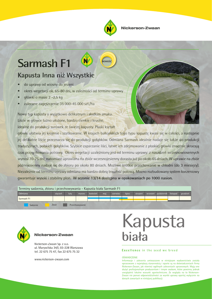 Sarmash F1 NOWOŚĆ Kapusta Inna niż Wszystkie • do uprawy od wiosny do jesieni • okres wegetacji ok. 65-80 dni, w zależności od terminu uprawy • główki o masie 2 -2,5 kg • zalecane zagęszczenie 35 000-45 000 szt./ha Nowy typ kapusty o wyjątkowo delikatnym i słodkim smaku. Liście w główce luźno ułożone, bardzo cienkie i kruche, idealne do produkcji surówek ze świeżej kapusty. Płaski kształt główki ułatwia jej krojenie i szatkowanie. W krajach bałkańskich tego typu kapustę kwasi się w całości, a następnie jej delikatne liście przeznacza się do produkcji gołąbków. Odmiana Sarmash idealnie nadaje się także do produkcji tradycyjnych, polskich gołąbków. Szybkie zaparzanie liści, łatwe ich zdejmowanie z płaskiej główki znacznie skracają czas przygotowania potrawy. Okres wegetacji uzależniony jest od terminu uprawy: z nasadzeń wczesnowiosennych wynosi 70-75 dni, natomiast uprawiana na zbiór wczesnojesienny dorasta już po około 65 dniach. W uprawie na zbiór późnojesienny nadaje się do zbioru po około 80 dniach. Możliwe krótkie przechowanie w chłodni (do 3 miesięcy). Niezależnie od terminu uprawy odmiana ma bardzo dobrą trwałość polową. Mocno rozbudowany system korzeniowy gwarantuje wysoki i stabilny plon. W sezonie 13/14 dostępna w opakowaniach po 1000 nasion. Terminy sadzenia, zbioru i przechowywania - Kapusta biała Sarmash F1 Odmiana styczeń luty marzec kwiecień maj czerwiec lipiec sierpień wrzesień październik listopad grudzień Sarmash F1 Sadzenie Zbiór Przechowywanie Kapusta Nickerson-Zwaan Sp. z o.o. ul. Marywilska 34/I, 03-228 Warszawa tel. 22 675 75 47, fax 22 675 75 32 www.nickerson-zwaan.com biała OŚWIADCZENIE Informacje i zalecenia umieszczone w niniejszym wydawnictwie zostały opracowane z największą starannością i oparte są na doświadczeniach firmy Nickerson-Zwaan, jak również ogólnych zaleceniach uprawowych. Mają one służyć profesjonalnym producentom i innym osobom, które powinny jednak uwzględnić lokalne warunki agrotechniczne. Ze względu na to NickersonZwaan nie ponosi odpowiedzialności za wyniki uprawy opartej wyłącznie na danych zawartych w niniejszej publikacji.
