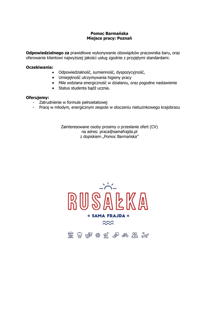 Pomoc Barmańska Miejsce pracy: Poznań Odpowiedzialnego za prawidłowe wykonywanie obowiązków pracownika baru, oraz oferowanie klientowi najwyższej jakości usług zgodnie z przyjętymi standardami. Oczekiwania: Odpowiedzialność, sumienność, dyspozycyjność, Umiejętność utrzymywania higieny pracy Mile widziana energiczność w działaniu, oraz pogodne nastawienie Status studenta bądź ucznia. Oferujemy: - Zatrudnienie w formule pełnoetatowej - Pracę w młodym, energicznym zespole w otoczeniu nietuzinkowego krajobrazu Zainteresowane osoby prosimy o przesłanie ofert (CV) na adres: [email protected] z dopiskiem „Pomoc Barmańska”