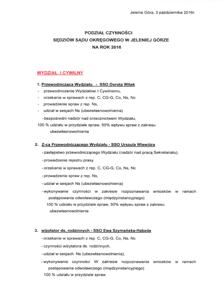 Jelenia Góra, 3 października 2016r. PODZIAŁ CZYNNOŚCI SĘDZIÓW SĄDU OKRĘGOWEGO W JELENIEJ GÓRZE NA ROK 2016 W YDZIAŁ I CYWILNY 1. Przewodnicząca Wydziału - SSO Dorota Witek - przewodniczenie Wydziałowi I Cywilnemu, - orzekanie w sprawach z rep. C, CG-G, Co, Ns, Nc - prowadzenie spraw z rep. Ns, - udział w sesjach Ns (ubezwłasnowolnienia) -bezpośredni nadzór nad orzecznictwem Wydziału, 100 % udziału w przydziale spraw, 50% wpływu spraw z zakresu ubezwłasnowolnienia 2, Z-ca Przewodniczącego Wydziału - SSO Urszula Wiewióra -zastępstwo przewodniczącego Wydziału (nadzór nad pracą Sekretariatu), - prowadzenie rejestru prasy -orzekanie w sprawach z rep. C, CG-G, Co, Ns, Nc -prowadzenie spraw z rep. Ns, -udział w sesjach Ns (ubezwłasnowolnienia) -wykonywanie czynności w zakresie rozpoznawania wniosków w ramach w ramach postępowania odwoławczego (międzyinstancyjnego) 100 % udziału w przydziale spraw, 50% wpływu spraw z zakresu ubezwłasnowolnienia 3. wizytator ds. rodzinnych - SSO Ewa Szymańska-Habzda -orzekanie w sprawach z rep. C, CG-G, Co, Ns, Nc -czynności wizytatora ds. rodzinnych, - udział w sesjach Ns (ubezwłasnowolnienia), -wykonywanie czynności W zakresie rozpoznawania wniosków postępowania odwoławczego (międzyinstancyjnego) 100 % udziału w przydziale spraw 4. SSO Robert Rydzewski -orzekanie sprawach z rep. C, CG-G, Co, Ns,Nc -udział w sesjach Ns (ubezwłasnowolnienia) -wykonywanie czynności w zakresie rozpoznawania wniosków w ramach wniosków w ramach wniosków w ramach wniosków w ramach postępowania odwoławczego (międzyinstancyjnego) 100 % udziału w przydziale spraw 5. SSO Ewa Byik -orzekanie sprawach z rep. C, CG-G, Co, Ns,Nc - udział w sesjach Ns (ubezwłasnowolnienia) -wykonywanie czynności w zakresie rozpoznawania postępowania odwoławczego (międzyinstancyjnego) 100 % udziału w przydziale spraw 6. SSO Agnieszka Wiercińska - Bałaga - orzekanie sprawach z rep. C, CG-G, Co, Ns,Nc -udział w sesjach Ns (ubezwłasnowolnienia) -wykonywanie czynności w zakresie rozpoznawania postępowania odwoławczego (międzyinstancyjnego) 100 % udziału w przydziale spraw 7. SSO Tomasz Sproch - orzekanie sprawach z rep. C, CG-G, Co, Ns,Nc - udział w sesjach Ns (ubezwłasnowolnienia) - wykonywanie czynności w zakresie rozpoznawania postępowania odwoławczego (międzyinstancyjnego) 100 % udziału w przydziale spraw W YDZIAŁ II CYWILNY ODWOŁAWCZY 1. Przewodniczący Wydziału - SSO Piotr Gregier -wykonywanie określonych w Regulaminie czynności przewodniczącego wydziału, w zakresie ustalonym w wewnętrznym podziale czynności z zastępcą przewodniczącego wydziału 2 -orzekanie w sprawach Ca, stosownie do potrzeb Wydziału, co najmniej 50% udział w przydziale wpływających spraw -rozpoznawanie spraw zażaleniowych przydzielonych wg systemu numerkowego -rozpoznawanie spraw wieczystoksięgowych, uproszczonych i ze skargi na przewlekłość postępowania na posiedzeniach niejawnych - w kolejności ustalonej według listy wszystkich sędziów orzekających w Wydziale -wykonywanie innych obowiązków wynikających z Prawa o ustroju sądów powszechnych 2. Zastępca Przewodniczącego Wydziału - SSO Alicja Izydorczyk - zastępstwo przewodniczącego wydziału i wykonywanie czynności w zakresie ustalonym w wewnętrznym podziale czynności z przewodniczącym wydziału - orzekanie w sprawach Ca, stosownie do potrzeb Wydziału, co najmniej 90% udziału w przydziale spraw - rozpoznawanie spraw zażaleniowych przydzielonych wg systemu numerkowego - rozpoznawanie spraw wieczystoksięgowych, uproszczonych i ze skargi na przewlekłość postępowania na posiedzeniach niejawnych - w kolejności ustalonej według listy wszystkich sędziów orzekających w Wydziale - wykonywanie innych obowiązków wynikających z Prawa o ustroju sądów Powszechnych 3. Prezes Sadu Okręgowego w Jeleniej Górze - SSO Wojciech Damaszko - orzekanie w sprawach Ca, stosownie do potrzeb Wydziału, co najmniej 25% udział w przydziale wpływających spraw - rozpoznawanie spraw zażaleniowych przydzielonych wg systemu numerkowego - rozpoznawanie spraw wieczystoksięgowych, uproszczonych na posiedzeniach niejawnych - w kolejności ustalonej według listy wszystkich sędziów orzekających w Wydziale - wykonywanie innych obowiązków wynikających z Prawa o ustroju sądów powszechnych 3 4. Wizytator ds. cywilnych - SSO Beata Glazar - orzekanie w sprawach Ca, stosownie do potrzeb Wydziału, co najmniej 50% udziału w przydziale wpływających do wydziału spraw -rozpoznawanie spraw zażaleniowych przydzielonych wg systemu numerkowego -rozpoznawanie spraw wieczystoksięgowych, przewlekłość postępowania uproszczonych i ze skargi na na posiedzeniach niejawnych - w kolejności ustalonej według listy wszystkich sędziów orzekających w Wydziale -wykonywanie innych obowiązków wynikających z Prawa o ustroju sądów powszechnych -rozpatrywanie skarg dotyczących spraw cywilnych - czynności wizytatora ds. cywilny 5. Wizytator ds. egzekucyjnych - SSO Beata Kostaś orzekanie w sprawach Ca, stosownie do potrzeb Wydziału, co najmniej 50% udziału w przydziale wpływających do wydziału spraw rozpoznawanie spraw zażaleniowych przydzielonych wg systemu numerkowego rozpoznawanie spraw wieczystoksięgowych, uproszczonych i ze skargi na przewlekłość postępowania na posiedzeniach niejawnych - w kolejności ustalonej według listy wszystkich sędziów orzekających w Wydziale - wykonywanie innych obowiązków wynikających z Prawa o ustroju sądów powszechnych rozpatrywanie skarg dotyczących spraw egzekucyjnych - czynności wizytatora ds. egzekucyjnych 6. SSO Sylwia Bańka- Mrozewska orzekanie w sprawach Ca, stosownie do potrzeb Wydziału do 100% udziału w przydziale wpływających do wydziału spraw rozpoznawanie spraw zażaleniowych przydzielonych wg systemu numerkowego rozpoznawanie spraw wieczystoksięgowych, uproszczonych i ze skargi na przewlekłość postępowania na po