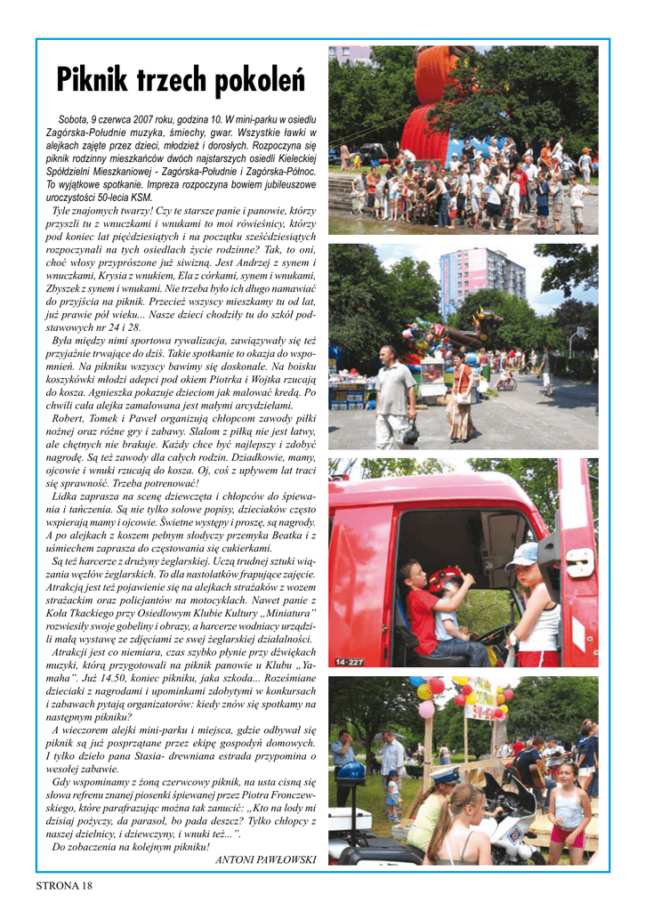 Piknik trzech pokoleń Sobota, 9 czerwca 2007 roku, godzina 10. W mini-parku w osiedlu Zagórska-Południe muzyka, śmiechy, gwar. Wszystkie ławki w alejkach zajęte przez dzieci, młodzież i dorosłych. Rozpoczyna się piknik rodzinny mieszkańców dwóch najstarszych osiedli Kieleckiej Spółdzielni Mieszkaniowej - Zagórska-Południe i Zagórska-Północ. To wyjątkowe spotkanie. Impreza rozpoczyna bowiem jubileuszowe uroczystości 50-lecia KSM. Tyle znajomych twarzy! Czy te starsze panie i panowie, którzy przyszli tu z wnuczkami i wnukami to moi rówieśnicy, którzy pod koniec lat pięćdziesiątych i na początku sześćdziesiątych rozpoczynali na tych osiedlach życie rodzinne? Tak, to oni, choć włosy przyprószone już siwizną. Jest Andrzej z synem i wnuczkami, Krysia z wnukiem, Ela z córkami, synem i wnukami, Zbyszek z synem i wnukami. Nie trzeba było ich długo namawiać do przyjścia na piknik. Przecież wszyscy mieszkamy tu od lat, już prawie pół wieku... Nasze dzieci chodziły tu do szkół podstawowych nr 24 i 28. Była między nimi sportowa rywalizacja, zawiązywały się też przyjaźnie trwające do dziś. Takie spotkanie to okazja do wspomnień. Na pikniku wszyscy bawimy się doskonale. Na boisku koszykówki młodzi adepci pod okiem Piotrka i Wojtka rzucają do kosza. Agnieszka pokazuje dzieciom jak malować kredą. Po chwili cała alejka zamalowana jest małymi arcydziełami. Robert, Tomek i Paweł organizują chłopcom zawody piłki nożnej oraz różne gry i zabawy. Slalom z piłką nie jest łatwy, ale chętnych nie brakuje. Każdy chce być najlepszy i zdobyć nagrodę. Są też zawody dla całych rodzin. Dziadkowie, mamy, ojcowie i wnuki rzucają do kosza. Oj, coś z upływem lat traci się sprawność. Trzeba potrenować! Lidka zaprasza na scenę dziewczęta i chłopców do śpiewania i tańczenia. Są nie tylko solowe popisy, dzieciaków często wspierają mamy i ojcowie. Świetne występy i proszę, są nagrody. A po alejkach z koszem pełnym słodyczy przemyka Beatka i z uśmiechem zaprasza do częstowania się cukierkami. Są też harcerze z drużyny żeglarskiej. Uczą trudnej sztuki wiązania węzłów żeglarskich. To dla nastolatków frapujące zajęcie. Atrakcją jest też pojawienie się na alejkach strażaków z wozem strażackim oraz policjantów na motocyklach. Nawet panie z Koła Tkackiego przy Osiedlowym Klubie Kultury „Miniatura” rozwiesiły swoje gobeliny i obrazy, a harcerze wodniacy urządzili małą wystawę ze zdjęciami ze swej żeglarskiej działalności. Atrakcji jest co niemiara, czas szybko płynie przy dźwiękach muzyki, którą przygotowali na piknik panowie u Klubu „Yamaha”. Już 14.50, koniec pikniku, jaka szkoda... Roześmiane dzieciaki z nagrodami i upominkami zdobytymi w konkursach i zabawach pytają organizatorów: kiedy znów się spotkamy na następnym pikniku? A wieczorem alejki mini-parku i miejsca, gdzie odbywał się piknik są już posprzątane przez ekipę gospodyń domowych. I tylko dzieło pana Stasia- drewniana estrada przypomina o wesołej zabawie. Gdy wspominamy z żoną czerwcowy piknik, na usta cisną się słowa refrenu znanej piosenki śpiewanej przez Piotra Fronczewskiego, które parafrazując można tak zanucić: „Kto na lody mi dzisiaj pożyczy, da parasol, bo pada deszcz? Tylko chłopcy z naszej dzielnicy, i dziewczyny, i wnuki też...”. Do zobaczenia na kolejnym pikniku! Antoni Pawłowski STRONA 18