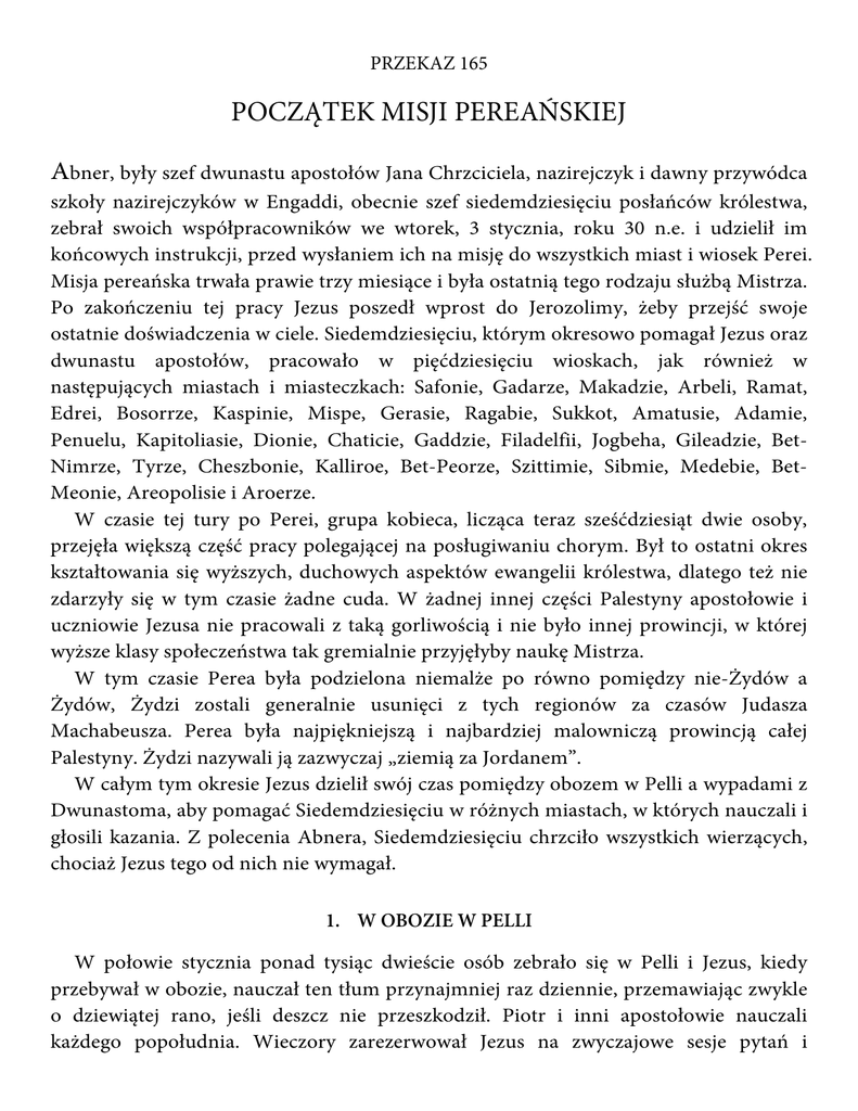 PRZEKAZ 165 POCZĄTEK MISJI PEREAŃSKIEJ Abner, były szef dwunastu apostołów Jana Chrzciciela, nazirejczyk i dawny przywódca szkoły nazirejczyków w Engaddi, obecnie szef siedemdziesięciu posłańców królestwa, zebrał swoich współpracowników we wtorek, 3 stycznia, roku 30 n.e. i udzielił im końcowych instrukcji, przed wysłaniem ich na misję do wszystkich miast i wiosek Perei. Misja pereańska trwała prawie trzy miesiące i była ostatnią tego rodzaju służbą Mistrza. Po zakończeniu tej pracy Jezus poszedł wprost do Jerozolimy, żeby przejść swoje ostatnie doświadczenia w ciele. Siedemdziesięciu, którym okresowo pomagał Jezus oraz dwunastu apostołów, pracowało w pięćdziesięciu wioskach, jak również w następujących miastach i miasteczkach: Safonie, Gadarze, Makadzie, Arbeli, Ramat, Edrei, Bosorrze, Kaspinie, Mispe, Gerasie, Ragabie, Sukkot, Amatusie, Adamie, Penuelu, Kapitoliasie, Dionie, Chaticie, Gaddzie, Filadelfii, Jogbeha, Gileadzie, BetNimrze, Tyrze, Cheszbonie, Kalliroe, Bet-Peorze, Szittimie, Sibmie, Medebie, BetMeonie, Areopolisie i Aroerze. W czasie tej tury po Perei, grupa kobieca, licząca teraz sześćdziesiąt dwie osoby, przejęła większą część pracy polegającej na posługiwaniu chorym. Był to ostatni okres kształtowania się wyższych, duchowych aspektów ewangelii królestwa, dlatego też nie zdarzyły się w tym czasie żadne cuda. W żadnej innej części Palestyny apostołowie i uczniowie Jezusa nie pracowali z taką gorliwością i nie było innej prowincji, w której wyższe klasy społeczeństwa tak gremialnie przyjęłyby naukę Mistrza. W tym czasie Perea była podzielona niemalże po równo pomiędzy nie-Żydów a Żydów, Żydzi zostali generalnie usunięci z tych regionów za czasów Judasza Machabeusza. Perea była najpiękniejszą i najbardziej malowniczą prowincją całej Palestyny. Żydzi nazywali ją zazwyczaj „ziemią za Jordanem”. W całym tym okresie Jezus dzielił swój czas pomiędzy obozem w Pelli a wypadami z Dwunastoma, aby pomagać Siedemdziesięciu w różnych miastach, w których nauczali i głosili kazania. Z polecenia Abnera, Siedemdziesięciu chrzciło wszystkich wierzących, chociaż Jezus tego od nich nie wymagał. 1. W OBOZIE W PELLI W połowie stycznia ponad tysiąc dwieście osób zebrało się w Pelli i Jezus, kiedy przebywał w obozie, nauczał ten tłum przynajmniej raz dziennie, przemawiając zwykle o dziewiątej rano, jeśli deszcz nie przeszkodził. Piotr i inni apostołowie nauczali każdego popołudnia. Wieczory zarezerwował Jezus na zwyczajowe sesje pytań i odpowiedzi z Dwunastoma oraz innymi, bardziej zaawansowanymi uczniami. Grupa wieczorna składała się zazwyczaj z około pięćdziesięciu osób. Do połowy marca, czyli do tego czasu, gdy Jezus zaczął iść w kierunku Jerozolimy, ponad cztery tysiące osób tworzyło wielką audiencję, która każdego ranka słuchała kazania, głoszonego przez Jezusa albo przez Piotra. Mistrz postanowił skończyć swe dzieło na Ziemi wtedy, kiedy zainteresowanie jego posłaniem osiągnie wysoki punkt, najwyższy punkt uzyskany w czasie drugiego, czy pozbawionego cudów stadium rozwoju królestwa. Podczas gdy trzy czwarte tłumu stanowili poszukiwacze prawdy, była tam też spora grupa faryzeuszy z Jerozolimy i z innych stron, razem z wieloma wątpiącymi i malkontentami. Jezus i dwunastu apostołów sporo czasu poświęcali tłumom, zgromadzonym w obozie w Pelli. Dwunastu nie zwracało specjalnej uwagi na pracę terenową, wychodząc tylko od czasu do czasu z Jezusem, aby odwiedzić pracowników Abnera. Abner był dobrze obeznany z rejonem pereańskim, ponieważ był to ten sam teren, na którym jego poprzedni mistrz, Jan Chrzciciel, prowadził większość swej działalności. Po rozpoczęciu misji w Perei, Abner i Siedemdziesięciu nigdy już nie wrócili do obozu w Pelli. 2. KAZANIE O DOBRYM PASTERZU Grupa ponad trzystu mieszkańców Jerozolimy, faryzeuszy i innych, poszła za Jezusem na północ, do Pelli, kiedy po zakończeniu Święta Poświęcenia pośpiesznie oddalał się spod jurysdykcji żydowskich władców; i to właśnie w obecności tych żydowskich nauczycieli i przywódców, jak również przysłuchujących się dwunastu apostołów, Jezus wygłosił kazanie o „Dobrym Pasterzu”. Po półgodzinnej, nieoficjalnej rozmowie, Jezus zwrócił się do grupy około stu osób: „Tego wieczora mam wam wiele do powiedzenia, a skoro wielu z was to moi uczniowie a niektórzy z was są moimi zawziętymi wrogami, dlatego przedstawię wam moje nauczanie w formie przypowieści, aby w ten sposób każdy z was mógł wziąć dla siebie to, co przyjmie jego serce. Dzisiejszego wieczora są tutaj przede mną ludzie, którzy są gotowi za mnie umrzeć i niektórzy z nich złożą taką ofiarę w nadchodzących latach; i jest tutaj także trochę was, niewolników tradycji, którzy szliście za mną z Jerozolimy i którzy pospołu ze swymi ciemnymi i oszukańczymi przywódcami chcecie zabić Syna Człowieczego. To życie, jakim ja żyję teraz w ciele, będzie osądzać was, zarówno prawdziwych pasterzy jak i fałszywych pasterzy. Jeśli fałszywy pasterz jest ślepy, nie będzie miał grzechu, ale wy twierdzicie, że widzicie; twierdzicie, że jesteście nauczycielami Izraela, dlatego wasz grzech pozostanie na was. W niebezpiecznych czasach, prawdziwy pasterz zbiera swoją owczarnię na noc do zagrody. Kiedy nadejdzie ranek, wchodzi drzwiami do zagrody, a kiedy zawoła, owce poznają jego głos. Każdy pasterz, który wdziera się do owczarni jakimkolwiek innym sposobem, niż drzwiami, jest złodziejem i rozbójnikiem. Prawdziwy pasterz wchodzi do owczarni po tym, jak odźwierny otworzy mu drzwi a jego owce, znając jego głos, wychodzą na jego słowo; i kiedy te, które są jego, zostają wyprowadzone, prawdziwy pasterz idzie przodem; prowadzi je drogą a owce idą za nim. Jego owce idą za nim, ponieważ znają jego głos; nie p