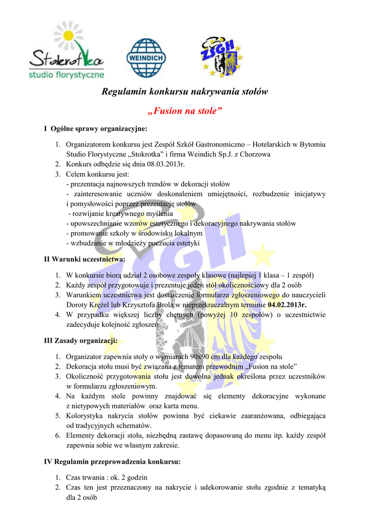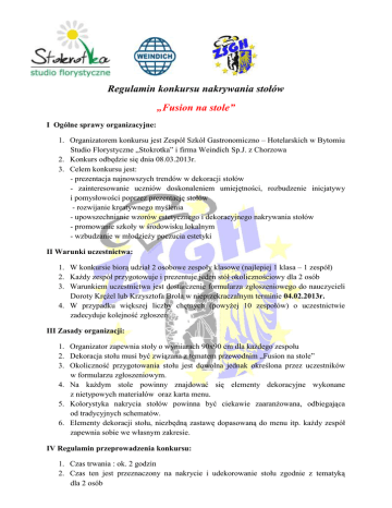 Regulamin konkursu nakrywania stołów „Fusion na stole” I Ogólne sprawy organizacyjne: 1. Organizatorem konkursu jest Zespół Szkół Gastronomiczno – Hotelarskich w Bytomiu Studio Florystyczne „Stokrotka” i firma Weindich Sp.J. z Chorzowa 2. Konkurs odbędzie się dnia 08.03.2013r. 3. Celem konkursu jest: - prezentacja najnowszych trendów w dekoracji stołów - zainteresowanie uczniów doskonaleniem umiejętności, rozbudzenie inicjatywy i pomysłowości poprzez prezentację stołów - rozwijanie kreatywnego myślenia - upowszechnianie wzorów estetycznego i dekoracyjnego nakrywania stołów - promowanie szkoły w środowisku lokalnym - wzbudzanie w młodzieży poczucia estetyki II Warunki uczestnictwa: 1. W konkursie biorą udział 2 osobowe zespoły klasowe (najlepiej 1 klasa – 1 zespół) 2. Każdy zespół przygotowuje i prezentuje jeden stół okolicznościowy dla 2 osób 3. Warunkiem uczestnictwa jest dostarczenie formularza zgłoszeniowego do nauczycieli Doroty Krężel lub Krzysztofa Brola w nieprzekraczalnym terminie 04.02.2013r. 4. W przypadku większej liczby chętnych (powyżej 10 zespołów) o uczestnictwie zadecyduje kolejność zgłoszeń. III Zasady organizacji: 1. Organizator zapewnia stoły o wymiarach 90x90 cm dla każdego zespołu 2. Dekoracja stołu musi być związana z tematem przewodnim „Fusion na stole” 3. Okoliczność przygotowania stołu jest dowolna jednak określona przez uczestników w formularzu zgłoszeniowym. 4. Na każdym stole powinny znajdować się elementy dekoracyjne wykonane z nietypowych materiałów oraz karta menu. 5. Kolorystyka nakrycia stołów powinna być ciekawie zaaranżowana, odbiegająca od tradycyjnych schematów. 6. Elementy dekoracji stołu, niezbędną zastawę dopasowaną do menu itp. każdy zespół zapewnia sobie we własnym zakresie. IV Regulamin przeprowadzenia konkursu: 1. Czas trwania : ok. 2 godzin 2. Czas ten jest przeznaczony na nakrycie i udekorowanie stołu zgodnie z tematyką dla 2 osób 3. W trakcie trwania konkursu zabronione jest kontaktowanie się uczestników z osobami postronnymi 4. Stoły będzie oceniać specjalnie powołane jury Oceniane będą następujące elementy: - prawidłowy dobór zastawy stołowej do menu - ułożenie zastawy zgodnie z przyjętymi zasadami - zgodność z tematyką - zastosowanie i oryginalność nietypowych dekoracji - oryginalny dobór kolorystyczny do okoliczności nakrycia stołu - funkcjonalność stołu V Na wszystkie pytania dotyczące spraw nie wyszczególnionych w regulaminie odpowiedzą nauczyciele: Dorota Krężel i Krzysztof Brol