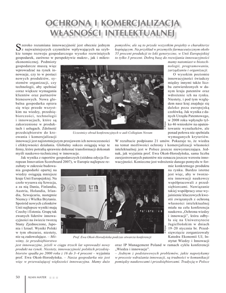 OCHRONA I KOMERCJALIZACJA WŁASNOŚCI INTELEKTUALNEJ S A.Wojnar A.Wojnar zeroko rozumiana innowacyjność jest obecnie jednym pomysłów, ale są to przede wszystkim projekty o charakterze z najważniejszych czynników wpływających na szyb- kopiującym. Na przykład w przemyśle farmaceutycznym około kie tempo rozwoju gospodarczego wysoko rozwiniętych 55 procent produkcji to leki generyczne, w Unii Europejskiej gospodarek, zarówno w perspektywie makro-, jak i mikro- to tylko 3 procent. Dobrą bazę do rozwijania innowacyjności ekonomicznej. Podmioty mamy natomiast w biotechgospodarcze muszą więc nologii, programowaniu, wprowadzać na rynek inzarządzaniu i organizacji. nowacje, czy to w postaci O wysokim poziomie nowych produktów, syinnowacyjności świadczy stemów organizacji, czy między innymi także licztechnologii, aby spełniać ba zatwierdzonych w dacoraz większe wymagania nym kraju patentów oraz klientów oraz partnerów wdrożenie ich na rynku. biznesowych. Nowa gloNiestety, i pod tym wzglębalna gospodarka opiera dem nasz kraj znajduje się się więc przede wszystdaleko poza europejską kim na wiedzy, przedsięczołówką. Jak wynika z dabiorczości, technologii nych Urzędu Patentowego, i innowacjach, które są w 2008 roku wpłynęło tylzakorzenione w produkko 46 wniosków na opatentach i usługach. Zdolność towanie wynalazków, ale przedsiębiorstw do kreponad połowa nie spełniała Uczestnicy obrad konferencyjnych w auli Collegium Novum owania i komercjalizacji wymaganych kryteriów. innowacji jest najistotniejszym przejawem ich nowoczesności W rezultacie podpisano 21 umów. Pokazuje to, że wiedza i efektywności działania. Globalny sukces osiągają więc te na temat możliwości ochrony i komercjalizacji własności firmy, które potrafią sprawnie dokonać transformacji dokonań intelektualnej jest w Polsce jeszcze niewystarczająca. Jedmyśli naukowo-technicznej w innowacje. nak, jak wyjaśnia prof. Ewa Okoń-Horodyńska, sama liczba Jak wynika z raportów gospodarczych (siódma edycja Eu- zarejestrowanych patentów nie oznacza jeszcze wzrostu innoropean Innovation Scoreboard 2007), w Europie najlepsze re- wacyjności. Konieczne jest wdrożenie danego pomysłu w forzultaty w zakresie budowamie konkretnego produktu nia gospodarki opartej na na rynku. Bardzo istotne wiedzy osiągają mniejsze jest więc, aby w tworzekraje Unii Europejskiej. Na niu innowacji naukowcy czoło wysuwa się Szwecja, współpracowali z przeda za nią Dania, Finlandia, siębiorcami. Nawiązanie Austria, Holandia, Irlantakiej współpracy oraz wydia, Szwajcaria, następnie jaśnienie kluczowych kweNiemcy i Wielka Brytania. stii związanych z ochroną Spośród nowych członków własności intelektualnej Unii najlepsze wyniki mają miała na celu konferencja Czechy i Estonia. Grupę tak naukowa „Ochrona wiedzy zwanych liderów innowai innowacji”, która odbycyjności na świecie tworzą ła się na Uniwersytecie Stany Zjednoczone, JapoJagiellońskim w dniach nia i Izrael. Wyniki Polski 19–20 stycznia br. Przedw tym obszarze, niestety, sięwzięcie zorganizowały nie są zadowalające. – MóKatedra Ekonomii UJ, InProf. Ewa Okoń-Horodyńska podczas otwarcia konferencji wimy, że przedsiębiorstwo stytut Wiedzy i Innowacji jest innowacyjne, jeżeli w ciągu trzech lat wprowadzi nowy oraz IP Management Poland w ramach cyklu konferencji produkt na rynek. Niestety, innowacyjność polskich przedsię- „Wiedza i innowacje”. biorstw spadła po 2000 roku z 16 do 3–4 procent – wyjaśnia – Jednym z podstawowych problemów, jakie napotykamy prof. Ewa Okoń-Horodyńska. – Nasza gospodarka nie jest w procesie wdrażania innowacji, są trudności w komunikacji więc w przeważającej większości innowacyjna. Mamy dużo pomiędzy naukowcami i przedsiębiorcami. Tradycją w Polsce 50 ALMA MATER A.Wojnar jest to, że naukowcy wstydzą się ujawniania tego, że pracują na rozwiązaniem dla kwestii innowacyjności. Dzieje się tak dlarzecz sektora realnego. Natomiast przedsiębiorcy narzekają, tego, ponieważ innowacyjność cechuje się wysokim stopniem że naukowy nie chcą podejmować ryzyka, które jest potrzebne ryzyka, a w Polsce wciąż brakuje, zarówno przedsiębiorcom, w realizacji innowacji – mówiła prof. Ewa Okoń-Horodyńska. jak i naukowcom, otwartości i zdolności podejmowania tego Jest to niezwykle istotne, ponieważ w programie Innowacyjna ryzyka – tłumaczyła prof. Ewa Okoń-Horodyńska. Gospodarka jest wyraźnie zaznaczone, że musi istnieć fakWarto tu także wyraźnie podkreślić, że dla naukowców tyczna współpraca przedszczególnie istotny jest siębiorcy i naukowca przy fakt, że podstawową zasadą wdrożeniu patentu i tym jest najpierw zgłoszenie samym pojawieniu się nowynalazku do urzędu pawego produktu na rynku. tentowego, a dopiero potem – Obydwaj więc ponoszą ogłoszenie wyników bato samo ryzyko, a tego dań. Na naszym Uniwersynaukowcy przeważnie nie tecie informacją dotyczącą chcą – wyjaśniała prof. ochrony własności intelekOkoń-Horodyńska. tualnej służą specjaliści z CITTRU (w zeszłym Dużą część obrad konroku Uniwersytet zgłosił ferencyjnych, które od18 patentów, dwa są chroniobywały się w Collegium ne szeroko). Można też zwróNovum i Collegium Macić się o pomoc bezpośrednio ius, poświęcono ochronie do rzecznika patentowego własności intelektualnej. (www.rzecznikpatentowy. Problem szeroko omówiła org.pl) i Urzędu Patentowego między innymi dr ElżbieDyskusja panelowa inaugurująca obrady (www.uprp.pl). ta Pohulak-Żołędowska. Podczas obrad konferencyjnych omówiono także problemy Podstawowym zadaniem praw chroniących interesy twórcy jest zapewnienie mu motywacji do dalszych badań. Daje mu związane z rolą uczelni wyższych w powstawaniu innowacji, to także siłę monopolisty, pozwalającą na czerpanie korzyści rozwojem gospodarki wiedzy w krajach Unii Europejskiej, materia
