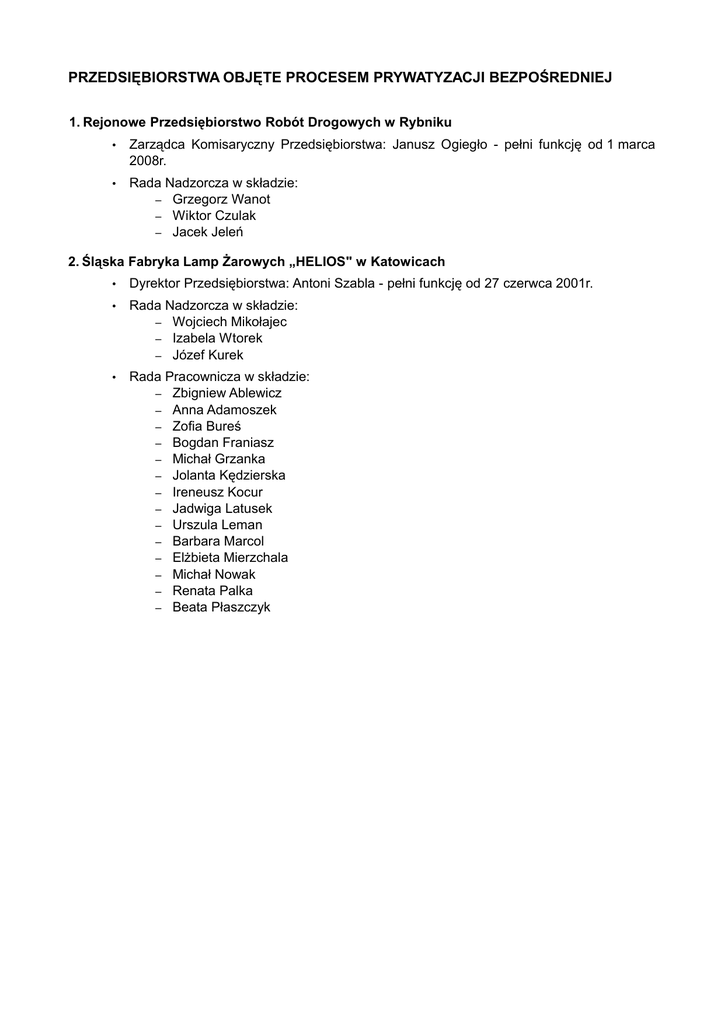 PRZEDSIĘBIORSTWA OBJĘTE PROCESEM PRYWATYZACJI BEZPOŚREDNIEJ 1. Rejonowe Przedsiębiorstwo Robót Drogowych w Rybniku • Zarządca Komisaryczny Przedsiębiorstwa: Janusz Ogiegło - pełni funkcję od 1 marca 2008r. • Rada Nadzorcza w składzie: – Grzegorz Wanot – Wiktor Czulak – Jacek Jeleń 2. Śląska Fabryka Lamp Żarowych „HELIOS" w Katowicach • Dyrektor Przedsiębiorstwa: Antoni Szabla - pełni funkcję od 27 czerwca 2001r. • Rada Nadzorcza w składzie: – Wojciech Mikołajec – Izabela Wtorek – Józef Kurek • Rada Pracownicza w składzie: – Zbigniew Ablewicz – Anna Adamoszek – Zofia Bureś – Bogdan Franiasz – Michał Grzanka – Jolanta Kędzierska – Ireneusz Kocur – Jadwiga Latusek – Urszula Leman – Barbara Marcol – Elżbieta Mierzchala – Michał Nowak – Renata Palka – Beata Płaszczyk PRZEDSIĘBIORSTWA OBJĘTE ZAMIAREM KOMERCJALIZACJI 1. Bielskie Zakłady Lin i Pasów „BEZALIN” w Bielsku – Białej • Tymczasowy Kierownik Przedsiębiorstwa: Jarosław Klimaszewski - pełni funkcję od 8maja 2008r. • Rada Pracownicza w składzie: – Marek Łukowicz – Jacek Musiał – Adam Kuder • Rada Nadzorcza w składzie: – Boroń Kacper – Podolski Marek – Krysta Mirosław 2. Bielskie Zakłady Obuwia „BEFADO” w Bielsku – Białej • Tymczasowy Kierownik Przedsiębiorstwa: Andrzej Rasiński - pełni funkcję od 1 stycznia 2007r. • Rada Nadzorcza w składzie: – Andrzej Adamek – Dorota Kąkol – Krzysztof Nowak 3. Fabryka Podzespołów Elektrotechnicznych „EMA-ELEKTROCARBON" w Tarnowskich Górach • Zarządca Przedsiębiorstwa: Paweł Lejman - pełni funkcję od 1 sierpnia 2006r. • Rada Nadzorcza w składzie: – Henryk Rzepski – Leszek Piechota – Alfred Czaja 4. Przedsiębiorstwo Energetyki Cieplnej w Jastrzębiu Zdroju • Dyrektor Przedsiębiorstwa: Albert Rduch - pełni funkcję od 1 grudnia 1994r. • Rada Nadzorcza w składzie: – Ryszard Płoneczka – Danuta Apolonia Ziomek – Henryk Kapol • Rada Pracownicza w składzie: – Walczyk Janusz – Sołtysek Janusz – Kucharski Andrzej – Dytkowski Marek – Mołdrzyk Krzysztof – Orszulik Artur – Mamczur Zbigniew – Mrówka Adam – Styl Marcin – Tomanek Elżbieta – Nowakowski Janusz – Soczek Krzysztof – Zawieja Romuald 5. Przedsiębiorstwo Handlowo - Techniczne Sprzętu Pożarniczego i Ochronnego „SUPON" w Katowicach • Tymczasowy Kierownik Przedsiębiorstwa: Grażyna Gajowczyk - pełni funkcję od 10 marca 2008r. • Rada Nadzorcza w składzie: – Zbigniew Kucharski – Jan Paweł Jeziorowski – Robert Zarzycki • Rada Pracownicza w składzie: Lucyna Chudy Barbara Cieciura – Janina Graca – Krzysztof Mońka – Alicja Śliwka – – PRZEDSIĘBIORSTWA OBJĘTE INNYM ZAMIAREM PRZEKSZTAŁCENIA 1. Dąbrowska Fabryka Obrabiarek „PONAR-DEFUM” im. St. Krzynówka w Dąbrowie Górniczej. • Zarządca Komisaryczny Przedsiębiorstwa: Anna Michałek - pełni funkcję od 8 listopada 2007r. PRZEDSIĘBIORSTWA OBJĘTE PROCESEM LIKWIDACJI 1. Bielskie Zakłady Futrzarskie „BESKIDIANA" w Bielsku-Białej • Likwidator Przedsiębiorstwa: Zdzisław Pilak - pełni funkcję od 1 marca 2008r. 2. Beskidzkie Zakłady Garbarskie "BESTAN" w Żywcu • Likwidator Przedsiębiorstwa: Mariusz Dudek – pełni funkcję od 1 marca 2008r. 3. Biuro Projektów Budownictwa Przemysłowego i Kopalnictwa Rud „BIPRORUD” w Częstochowie • Likwidator Przedsiębiorstwa: Zenon Peryga – pełni funkcję od 1 marca 2007r. 4. Biuro Studiów i Projektów Przemysłu Węglowego „PROGOR” w Katowicach • Likwidator Przedsiębiorstwa: Paweł Lejman - pełni funkcję od 1 grudnia 2006r. 5. Bytomskie Przedsiębiorstwo Robót Elewacyjnych i Wykończeniowych w Bytomiu • Likwidator Przedsiębiorstwa: Zenon Peryga - pełni funkcję od 1 czerwca 2007r. 6. Dom Mody „ELEGANCJA” w Katowicach • Likwidator Przedsiębiorstwa: Mariusz Dudek - pełni funkcję od 1 kwietnia 2008r. 7. Główne Biuro Studiów i Projektów Przeróbki Węgla "SEPARATOR" w Katowicach ▪ Likwidator Przedsiębiorstwa: Zdzisław Pilak - pełni funkcję od 16 maja 2008r. 8. Fabryka Nakryć Stołowych „POLWID” w Cieszynie • Likwidator Przedsiębiorstwa: Adam Pawełek - pełni funkcję od 16 października 2006r. 9. Fabryka Opakowań Blaszanych w Zawierciu • Likwidator Przedsiębiorstwa: Ryszard Klóska - pełni funkcję od 1 maja 2006r. 10.Hutnicze Przedsiębiorstwo Remontowe w Dąbrowie Górniczej • Likwidator Przedsiębiorstwa: Leokadia Opatowiecka - pełni funkcję od 16 października 2006r. 11.Kaletańskie Zakłady Celulozowo - Papiernicze w Kaletach • Likwidator Przedsiębiorstwa: Robert Solga „Robert Solga Kancelaria Radcy Prawnego”pełni funkcję od 1 listopada 2006r. 12.Państwowe Przedsiębiorstwo Remontów i Eksploatacji Domów „ŁABĘDY" w Gliwicach • Likwidator Przedsiębiorstwa: Andrzej Nicpan - pełni funkcję od 12 stycznia 2007r. 13.Przedsiębiorstwo Budowlano-Inżynieryjne „BUMEX” w Mysłowicach • Likwidator Przedsiębiorstwa: Janusz Błaszczyk - pełni funkcję od 7 kwietnia 2003r. 14.Przedsiębiorstwo Budownictwa Ogólnego w Tychach ▪ Likwidator Przedsiębiorstwa: Krzysztof Pająk - pełni funkcję od 14 lipca 2007r. 15.Przedsiębiorstwo w Bielsku-Białej • Doświadczalno-Produkcyjne Szybownictwa „PZL-BIELSKO” Likwidator Przedsiębiorstwa: Andrzej Nicpan - pełni funkcję od 1 sierpnia 2007r. 16.Przedsiębiorstwo Gospodarki Materiałowej Przemysłu Węglowego w Lędzinach • Likwidator Przedsiębiorstwa: Zygmunt Bielaszka - pełni funkcję od 18 lutego 2008r. 17. Przedsiębiorstwo Handlowo - Usługowo - Produkcyjne „MAGHURT” w Rudzie Śląskiej • Likwidator Przedsiębiorstwa: Zenon Peryga - pełni funkcję od 1 kwietnia 2004r. 18.Przedsiębiorstwo Produkcji i Montażu Urządzeń Reklamowych „WUTEH” w Katowicach • Likwidator Przedsiębiorstwa: Stanisław Herbut - pełni funkcję od 16 sierpnia 2005r. 19.Przedsiębiorstwo w Sosnowcu 