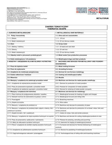 MIĘDZYNARODOWE TARGI POZNAŃSKIE Sp. z o. o. POZNAŃ INTERNATIONAL FAIR Ltd. ul. Głogowska 14, 60-734 Poznań, Poland tel +48/61 869 21 16; fax +48/61 869 29 99 Konto / Bank account: Powszechna Kasa Oszczędności Bank Polski S.A. w Warszawie o/Poznań Nr konta PLN: 38 102040270000110204242962 Nr konta EUR (IBAN): PL 46 102040270000140210929075, SWIFT: BPKOPLPW Podatnik VAT czynny / Active VAT Payer, NIP / Tax ID: 777-00-00-488 Sąd Rejonowy Poznań – Nowe Miasto i Wilda w Poznaniu / Poznan District Court VIII Wydział Gospodarczy Krajowego Rejestru Sądowego / 8th Division of National Court Register KRS / Registered number: 0000202703 Kapitał zakładowy / Share capital: 42 310 200,00 PLN METALFORUM ZAKRES TEMATYCZNY THEMATIC SCOPE 1. SUROWCE METALURGICZNE 1. METALLURGICAL RAW MATERIALS 1.1. Rudy i koncentraty 1.1. Ores and ore concentrates 1.1.1. Żelaza 1.1.1. Of iron 1.1.2. Metali nieżelaznych 1.1.2. Of non-ferrous metals 1.2. Złom 1.2. Scrap metal 1.2.1. Stalowy i staliwny 1.2.1. Of steel and cast steel 1.2.2. Żeliwny 1.2.2. Of cast iron 1.2.3. Metali nieżelaznych 1.2.3. Of non-ferrous metals 1.3. Odpady metali w procesach produkcyjnych 1.3. Metal waste from production processes 1.4. Żużle metalurgiczne i ich przetwory 1.4. Metallurgical slags and their products 2. MASZYNY I URZĄDZENIA DLA METALURGII I HUTNICTWA 2. MACHINES AND DEVICES FOR METALLURGY AND FOUNDRY ENGINEERING 2.1. Piece do topienia metali 2.1. Metal melting furnaces 2.2. Piece do wyżarzania 2.2. Annealing furnaces 2.3. Urządzenia do metalurgii pozapiecowej 2.3. Devices for non-furnace metallurgy 2.4. Kadzie odlewnicze i hutnicze 2.4. Casting and metallurgical ladles 2.5. Wlewnice 2.5. Moulds 2.6. Maszyny i urządzenia do metalurgii proszków metali 2.6. Machines and devices for metal powder metallurgy 2.6.1. Urządzenia do wytwarzania proszków metali 2.6.1. Devices for production of metal powders 2.6.2. Prasy do prasowania wyprasek z proszków metali 2.6.2. Presses for compaction of metal powders 2.6.3. Urządzenia do spiekania wyprasek z proszków metali 2.6.3. Devices for sintering of metal powder compacts 2.7. Maszyny i urządzenia dla hutnictwa 2.7. Machines and devices for metallurgy 2.7.1. Piece hutnicze do podgrzewania wlewków i wsadów 2.7.1. Metallurgical furnaces for heating of ingots and charges 2.7.2. Walcarki hutnicze do walcowania na gorąco i zimno 2.7.2. Metallurgical hot and cold rolling mills 2.7.3. Przeciągarki 2.7.3. Broaching machines 2.7.4. Zwijarki do drutów 2.7.4. Wire coilers 2.7.5. Maszyny i urządzenia do produkcji rur 2.7.5. Machines and devices for production of pipes 2.7.6. Maszyny i urządzenia do produkcji taśm ciętych z blachy, folii i 2.7.6. Machines and devices for production of cut sheet strips, foils and podobnych wyrobów similar products 2.7.7. Zwijarki do taśm, folii i podobnych 2.7.7. Coilers for strips, foils and similar products 2.7.8. Maszyny i urządzenia do cięcia wyrobów hutniczych na wymiar 2.7.8. Machines and devices for cutting metallurgical products to size 2.7.9. Prasy do prasowania, wytłaczania i wykrawania 2.7.9. Presses for pressing, extruding and punching 2.7.10. Młoty do odkuwania wyrobów hutniczych 2.7.10. Hammers for forging of metallurgical products 2.7.11.Piece i urządzenia do obróbki cieplnej wyrobów hutniczych 2.7.11.Furnaces and devices for thermal distressing of metallurgical products 2.7.12. Urządzenia do pakietowania wyrobów hutniczych 2.7.12. Devices for packeting of metallurgical products 2.7.13. Ciągi technologiczne walcarek i przeciągarek 2.7.13. Technological lines of rolling mills and broaching machines 2.7.14. Urządzenia transportu międzyoperacyjnego 2.7.14. Devices for inter-operational transport 2.7.15. Inne maszyny i urządzenia hutnicze 2.7.15. Other metallurgical machines and devices 2.7.16. Wyposażenie i oprzyrządowanie maszyn i urządzeń 2.7.16. Equipment and instrumentation for metallurgical machines and hutniczych devices 2.7.17. Materiały i osprzęt dla hutnictwa 2.7.17. Materials and equipment for metallurgy 2.7.18. Kompletne linie technologiczne, obiekty, metalurgiczne, 2.7.18. Complete metallurgical, foundry and steel working technological odlewnicze, hutnicze lines 3. PRODUKTY HUTNICTWA I ODLEWNICTWA 3. METALLURGICAL PRODUCTS AND CASTS 3.1. Druty 3.1. Wires 3.1.1. Druty ogólnego przeznaczenia 3.1.1. Wires for general purpose 3.1.2. Druty spawalnicze 3.1.2. Wires for welding 3.1.3. Druty ciągnione na zimno 3.1.3. Cold-drawn wires 3.1.4. Druty z metali nieżelaznych 3.1.4. Non-ferrous wires 3.1.5.Inne 3.1.5. Other wires 3.2. Rury 3.2. Pipes 3.2.1. Rury żeliwne i dodatki 3.2.1. Cast iron pipes and auxiliary elements 3.2.1.1. Rury żeliwne, przewody rurowe, profile i tuleje z żeliwa 3.2.1.1. Steel pipes, pipe conduits, sections and sleeves of cast iron 3.2.1.2. Złącza do rur żeliwne 3.2.1.2. Cast iron joints for pipes 3.2.2.Rury stalowe 3.2.2. Steel pipes 3.2.2.1. Rury, przewody rurowe, profile drążone i tuleje stalowe 3.2.2.1. Pipes, pipe conduits, hollowed sections and steel sleeves 3.2.2.2. Rury stalowe bez szwu 3.2.2.2. Steel seamless pipes 3.2.2.3. Rury stalowe spawane 3.2.2.3. Steel welded pipes 3.2.2.4. Złącza do rur staliwne i stalowe 3.2.2.4. Cast steel and steel joints 3.2.3. Rury z metali nieżelaznych 3.2.3. Non-ferrous pipes 3.2.4. Inne 3.2.4. Other pipes 3.3. Pręty 3.3. Bars 3.3.1. Pręty ciągnione na zimno 3.3.1. Cold-drawn bars 3.3.2. Pręty walcowane na gorąco 3.3.2. Hot-rolled bars 3.3.3. Pręty zbrojeniowe 3.3.3. Reinforcing bars 3.3.4. Pręty z metali nieżelaznych 3.3.4. Non-ferrous bars 3.3.5. Inne 3.3.5. Other bars 3.4. Blachy 3.4. Sheets 3.4.1. Blachy walcowane na gorące 3.4.1. Hot-rolled sheets 3.4.2. Blachy walcowane na zimno 3.4.2. Cold-rolled sheets 3.4.3. Blachy walcowane nawrotnie 3.4.3. Reversible-rolled sheets 3.4.4. Blachy ocynkowane 3.4.4. Zinc coated sheets 3.4.5. Blachy z metali nieżelaznych 3.4.5. Non-ferrous sheets 3.4.6. Inne 3.4.6. Other sheet