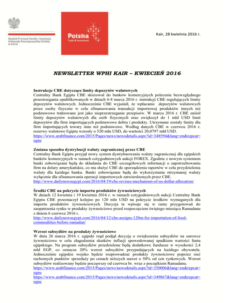 Kair, 28 kwietnia 2016 r. NEWSLETTER WPHI KAIR – KWIECIEŃ 2016 Instrukcje CBE dotyczące limity depozytów walutowych Centralny Bank Egiptu CBE skierował do banków komercyjnych polecenie bezwzględnego przestrzegania opublikowanych w dniach 6-8 marca 2016 r. instrukcji CBE regulujących limity depozytów walutowych. Jednocześnie CBE wyjaśnił, że wpłacanie depozytów walutowych przez osoby fizyczne w celu sfinansowania transakcji importowej produktów innych niż podstawowe traktowane jest jako nieprzestrzeganie przepisów. W marcu 2016 r. CBE zniósł limity depozytów walutowych dla osób fizycznych oraz zwiększył do 1 mld USD limit depozytów dla firm importujących podstawowe dobra i produkty. Utrzymane zostały limity dla firm importujących towary inne niż podstawowe. Według danych CBE w czerwcu 2016 r. rezerwy walutowe Egiptu wzrosły o 520 mln USD, do wartości 20,0797 mld USD. https://www.arabfinance.com/2015/Pages/news/newsdetails.aspx?id=348594&lang=en&repcat= egne Zmiana sposobu dystrybucji waluty zagranicznej przez CBE Centralny Bank Egiptu przyjął nowy system dystrybuowania waluty zagranicznej dla egipskich banków komercyjnych w ramach cotygodniowych aukcji FOREX. Zgodnie z nowym systemem banki zobowiązane będą do składania do CBE szczegółowych informacji o zapotrzebowaniu firm na dolary amerykańskie, co ma służyć CBE do sporządzenia raportów w celu przydzielenia waluty dla każdego banku. Banki zobowiązane będą do wykorzystania otrzymanej waluty wyłącznie dla sfinansowania operacji importowych zatwierdzonych przez CBE. http://www.dailynewsegypt.com/2016/04/19/cbe-revises-mechanism-of-us-dollar-allocation/ Środki CBE na pokrycie importu produktów żywnościowych W dniach 12 kwietnia i 19 kwietnia 2016 r. w ramach cotygodniowych aukcji Centralny Bank Egiptu CBE przeznaczył kolejno po 120 mln USD na pokrycie środków wymaganych dla importu produktów żywnościowych. Decyzja ta wpisuje się w ramy przygotowań do zaopatrzenia rynku w produkty żywnościowe przed rozpoczęciem świętego miesiąca Ramadanu z dniem 6 czerwca 2016 r. http://www.dailynewsegypt.com/2016/04/12/cbe-assigns-120m-for-importation-of-foodcommodities-before-ramadan/ Wzrost subsydiów na produkty żywnościowe W dniu 26 marca 2016 r. egipski rząd podjął decyzję o zwiększeniu subsydiów na surowce żywnościowe w celu złagodzenia skutków inflacji spowodowanej spadkiem wartości funta egipskiego. Na program subsydiów przedzielone będą dodatkowe fundusze w wysokości 2,4 mld EGP, co oznacza 20% wzrost subsydiów przypadających na każdego obywatela. Jednocześnie egipskie wojsko będzie rozprowadzać produkty żywnościowe poprzez sieć ruchomych punktów sprzedaży po cenach niższych nawet o 50% od cen rynkowych. Wzrost subsydiów realizowany będzie począwszy od czerwca br. wraz z początkiem Ramadanu. https://www.arabfinance.com/2015/Pages/news/newsdetails.aspx?id=350006&lang=en&repcat= egne https://www.arabfinance.com/2015/Pages/news/newsdetails.aspx?id=349867&lang=en&repcat= egne Rozwój współpracy saudyjsko-egipskiej Według szacunków egipskiego Ministerstwa Współpracy Międzynarodowej, łączna wartość umów podpisanych podczas wizyty króla Arabii Saudyjskiej w Kairze w dniach 7-12 kwietnia br. wyniosła 25 mld USD. Przedstawiciele obu krajów podpisali szereg porozumień i memorandów dotyczących współpracy w różnych sektorach gospodarki. Większość umów skierowana jest na rozwój gospodarczy Półwyspu Synaj oraz strefy Kanału Sueskiego, obejmuje rozbudowę infrastruktury, rozwój rolnictwa, budowę uniwersytetu oraz ustanowienie strefy gospodarczej. Planowana jest także budowa mostu łączącego oba kraje poprzez Morze Czerwone, który ma przyczynić się do wzrostu wymiany handlowej. Egipt uznał też zwierzchność Arabii Saudyjskiej nad wyspami Sanafir i Tiran położonymi w pobliżu Cieśniny Tirańskiej łączącej Morze Czerwone i Zatokę Akaba. http://www.dailynewsegypt.com/2016/04/10/egypt-saudi-arabia-sign-25bn-in-agreementsduring-saudi-monarchs-visit-nasr/ Współpraca francusko-egipska Podczas trzydniowej oficjalnej wizyty prezydenta Francji Francois Hollande w Egipcie w kwietniu br., prezydenci Francji i Egiptu podpisali szereg umów o wartości ponad 1,5 mld euro a także memoranda dotyczące porozumień w dziedzinie transportu, energii, odnawialnych źródeł energii, gazu i turystyki, w tym budowy elektrowni wiatrowej i słonecznej oraz rozbudowy linii metra w Kairze /wartość projektu 1,2 mld euro/. Oba kraje prowadzą także negocjacje w celu zawarcia kontraktu na dostawę francuskich myśliwców oraz statków. Francja jest szóstym co do wielkości inwestorem zagranicznym w Egipcie. Wartość francusko-egipskiej wymiany handlowej w 2015 r. wyniosła ponad 1,6 mld USD. http://gulfnews.com/business/economy/egypt-and-france-sign-18-mous-as-hollande-talksbusiness-on-egypt-visit-1.1715628 http://www.aljazeera.com/news/2016/04/francois-hollande-egypt-arms-deal160417121211455.html Zmniejszenie ujemnego salda Egiptu w wymianie handlowej w styczniu 2016 r. Według oficjalnych danych egipskiego urzędu statystycznego CAPMAS w styczniu 2016 r. ujemne saldo egipskiej wymiany handlowej z zagranicą wyniosło 22,3 mld EGP co oznacza 24,9% mniejszą wartość w porównaniu do analogicznego okresu 2015 r. Zmniejszenie deficytu spowodowane jest głównie 21% spadkiem importu, zwłaszcza ograniczeniem importu pszenicy, samochodów oraz surowców do produkcji stali. W tym samym okresie odnotowano również 11,6% spadek eksportu uwarunkowany spadkiem wartości ropy naftowej, odzieży oraz produktów żywnościowych. https://www.arabfinance.com/2015/Pages/news/newsdetails.aspx?id=349584&lang=en&repcat= egne https://www.arabfinance.com/2015/Pages/news/newsdetails.aspx?id=349488&lang=en&repcat= egne