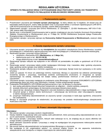 REGULAMIN UŻYCZENIA SPRZĘTU PŁYWAJĄCEGO WRAZ Z WYPOSAŻENIEM ORAZ PRZYCZEPY LEKKIEJ DO TRANSPORTU SPRZĘTU PŁYWAJĄCEGO W MIEJSCOWOŚCI WERBKOWICE I. Postanowienia ogólne 1. Przedmiotem użyczenia jest komplet sprzętu pływającego, na który składa się 12 kajaków, 24 wioseł oraz 24 kamizelek asekuracyjnych, zwany dalej sprzętem oraz 2 przyczepki lekkie o numerach rejestracyjnych LHR 93Y3, LHR 4OY9 przeznaczone do transportu sprzętu, zwane dalej przyczepami. 2. Właścicielem sprzętu i przyczep jest Gmina Werbkowice, ul. Zamojska 1, 22-550 Werbkowice, NIP 919-17-83198, zwana dalej Użyczającym. 3. Sprzęt wraz z przyczepami przechowywany jest w garażu znajdującym się przy budynku biurowym Komunalnego Zakładu Oczyszczania w Werbkowicach przy ul. 3 Maja 3A, 22-550 Werbkowice (budynek byłego Posterunku Energetycznego w Werbkowicach). 4. Użyczaniem sprzętu i przyczep zajmuje się Komunalny Zakład Oczyszczania w Werbkowicach, zwanym dalej KZO. II. Zasady wypożyczania sprzętu i przyczepy 1. Użyczanie sprzętu i przyczep odbywa się nieodpłatnie dla wszystkich mieszkańców Gminy Werbkowice, turystów korzystających z infrastruktury agroturystycznej oraz osób korzystających z infrastruktury sportowo-edukacyjnej. 2. Rezerwacji sprzętu i przyczep można dokonać: osobiście u Kierownika KZO (Werbkowice, ul. 3 Maja 3A), telefonicznie pod nr tel.: 84 615 36 95, drogą elektroniczną e-mail: [email protected]. 3. Rezerwacja sprzętu odbywa się wyłącznie w dni robocze od poniedziałku do piątku w godzinach od 07.00 do 15.00. 4. Rezerwując sprzęt i przyczepę należy podać następujące informacje: imię i nazwisko, datę i godzinę użyczenia, datę i godzinę zwrotu sprzętu oraz telefon kontaktowy. 5. Wydawanie sprzętu odbywa się w terminie uzgodnionym w rezerwacji. Sprzęt może być wydawany w dni wolne od pracy. 6. Jeżeli po upływie 15 minut od ustalonego terminu rezerwacji, Biorący w użyczenie nie odbierze zamówionego wcześniej sprzętu i przyczepy, rezerwacja zostanie automatycznie anulowana. O rezygnacji ze sprzętu zamówionego na sobotę, niedzielę lub święto należy poinformować minimum 2 dni przed planowanym użyczeniem. 7. Użyczenie sprzętu i przyczepy następuje po podpisaniu przez Biorącego w użyczenie DOKUMENTU UŻYCZENIA zawierającego dane obu stron oraz informacje o rodzaju i liczbie powierzanego sprzętu. 8. Podpisanie DOKUMENTU UŻYCZENIA jest jednoznaczne z tym, że Biorący w użyczenie: 1) jest osobą pełnoletnią (okazał dokument tożsamości ze zdjęciem – dowód osobisty, paszport), 2) posiada dokument uprawniający do kierowania przyczepą (okazał prawo jazdy), 3) zapoznał się i akceptuje niniejszy Regulamin oraz jest świadomy odpowiedzialności z niego wynikającej, 4) otrzymał sprzęt w dobrym stanie technicznych i zobowiązuje się terminowo zdać Użyczającemu sprzętu w stanie niepogorszonym, 5) przyjmuje materialną odpowiedzialność za użyczony sprzęt i przyczepę w razie jego zgubienia, zniszczenia lub uszkodzenia. 9. Biorący w użyczenie przyjmuje do wiadomości, że przyczepy nie posiada nieobowiązkowego ubezpieczenia AutoCasco oraz NW. III. Prawa i obowiązki Użyczającego Użyczający: 1. Nie użycza sprzętu i przyczepy osobom niepełnoletnim. 2. Osoby nieletnie mogą płynąć tylko pod opieką osób pełnoletnich, które ponoszą pełną odpowiedzialność za nie i za ich zachowanie i ewentualne szkody. 3. Nie użycza sprzętu i przyczepy osobom, których stan wskazuje na to, że znajdują się po użyciu alkoholu lub innego środka o podobnym działaniu. 4. Może odmówić użyczenia sprzętu i przyczepy z uwagi na występujące lub prognozowane niekorzystne warunki atmosferyczne. 5. Nie ponosi żadnej odpowiedzialności za bezpieczeństwo Biorącego w użyczenie. 6. Nie występuje w roli „organizatora spływu”, co oznacza między innymi, że nie zapewnia instruktorów, ubezpieczenia oraz transportu w miejsce rozpoczęcia lub zakończenia spływu. 7. Nie pobiera kaucji za mycie kajaków czy też pranie kapoków, jednakże liczy na kulturę osobistą uczestników spływu i przestrzeganie dobrych zwyczajów. IV. Prawa i obowiązki Biorącego w użyczenie Biorący w użyczenie: 1. Zobowiązuje się zwrócić użyczony sprzęt i przyczepę o ustalonej godzinie, czysty, w stanie niepogorszonym i umożliwiającym jego natychmiastowe użycie. 2. Ponosi pełną odpowiedzialność za użyczony sprzęt i przyczepę, sposób ich użycia oraz zobowiązuje się pokryć straty związane z ich zgubieniem bądź zniszczeniem w wysokości 100% ceny rynkowej; w przypadku stwierdzenia faktu zniszczenia sprzętu osoba wydająca sprzęt sporządza protokół zniszczenia tego sprzętu w obecności Biorącego w użyczenie, który stanowi podstawę do oszacowania i naprawienia wyrządzonej szkody. 3. Ponosi pełną odpowiedzialność za właściwy przebieg spływu oraz dbanie o bezpieczeństwo, zachowanie trzeźwości i zakładanie kamizelek asekuracyjnych przez wszystkie osoby korzystające z użyczonego sprzętu. 4. Użyczona przyczepa nie może być używana do innych celów niż transport kajaków, a także przez osobę inną niż Biorący w użyczenie o ile osoba ta nie została wcześniej zaakceptowania przez Użyczającego przez wpisanie jej w dokumencie użyczenia. 5. Biorący w użyczenie zobowiązuje się do użytkowania przyczepy zgodnie z jej przeznaczeniem oraz zgodnie z obowiązującymi przepisami ruchu drogowego. 6. W przypadku uszkodzenie, utraty, wypadku lub kradzieży przyczepy, Biorący w użyczenie jest zobowiązany do natychmiastowego powiadomienie Użyczającego, a w przypadku kradzieży, utraty lub wypadku, również policji. 7. W razie wypadku Biorący w użyczenie nie ma prawa do wyrażania zgody na roszczenie drugiej strony zdarzenia i prowadzenia negocjacji na miejscu zdarzenia w imieniu Użyczającego. 8. W przypadku wypadku lub kradzieży, Biorący w użyczenie jest zobowiązany 