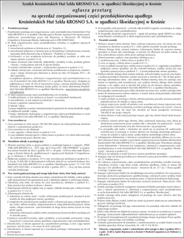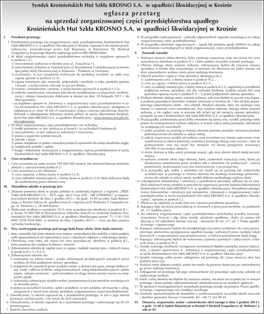 Syndyk Krośnieńskich Hut Szkła KROSNO S.A. w upadłości likwidacyjnej w Krośnie ogłasza przetarg na sprzedaż zorganizowanej części przedsiębiorstwa upadłego Krośnieńskich Hut Szkła KROSNO S.A. w upadłości likwidacyjnej w Krośnie I. Przedmiot przetargu: 1. Przedmiotem przetargu jest zorganizowana część przedsiębiorstwa Krośnieńskich Hut Szkła KROSNO S.A. w upadłości likwidacyjnej w Krośnie, wpisanych do rejestru przedsiębiorców, prowadzonego przez Sąd Rejonowy w Rzeszowie XII Wydział Gospodarczy Krajowego Rejestru Sądowego pod nr KRS 0000010660. 2. W skład zorganizowanej części przedsiębiorstwa wchodzą (z wyjątkiem opisanych w punkcie I.3.): 1) nieruchomość położona w Krośnie przy ul. Tysiąclecia 13, 2) nieruchomość położona w Tarnowie przy ul. Kryształowej 5 (zlokalizowana na terenie Specjalnej Strefy Ekonomicznej w Krakowie – Podstrefa w Tarnowie), 3) ruchomości, w tym urządzenia techniczne do produkcji wyrobów ze szkła oraz zapasy opisane w punkcie I.2.4), 4) zapasy rozumiane jako materiały, półprodukty i produkty w toku, produkty gotowe i towary, z wyłączeniem zaliczek na poczet dostaw, 5) wartości niematerialne i prawne, z wyłączeniem opisanych w punkcie I.3.5), 6) nakłady inwestycyjne, rozumiane jako kwoty wydatkowane na ulepszenia, modernizację i zakupy inwestycyjne dokonane w okresie po dniu 30 listopada 2011 r. do dnia sprzedaży, – szczegółowo opisane w „Informacji o zorganizowanej części przedsiębiorstwa w ruchu Krośnieńskich Hut Szkła KROSNO S.A. w upadłości likwidacyjnej”, dostępnej za odpłatnością w cenie 18 450 zł (osiemnaście tysięcy czterysta pięćdziesiąt złotych). Wniosek o udostępnienie Informacji można pobrać ze strony internetowej Krośnieńskich Hut Szkła KROSNO S.A. w upadłości likwidacyjnej – www.krosno.com.pl/o firmie/ogłoszenia. 3. W skład zorganizowanej części przedsiębiorstwa nie wchodzą: 1) środki pieniężne, w tym zwłaszcza w kasach i na rachunkach bankowych, 2) wierzytelności, w tym zwłaszcza należności i roszczenia, 3) prawa z papierów wartościowych, 4) udziały i akcje, 5) prawa majątkowe w postaci niewykorzystanych uprawnień do emisji dwutlenku węgla, 6) nadpłacone podatki i opłaty, 7) księgi i dokumenty niezwiązane z zorganizowaną częścią przedsiębiorstwa w ruchu Krośnieńskich Hut Szkła KROSNO S.A. w upadłości likwidacyjnej. II. Cena wywoławcza: 1. Cena wywoławcza netto wynosi 190 000 000 złotych (sto dziewięćdziesiąt milionów złotych) z zastrzeżeniem punktu II.2. 2. Cena wywoławcza nie obejmuje: 1) ceny zapasów, o której mowa w punkcie I.2.4), 2) ceny nakładów inwestycyjnych, o której mowa w punkcie I.2.6), które doliczone będą do zaoferowanej przez oferenta ceny. III. Warunkiem udziału w przetargu jest: 1. Złożenie pisemnej oferty w języku polskim w zamkniętej kopercie z napisem: „PRZETARG KHS KROSNO S.A. – ZCP, sygn. akt V GUp 2/09 – NIE OTWIERAĆ” w nieprzekraczalnym terminie do dnia 2 grudnia 2013 r. do godz. 14.00 na adres Sądu Rejonowego w Krośnie Sekcja ds. upadłościowych i naprawczych Wydziału V Gospodarczego, ul. Wolności 3, 38-400 Krosno. 2. Wpłacenie wadium w wysokości 10 % ceny wywoławczej określonej w punkcie II.1., tj. kwoty 19 000 000 zł (dziewiętnaście milionów złotych) na rachunek bankowy Krośnieńskich Hut Szkła KROSNO S.A. w upadłości likwidacyjnej numer: 75 1130 1105 0005 2078 9520 0001, w terminie do dnia 2 grudnia 2013 r. – liczy się data uznania rachunku bankowego. IV. Przy rozstrzyganiu przetargu pod uwagę będą brane oferty, które będą zawierać: 1. Imię i nazwisko lub firmę oferenta oraz miejsce zamieszkania lub siedzibę, a także podpisy osób upoważnionych do reprezentacji wraz z aktualnym odpisem z właściwego rejestru. 2. Oferowaną cenę netto, nie niższą niż cena wywoławcza, określona w punkcie II.1., która powinna być podana liczbowo i słownie. 3. Zobowiązanie oferenta do zapłaty ceny za zapasy i nakłady inwestycyjne, o których mowa w punkcie II.2.1) i II.2.2). 4. Zobowiązanie oferenta do: 1) wykonania na własny koszt i ryzyko zobowiązań produkcyjnych zawartych przez syndyka do dnia podpisania umowy sprzedaży, 2) wstąpienia do zawartych przez syndyka umów: z dostawcami gazu, energii elektrycznej, wody i odbioru ścieków, usług komunalnych, usług telekomunikacyjnych, umów najmu, zakupu surowców – pod warunkiem że druga strona umowy wyrazi na wstąpienie zgodę, 3) wykonania zobowiązań syndyka wobec przejmowanych pracowników wynikających ze stosunku pracy, 4) pokrycia wszystkich kosztów, opłat i podatków, w tym podatku od towarów i usług, związanych z zawarciem umowy sprzedaży zorganizowanej części przedsiębiorstwa. 5. Oświadczenie, iż oferent zapoznał się z przedmiotem przetargu, w tym z jego stanem prawnym i technicznym, i nie wnosi do nich zastrzeżeń. 6. Oświadczenie, iż oferent zapoznał się z warunkami przetargu i zobowiązuje się do ich przestrzegania. 7. Dowód uiszczenia wadium. 8. W przypadku osób prawnych – uchwałę odpowiednich organów zezwalającą na zakup zorganizowanej części przedsiębiorstwa. 9. W przypadku oferentów zagranicznych – zgodę lub promesę zgody MSWiA na zakup nieruchomości wchodzących w skład zorganizowanej części przedsiębiorstwa. V. Pozostałe warunki: 1. Wybrana zostanie oferta oferenta, który zaoferuje najwyższą cenę, nie niższą niż cena wywoławcza określona w punkcie II.1. i która spełnia wszystkie warunki przetargu. 2. Oferent, którego oferta zostanie wybrana, zobowiązany będzie do zawarcia umowy sprzedaży w formie aktu notarialnego, w terminie nie dłuższym niż jeden miesiąc od dnia zatwierdzenia wyboru oferty przez sędziego komisarza. 3. Oferent powinien zapłacić cenę sprzedaży składającą się z: 1) zaoferowanej ceny, o której mowa w punkcie IV.2., 2) ceny za zapasy, o której mowa w punkcie II.2.1).,