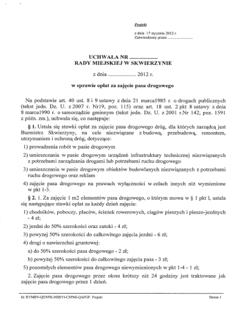 z dnia 17 stycznia 2012 r. Zatwierdzony przez .. UCHWALA NR .. RADY MIEJSKIEJ WSKWIERZYNIE Z w sprawie dnia opłat 2012 r. za zajęcie pasa drogowego Na podstawie art. 40 ust. 8 i 9 ustawy z dnia 21 marca1985 r. o drogach publicznych (tekst jedno Dz. U. z 2007 r. Nr19, poz. 115) oraz art. 18 ust. 2 pkt 8 ustawy z dnia 8 marca1990 r. o samorządzie gminnym (tekst jedno Dz. U. z 2001 r.Nr 142, poz. 1591 z późno zm.), uchwala się, co następuje: § 1. Ustala się stawki opłat za zajęcie pasa drogowego dróg, dla których zarządcą jest Burmistrz Skwierzyny, na cele niezwiązane z budową, przebudową, remontem, utrzymaniem i ochroną dróg, dotyczące: l) prowadzenia robót w pasie drogowym 2) umieszczania w pasie drogowym urządzeń infrastnlktury technicznej z potrzebami zarządzania drogami lub potrzebami ruchu drogowego 3) umieszczania w pasie drogowym obiektów budowlanych ruchu drogowego oraz rek.lam 4) zajęcie pasa drogowego na prawach w pkt 1-3. wyłączności niezwiązanych niezwiązanych z potrzebami niż wymienione w celach innych § 2. 1. Za zajęcie l m2 elementów pasa drogowego, o którym mowa w § 1 pkt l, ustala się następujące stawki opłat za każdy dzień zajęcia: 1) chodników, poboczy, placów, - 4 zł; 2) jezdni do 50% 3) powyżej 50% szerokości szerokości ścieżek rowerowych, ciągów pieszych i pieszo-jezdnych oraz zatoki - 4 zł; do całkowitego zajęcia jezdni - 6 zł; 4) drogi o nawierzchni gruntowej: a) do 50% szerokości b) powyżej 50% pasa drogowego - 2 zł; szerokości do całkowitego zajęcia pasa - 3 zł; 5) pozostałych elementów pasa drogowego niewymienionych w pkt 1-4 - l 2. Zajęcie pasa drogowego przez okres krótszy zajęcie pasa drogowego przez 1 dzień. Id: RYMBY-QEWFK-NSBYJ-CSPMJ-QAFGF, Projekt niż zł; 24 godziny jest traktowane jak Strona l § 3. 1. Za zajęcie pasa drogowego, o którym mowa w § 1 pkt 2, ustala się następujące roczne stawki opłat za 1 m2 powierzchni pasa drogowego zajętego przez rzut poziomy umieszczonego urządzenia: 1) w poprzek drogi - 15 zł; 2) wzdłuż drogi w jezdni - 12 zł; 3) wzdłuż drogi poza jezdnią - 10 zł; 4) wzdłuż drogi poza jezdnią, chodnikiem i drogą rowerową - 8 zł. 2. Za umieszczenie w pasie drogowym sieci elektroenergetycznej wysokiego napięcia ustala się roczną stawkę opłaty za 1 m2 powierzchni pasa drogowego zajętego przez rzut poziomy umieszczonego urządzenia w wysokości - 1 zł. ° 3. Roczne stawki opłat w wysokości określonej w ust. 1 i 2 obejmują pełny rok kalendarzowy. Za niepełny rok kalendarzowy wysokość rocznych stawek obliczana jest proporcjonalnie do liczby miesięcy umieszczenia urządzenia w pasie drogowym. pasa drogowego, o którym mowa w § 1 pkt 3, ustala się następującą stawkę opłat za każdy dzień zajęcia 1 m2 powierzchni pasa drogowego zajętego przez rzut poziomy obiektu budowlanego, niezwiązanego z potrzebami zarządzania drogami lub potrzebami ruchu drogowego - 0,50 zł. § 4. 1. Za zajęcie 2. Za każdy dzień umieszczenia reklamy w pasie drogowym: 1) umieszczonej równolegle do osi pasa drogowego - 0,50 2) umieszczonej prostopadle lub 1 m2; ukośnie zł za 1 m2; w stosunku do osi pasa drogowego - 1 zł za 3) przenośne, ustawiane w pasie drogowym tzw. "potykacze" - 0,70 zł za 1 m2. 3. Ustala się zerową stawkę opłaty za umieszczenie w pasie drogowym reklamy (tablicy inf01macyjnej) zawierającej informacje o gminie, powiecie lub województwie w postaci planów, tablic, plansz, itp. § 5. Traci moc Uchwała Nr IV/23/11 Rady Miejskiej w Skwierzynie z dnia 20 stycznia 2011 r. w sprawie wysokości stawek opłat za zajęcie pasa drogowego. § 6. Wykonanie uchwały powierza się § 7. Uchwała wchodzi w życie po Urzędowym Województwa Lubuskiego. Burmistrzowi Skwierzyny. upływie 14 dni od ogłoszenia wDzienniku / Id: RYMBV-QEWFK-NSBYI-CSPMI-QAFGF. Projekt Strona 2 Przewodniczący Rady Miejskiej Stanisław Id: RYMBV-QEWFK-NSBYI-CSPMI-QAFGF. Projekt Rudo Strona 3 UZASADNIENIE Podjęcie uchwały ma na celu zmianę wysokości stawek opłat za zajęcie pasa drogowego na cele niezwiązane z budową, przebudową, remontem, utrzymaniem i ochroną dróg. Zaproponowane nowe stawki opłat za zajęcie pasa drogowego w zakresie umieszczenia urządzeń w pasie drogowym (opłaty roczneL stawka została obniżona z 20,00 zł do odpowiednio: - w poprzek drogi - 15 zł; - wzdłuż drogi w jezdni - 12 zł; - wzdłuż drogi poza jezdnią - 10 zł; - wzdłuż drogi poza jezdnią, chodnikiem i drogą rowerową - 8 zł. Działanie takie wpłynie na obniżenie kosztów inwestycji polegający na wymianie i budowie nowych sieci, które muszą ponosić właściciele tych sieci. W uchwale wprowadzono również zerową stawkę opłaty za zajęcie pasa drogowego dla reklam i urządzeń umieszczanych przez Gminę Skwierzyna oraz dla reklam promujących imprezy kulturalno-oświatowe organizowane przez jednostki samorządu terytorialnego i instytucje im podległe. Zaproponowano również obniżenia stawek opłat za zajęcie pasa drogowego na cele nie związane z budową, przebudową, remontem, utrzymaniem i ochroną dróg. Dotychczas stawki opłat wyglądały następująco: - zajęcie - zajęcie - zajęcie jezdni do 50% szerokości - 7,00zł jezdni powyżej 50% szerokości -10,00zł Powyższe stawki odnosiły się również do chodników, poboczy, placów, zatok postojowych i autobusowych, ścieżek rowerowych i ciągów pieszych. Stawka opłat za pozostałe elementy pasa drogowego (trawniki, pobocza gruntowe) wynosiła 1,00 zł. Nowe stawki opłat wynoszą odpowiednio: - chodników, poboczy, placów, ścieżek rowerowych, ciągów pieszych i pieszojezdnych - 4 zł; zajęcie jezdni do 50% szerokości oraz zatoki - 4 zł; 50% szerokości do całkowitego zajęcia jezdni - 6 zł; zajęcie drogi o nawierzchni gruntowej: a) do 50% szerokości pasa drogowego - 2 zł; b) powyżej 50% szerokości do całkowitego zajęcia pasa - 3 zł; - zajęcie pozostałych elementó
