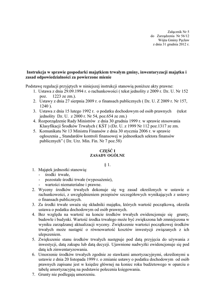 Załącznik Nr 5 do Zarządzenia Nr 56/12 Wójta Gminy Pęcław z dnia 31 grudnia 2012 r. Instrukcja w sprawie gospodarki majątkiem trwałym gminy, inwentaryzacji majątku i zasad odpowiedzialności za powierzone mienie Podstawę regulacji przyjętych w niniejszej instrukcji stanowią poniższe akty prawne: 1. Ustawa z dnia 29.09.1994 r. o rachunkowości ( tekst jednolity z 2009 r. Dz. U. Nr 152 poz. 1223 ze zm.). 2. Ustawy z dnia 27 sierpnia 2009 r. o finansach publicznych ( Dz. U. Z 2009 r. Nr 157, 1240 ). 3. Ustawa z dnia 15 lutego 1992 r. o podatku dochodowym od osób prawnych (tekst jednolity Dz. U. z 2000 r. Nr 54, poz.654 ze zm.) 4. Rozporządzenie Rady Ministrów z dnia 30 grudnia 1999 r. w sprawie stosowania Klasyfikacji Środków Trwałych ( KŚT ) (Dz. U. z 1999 Nr 112 poz.1317 ze zm. 5. Komunikatu Nr 13 Ministra Finansów z dnia 30 stycznia 2006 r. w sprawie ogłoszenia „ Standardów kontroli finansowej w jednostkach sektora finansów publicznych” ( Dz. Urz. Min. Fin. Nr 7 poz.58) CZĘŚĆ I ZASADY OGÓLNE § 1. 1. Majątek jednostki stanowią: środki trwałe, pozostałe środki trwałe (wyposażenie), wartości niematerialne i prawne. 2. Wyceny środków trwałych dokonuje się wg zasad określonych w ustawie o rachunkowości, z uwzględnieniem przepisów szczegółowych wynikających z ustawy o finansach publicznych. 3. Za środki trwałe uważa się składniki majątku, których wartość początkową, określa ustawa o podatku dochodowym od osób prawnych. 4. Bez względu na wartość na koncie środków trwałych ewidencjonuje się grunty, budowle i budynki. Wartość środka trwałego może być zwiększona lub zmniejszona w wyniku zarządzanej aktualizacji wyceny. Zwiększenie wartości początkowej środków trwałych może nastąpić o równowartość kosztów inwestycji związanych z ich ulepszeniem. 5. Zwiększenie stanu środków trwałych następuje pod datą przyjęcia do używania z inwestycji, datą zakupu lub datą decyzji. Ujawnione nadwyżki ewidencjonuje się pod datą ich zinwentaryzowania. 6. Umorzenie środków trwałych zgodnie ze stawkami amortyzacyjnymi, określonymi u ustawie z dnia 20 listopada 1999 r. o zmianie ustawy o podatku dochodowym od osób prawnych zapisane jest w księdze głównej na koniec roku budżetowego w oparciu o tabelę amortyzacyjną na podstawie polecenia księgowania. 7. Grunty nie podlegają umorzeniu. 8. Ewidencja środków trwałych prowadzona jest komputerowo. 9. Pozostałe środki trwałe w używaniu (wyposażenie – przedmioty), wycenia się wg cen zakupu brutto, tj. łącznie z podatkiem VAT. 10. Pozostałe środki trwałe, o wartości nieprzekraczającej wielkości stanowiącej dolną granicę środka trwałego, umarza się w pełnej wartości poprzez spisanie w koszty w miesiącu przyjęcia do używania. 11. Ustala się dolną granicę wartości pozostałych środków trwałych podlegających ewidencji ilościowo- wartościowej na poziomie 10% wartości środków trwałych określonych odrębnymi przepisami.( na dzień sporządzania instrukcji dolna granica środka trwałego zgodnie z ustawą o podatku dochodowym od osób prawnych wynosi 3.500 zł×10%= 350 zł) Ustalona granica może ulec zmianie w przypadku zmiany ww. przepisów. 12. Ewidencją ilościowo –wartościową należy objąć, bez względu na ich wartość, składniki majątkowe zaliczane do pozostałych środków trwałych obejmujące wyposażenie biur, jak: meble biurowe (szafy, biurka, krzesła itp.), komputery, maszyny liczące i piszące itp.), 13. Dla pozostałych środków trwałych nie wymienionych w pkt.11 i 12 ( z wyjątkiem drobnych jak: dziurkacze, nożyczki, zszywacze, itp.), prowadzona jest ewidencja ilościowa. Na rachunkach, na podstawie których dokonano zakupu pozostałych środków trwałych ( wyposażenia), należy dokładnie opisać komu przekazano środek do użytku oraz zamieścić klauzulę o treści : „wpisano do ewidencji ilościowej pokój nr….. poz. ….. nr …. data ….. podpis ….. lub ujęto w ewidencji ilościowej , pokój nr …. poz. …… data ….. podpis …..”. Imię i nazwisko osoby materialnie odpowiedzialnej. CZĘŚĆ II ODPOWIEDZIALNOŚĆ ZA SKŁADNIKI MIENIA § 2. 1. Odpowiedzialność za należyte zabezpieczenie majątku gminy ponosi Sekretarz Gminy, na którym również ciąży obowiązek nadzoru nad właściwą eksploatacją majątku i zabezpieczeniem go przed kradzieżą i zniszczeniem. 2. Odpowiedzialność za właściwą eksploatację i ochronę składników majątkowych w czasie godzin pracy ponoszą pracownicy, którym pieczy składniki te powierzono w związku z zajmowanym stanowiskiem. ( w Urzędzie – pracownicy Urzędu). 3. Odpowiedzialność za majątek gminy używany przez jednostki Ochotniczych Straży Pożarnych ponoszą Komendanci poszczególnych jednostek, nadzór prowadzi – Inspektor d / s Bezpieczeństwa i zarządzania kryzysowego. 4. Odpowiedzialność za majątek gminy używany przez Kluby Sportowe i prowadzenie na bieżąco jego ewidencji ponoszą Prezesi poszczególnych klubów. § 3. 1. Pozostałe środki trwałe objęte ewidencją ilościowo - wartościową wyposażenia biurowego winny być przypisane do każdego pomieszczenia z osobna i ujęte w spisie inwentarzowym. 2. Spis inwentarzowy, oprócz numeru pomieszczenia, powinien określać rodzaj ilość składników wyposażenia, ich numer inwentarzowy (dot. majątku podlegającego ewidencji ilościowo - wartościowej) oraz nazwiska i imiona pracowników, których pieczy składniki te powierzono. Spis taki, opatrzony pieczęcią jednostki organizacyjnej (Urząd Gminy Pęcław lub OSP, Klub............) i podpisami osób odpowiedzialnych umieszcza się w widocznym miejscu w każdym pomieszczeniu ( wzór „Spisu inwentarza” stanowi Załącznik Nr 1 do niniejszej Instrukcji). 3. Wszelkie zmiany w stanie wyposażenia danego pomieszczenia biurowego lub innego mogą nastąpić za wiedzą: - w Urzędzie Gminy – Sekreta