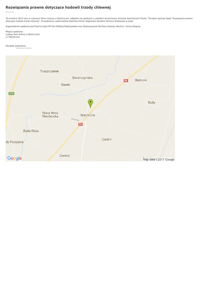 Rozwiązania prawne dotyczące hodowli trzody chlewnej 2013-11-13 10 września 2013 roku w Luduwym Domu Kultury w Niechcicach, odbędzie się spotkanie z udziałem wiceministra rolnictwa Kazimierzem Plocke. Tematem dyskusji będą "Rozwiązania prawne dotyczące hodowli trzody chlewnej". W wydarzeniu udział weźmie Kazimierz Perek, Regionalny Dyrektor Ochrony Środowiska w Łodzi. Organizatorem spotkania jest Poseł na Sejm RP Pani Elżbieta Radziszewska oraz Stowarzyszenie Na Rzecz Rozwoju Niechcic i Gminy Rozprza. Miejsce spotkania: Ludowy Dom Kultury w Niechcicach, ul. Poprzeczna. Początek wydarzenia 2013-09-10 10:00:00