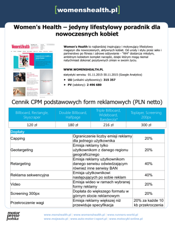 [womenshealth.pl] Women's Health – jedyny lifestylowy poradnik dla nowoczesnych kobiet Women's Health to najbardziej inspirujący i motywujący lifestylowy magazyn dla nowoczesnych, aktywnych kobiet. Od urody i stylu przez seks i partnerstwo po fitness i zdrowe odżywianie - "WH" dostarcza młodym, ambitnym kobietom komplet narzędzi, dzięki którym mogą niemal natychmiast dokonać pozytywnych zmian w swoim życiu. WWW.WOMENSHEALTH.PL statystyki serwisu 01.11.2015-30.11.2015 (Google Analytics) UU (unikalni użytkownicy): 315 357 PV (odsłony): 2 496 680 Cennik CPM podstawowych form reklamowych (PLN netto) Billboard, Rectangle, Skyscraper 120 zł Double Billboard, Halfpage Ce 180 zł Triple Billboard, Wideboard, Banderola* 216 zł Toplayer, Screening 200px 300 zł Dopłaty Capping Geotargeting Retargeting Reklama sekwencyjna Video Screening 300px Przekroczenie wagi Ograniczenie liczby emisji reklamy 20% dla jednego użytkownika Emisja reklamy tylko użytkownikom z danego regionu 20% geograficznego Emisja reklamy użytkownikom danego serwisu odwiedzającym 40% również inne serwisy BAN Emisja użytkownikowi 40% następujących po sobie reklam Emisja wideo w ramach wybranej 20% formy reklamy Dopłata do większego formatu w 20% górnym slocie reklamowym Emisja reklamy większej niż 20% za każde 10 przewiduje specyfikacja kb przekroczenia www.menshealth.pl | www.womenshealth.pl | www.runners-world.pl www.mojeauto.pl | www.auto-motor-i-sport.pl | www.motocykl-online.pl