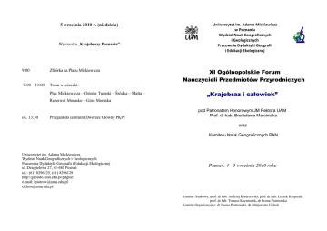 5 września 2010 r. (niedziela) Wycieczka „Krajobrazy Poznania” 9:00 Zbiórka na Placu Mickiewicza 9:00 – 13:00 Trasa wycieczki: Plac Mickiewicza – Ostrów Tumski – Śródka – Malta – Uniwersytet im. Adama Mickiewicza w Poznaniu Wydział Nauk Geograficznych i Geologicznych Pracownia Dydaktyki Geografii i Edukacji Ekologicznej XI Ogólnopolskie Forum Nauczycieli Przedmiotów Przyrodniczych „Krajobraz i człowiek” Rezerwat Morasko – Góra Moraska ok. 13:30 Przejazd do centrum (Dworzec Główny PKP) pod Patronatem Honorowym JM Rektora UAM Prof. dr hab. Bronisława Marciniaka oraz Komitetu Nauk Geograficznych PAN Uniwersytet im. Adama Mickiewicza Wydział Nauk Geograficznych i Geologicznych Pracownia Dydaktyki Geografii i Edukacji Ekologicznej ul. Dzięgielowa 27, 61-680 Poznań tel.: (61) 8296225, (61) 8296128 http://geoinfo.amu.edu.pl/pdgiee/ e-mail: [email protected] [email protected] Poznań, 4 - 5 września 2010 roku Komitet Naukowy: prof. dr hab. Andrzej Kostrzewski, prof. dr hab. Leszek Kasprzak, prof. dr hab. Tomasz Kaczmarek, dr Iwona Piotrowska Komitet Organizacyjny: dr Iwona Piotrowska, dr Małgorzata Cichoń 4 września 2010 r. (sobota) od 9:00 10:00 – 10:25 Rejestracja uczestników Forum Miejsce obrad: Uniwersytet im. Adama Mickiewicza, Collegium Geographicum im. Prof. St. Pawłowskiego, Wydział Nauk Geograficznych i Geologicznych, Aula prof. B. Krygowskiego, 61-680 Poznań, ul. Dzięgielowa 27 Uroczyste otwarcie XI Ogólnopolskiego Forum Nauczycieli Przedmiotów Przyrodniczych powitanie uczestników wystąpienia okolicznościowe 10:30 – 11:00 Georóżnorodność i jej znaczenie w studiach krajobrazowych 11:05 – 11:35 Kształtowanie krajobrazu i jego degradacja 11:35 – 12:05 Przerwa kawowa 12:10 – 12:40 Różnorodność biologiczna w krajobrazach naturalnych i antropogenicznych 14:30 – 15:25 Przerwa obiadowa 15:30 – 16:00 Strefy krajobrazowe Ziemi 16:05 – 16:35 Krajobraz kulturowy w pradziejach oraz metody jego rekonstrukcji prof. dr hab. Zbigniew Zwoliński (WNGiG UAM) dr Iwona Hildebrandt-Radke (WNGiG UAM) 16:40 – 17:10 Meteoryt Morasko – osobliwość obszaru Poznania 17:10 – 17:40 Przejście do Instytutu Geologii – wystawa „Meteoryt Morasko” 17:40 – 17:55 Przerwa kawowa prof. dr hab. Wojciech Stankowski (WNGiG UAM) prof. dr hab. Andrzej Kostrzewski (WNGiG UAM) Warsztaty multimedialne – Krajobraz i człowiek prof. dr hab. Leon Kozacki (WNGiG UAM) (Nowoczesne technologie w nauczaniu o krajobrazie) Sale komputerowe 1. Obieg wody w przyrodzie i rzeźbotwórcza działalność rzek (Daria Manikowska) prof. dr hab. Bogdan Jackowiak (Wydział Biologii UAM) Reżim rzek i jego środowiskowe przemiany 13:20 – 13:50 Świat dźwięków wczoraj i dziś 13:55 – 14:25 dr Dariusz Wrzesiński (WNGiG UAM) prof. dr hab. Rufin Makarewicz (Wydział Fizyki UAM) Badania wody, osadów i gruntów - czyli grunt to dobra woda! prof. dr hab. Przemysław Niedzielski (Wydział Chemii UAM) 2. Krajobraz polodowcowy (na przykładzie Wielkopolski) (Marta Łapińska) 18:00 – 19:00 12:45 – 13:15 3. Roślinność strefy międzyzwrotnikowej (Szymon Galas) 4. Zróżnicowanie świata zwierzęcego na kuli ziemskiej (Marcin Bernas) 5. Pustynie na Ziemi (Elżbieta Fudala) 6. Krajobraz wulkaniczny (Katarzyna Kubiak) 7. Krajobraz antropogeniczny (Agnieszka Majkowska)