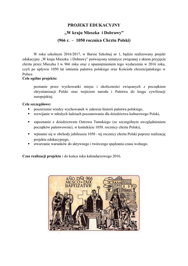 PROJEKT EDUKACYJNY „W kraju Mieszka i Dobrawy” (966 r. – 1050 rocznica Chrztu Polski) W roku szkolnym 2016/2017, w Bursie Szkolnej nr 1, będzie realizowany projekt edukacyjny „W kraju Mieszka i Dobrawy” poświęcony tematyce związanej z aktem przyjęcia chrztu przez Mieszka I w 966 roku oraz z upamiętnieniem tego wydarzenia w 2016 roku, czyli po upływie 1050 lat istnienia państwa polskiego oraz Kościoła chrześcijańskiego w Polsce. Cele ogólne projektu: poznanie przez wychowanki miejsc i okoliczności związanych z początkiem chrystianizacji Polski oraz wejściem narodu i Państwa do kręgu cywilizacji europejskiej. Cele szczegółowe: poszerzenie wiedzy wychowanek w zakresie historii państwa polskiego, rozwijanie w młodych ludziach poszanowania dla dziedzictwa kulturowego Polski, zapoznanie z dziedzictwem Ostrowa Tumskiego (ze szczególnym uwzględnieniem początków państwowości, w kontekście 1050. rocznicy chrztu Polski), wpisanie się w obchody jubileuszu 1050 - tej rocznicy chrztu Polski poprzez realizację projektu edukacyjnego, stwarzanie warunków do aktywnego i twórczego spędzania czasu wolnego. Czas realizacji projektu : do końca roku kalendarzowego 2016.
