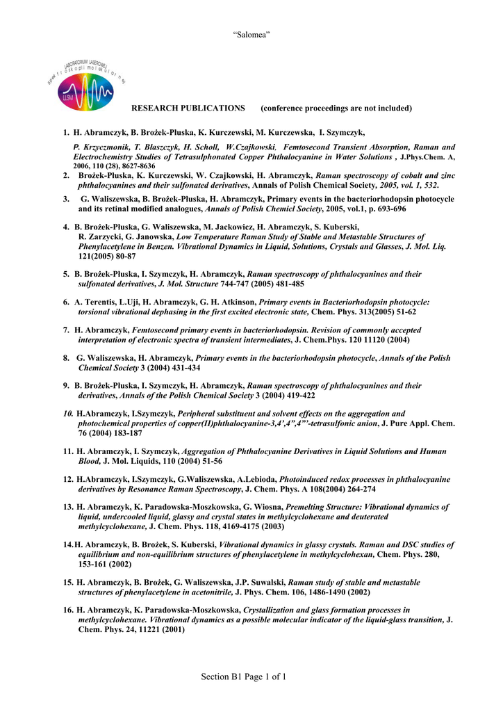 “Salomea” RESEARCH PUBLICATIONS (conference proceedings are not included) 1. H. Abramczyk, B. Brożek-Płuska, K. Kurczewski, M. Kurczewska, I. Szymczyk, P. Krzyczmonik, T. Błaszczyk, H. Scholl, W.Czajkowski, Femtosecond Transient Absorption, Raman and Electrochemistry Studies of Tetrasulphonated Copper Phthalocyanine in Water Solutions , J.Phys.Chem. A, 2006, 110 (28), 8627-8636 2. Brożek-Płuska, K. Kurczewski, W. Czajkowski, H. Abramczyk, Raman spectroscopy of cobalt and zinc phthalocyanines and their sulfonated derivatives, Annals of Polish Chemical Society, 2005, vol. 1, 532. 3. G. Waliszewska, B. Brożek-Płuska, H. Abramczyk, Primary events in the bacteriorhodopsin photocycle and its retinal modified analogues, Annals of Polish Chemicl Society, 2005, vol.1, p. 693-696 4. B. Brożek-Płuska, G. Waliszewska, M. Jackowicz, H. Abramczyk, S. Kuberski, R. Zarzycki, G. Janowska, Low Temperature Raman Study of Stable and Metastable Structures of Phenylacetylene in Benzen. Vibrational Dynamics in Liquid, Solutions, Crystals and Glasses, J. Mol. Liq. 121(2005) 80-87 5. B. Brożek-Płuska, I. Szymczyk, H. Abramczyk, Raman spectroscopy of phthalocyanines and their sulfonated derivatives, J. Mol. Structure 744-747 (2005) 481-485 6. A. Terentis, L.Uji, H. Abramczyk, G. H. Atkinson, Primary events in Bacteriorhodopsin photocycle: torsional vibrational dephasing in the first excited electronic state, Chem. Phys. 313(2005) 51-62 7. H. Abramczyk, Femtosecond primary events in bacteriorhodopsin. Revision of commonly accepted interpretation of electronic spectra of transient intermediates, J. Chem.Phys. 120 11120 (2004) 8. G. Waliszewska, H. Abramczyk, Primary events in the bacteriorhodopsin photocycle, Annals of the Polish Chemical Society 3 (2004) 431-434 9. B. Brożek-Płuska, I. Szymczyk, H. Abramczyk, Raman spectroscopy of phthalocyanines and their derivatives, Annals of the Polish Chemical Society 3 (2004) 419-422 10. H.Abramczyk, I.Szymczyk, Peripheral substituent and solvent effects on the aggregation and photochemical properties of copper(II)phthalocyanine-3,4’,4”,4”’-tetrasulfonic anion, J. Pure Appl. Chem. 76 (2004) 183-187 11. H. Abramczyk, I. Szymczyk, Aggregation of Phthalocyanine Derivatives in Liquid Solutions and Human Blood, J. Mol. Liquids, 110 (2004) 51-56 12. H.Abramczyk, I.Szymczyk, G.Waliszewska, A.Lebioda, Photoinduced redox processes in phthalocyanine derivatives by Resonance Raman Spectroscopy, J. Chem. Phys. A 108(2004) 264-274 13. H. Abramczyk, K. Paradowska-Moszkowska, G. Wiosna, Premelting Structure: Vibrational dynamics of liquid, undercooled liquid, glassy and crystal states in methylcyclohexane and deuterated methylcyclohexane, J. Chem. Phys. 118, 4169-4175 (2003) 14. H. Abramczyk, B. Brożek, S. Kuberski, Vibrational dynamics in glassy crystals. Raman and DSC studies of equilibrium and non-equilibrium structures of phenylacetylene in methylcyclohexan, Chem. Phys. 280, 153-161 (2002) 15. H. Abramczyk, B. Brożek, G. Waliszewska, J.P. Suwalski, Raman study of stable and metastable structures of phenylacetylene in acetonitrile, J. Phys. Chem. 106, 1486-1490 (2002) 16. H. Abramczyk, K. Paradowska-Moszkowska, Crystallization and glass formation processes in methylcyclohexane. Vibrational dynamics as a possible molecular indicator of the liquid-glass transition, J. Chem. Phys. 24, 11221 (2001) Section B1 Page 1 of 1 “Salomea” 17. H. Abramczyk, K. Paradowska-Moszkowska, The correlation between the phase transitions and vibrational properties by Raman spectroscopy: liquid-solid b and solid b-solid a acetonitrile transitions, Chem. Phys. 265, 177-191 (2001) 18. H. Abramczyk, B. Brożek, K. Paradowska-Moszkowska, G. Waliszewska, Phase transition and vibrational dynamics by Raman spectroscopy, Recent. Res. Devel. Chem. Physics 1, 101-121 (2000), ISBN: 81-86846-92-1 19. K. Paradowska-Moszkowska, H. Abramczyk, Liquid crystalline transition or liquid-solid interface vibrational dynamics of diphenylacetylene in solutions by Raman spectroscopy?, Chem. Phys. 262, 325-336 (2000) 20. H. Abramczyk, Raman Spectroscopy applications in radiation chemistry and other research areas, Wiadomości Chemiczne 54, 326 (2000) 21. H. Abramczyk, G. Waliszewska, B. Brożek, Structural order and vibrational relaxation of phenylacetylene in benzene in liquid solutions and frozen matrices at low temperatures. Raman spectra of phenylacetylene in benzene at 77K, J. Phys. Chem. 103, 7580 (1999) 22. H. Abramczyk, B. Brożek, Is there a correlation between phase transition of phenylacetylene in liquids and frozen matrices and vibrational dynamics?, Chem. Phys. 250, 145-154 (1999) 23. H. Abramczyk, B. Brożek, Vibrational dynamics in liquids and frozen matrices. Concentration and solvent effects in phenylacetylene by low temperature Raman spectroscopy, Chem. Phys. 250, 35-45 (1999) 24. H. Abramczyk, M. Kołodziejski, G. Waliszewska, Vibrational relaxation of β-carotene in acetonitrile solution and in carrot in situ, Journal of Molecular Liquids 79, 223-233 (1999) 25. H. Abramczyk, G. Waliszewska, M. Kołodziejski, II. Raman spectra of phenylacetylene in acetonitrile and methylcyclohexane at low temperatures. Structural order and vibrational relaxation in frozen matrices at 77K, J. Phys. Chem. 102, 7765-7771 (1998) 26. M. Kołodziejski, G. Waliszewska, H. Abramczyk, I. Vibrational Relaxation in Liquid Phenylacetylene, J. Phys. Chem. 102, 1918-1926 (1998) 27. H. Abramczyk, M. Kołodziejski, G. Waliszewska, Vibrational relaxation of diphenylacetylene at low temperatures, Chemical Physics 228, 313-322 (1998) 28. M. Kołodziejski, H. Abramczyk, Spectroscopy of an excess electron in 1-propanol-methylcyclohexane, J. Mol. Structure 436-437, 543-555 (1998) 29. H. Abramczyk, M. Kołodziejski, G. Waliszewska, Vibrational relaxation in diphenylacetylene in liquid solutions, Journal of Molecular Liquids 71, 61-71 (1997) 30. M. Kołodziejski, G. Waliszewska, H. Abramczyk, Vibrational dephasing in bromocyc