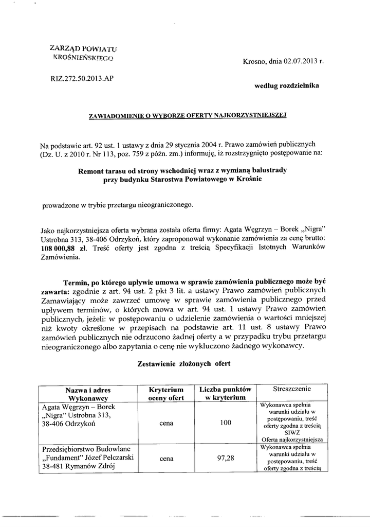 ZARZĄD PO\t\i'IATU KROŚNIEŃSKJEG<J Krosno, dnia 02.07.2013 r. RIZ.272.50.2 013.AP według rozdzielnika ZAWIADOMIE NIE O WYBORZE OFERTY NAJKORZYST NIEJSZEJ Na podstawie art. 92 ust. 1 ustawy z dnia 29 stycznia 2004 r. Prawo zamówień publicznych (Dz. U. z 2010 r. Nr 113, poz. 759 z późn. zm.) informuję, iż rozstrzygnięto postępowanie na: Remont tarasu od strony wschodniej wraz z wymianą balustrady przy budynku Starostwa Powiatowego w Krośnie prowadzone w trybie przetargu nieograniczon ego. Jako najkorzystnie jsza oferta wybrana została oferta firmy: Agata Węgrzyn - Borek „Nigra" U strobna 313, 3 8-406 Odrzykoń, który zaproponował wykonanie zamówienia za cenę brutto: 108 000,88 zł. Treść oferty jest zgodna z treścią Specyfikacji Istotnych Warunków Zamówienia. Termin, po którego upływie umowa w sprawie zamówienia publicznego może być zawarta: zgodnie z art. 94 ust. 2 pkt 3 lit. a ustawy Prawo zamówień publicznych Zamawiający może zawrzeć umowę w sprawie zamówienia publicznego przed upływem terminów, o których mowa w art. 94 ust. 1 ustawy Prawo zamówień publicznych , jeżeli: w postępowaniu o udzielenie zamówienia o wartości mniejszej niż kwoty określone w przepisach na podstawie art. 11 ust. 8 ustawy Prawo zamówień publicznych nie odrzucono żadnej oferty a w przypadku trybu przetargu nieograniczo nego albo zapytania o cenę nie wykluczono żadnego wykonawcy . Zestawienie Nazwa i adres Wykonawcy Agata Węgrzyn - Borek „Nigra" Ustrobna 313, 38-406 Odrzykoń złożonych Kryterium oceny ofert ofert Liczba punktów w kryterium Wykonawca spełnia warunki udziału w cena 100 cena 97,28 Przedsiębiorstwo Budowlane „Fundament" Józef Pelczarski 38-481 Rymanów Zdrój Streszczenie postępowaniu, treść oferty zgodna z treścią SIWZ Oferta najkorzystniejsza Wykonawca spełnia warunki udziału w postępowaniu, treść oferty zgodna z treścią IPosada Górna, ul. 3 Maja 172 SIWZ Na podstawie art. 27 ust. 2 ustawy z dnia 29 stycznia 2004 r. Prawo zamówień publicznych (Dz. U. z 2010 r. Nr 113, poz. 759 z późn. zm.) proszę o niezwłoczne potwierdzenie otrzymania zawiadomienia poprzez odesłanie faksem niniejszego pisma z adnotacją „otrzymałem" i podpisem osoby odbierającej.
