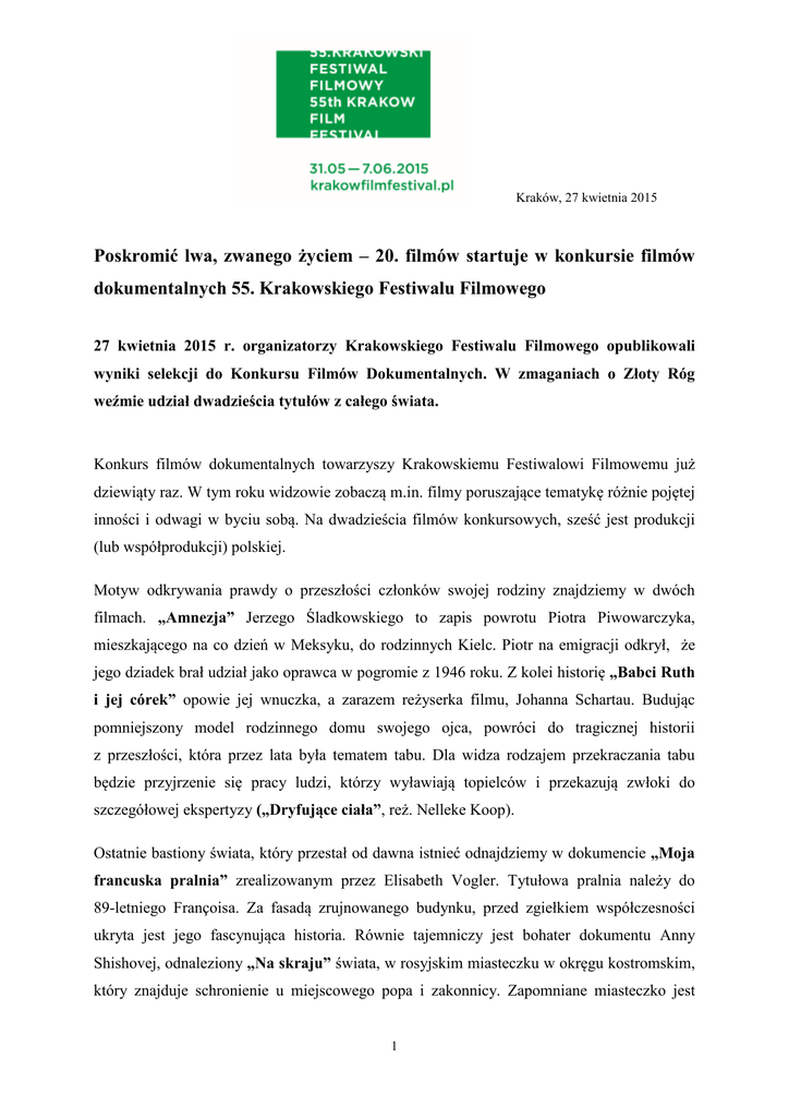 Kraków, 27 kwietnia 2015 Poskromić lwa, zwanego życiem – 20. filmów startuje w konkursie filmów dokumentalnych 55. Krakowskiego Festiwalu Filmowego 27 kwietnia 2015 r. organizatorzy Krakowskiego Festiwalu Filmowego opublikowali wyniki selekcji do Konkursu Filmów Dokumentalnych. W zmaganiach o Złoty Róg weźmie udział dwadzieścia tytułów z całego świata. Konkurs filmów dokumentalnych towarzyszy Krakowskiemu Festiwalowi Filmowemu już dziewiąty raz. W tym roku widzowie zobaczą m.in. filmy poruszające tematykę różnie pojętej inności i odwagi w byciu sobą. Na dwadzieścia filmów konkursowych, sześć jest produkcji (lub współprodukcji) polskiej. Motyw odkrywania prawdy o przeszłości członków swojej rodziny znajdziemy w dwóch filmach. „Amnezja” Jerzego Śladkowskiego to zapis powrotu Piotra Piwowarczyka, mieszkającego na co dzień w Meksyku, do rodzinnych Kielc. Piotr na emigracji odkrył, że jego dziadek brał udział jako oprawca w pogromie z 1946 roku. Z kolei historię „Babci Ruth i jej córek” opowie jej wnuczka, a zarazem reżyserka filmu, Johanna Schartau. Budując pomniejszony model rodzinnego domu swojego ojca, powróci do tragicznej historii z przeszłości, która przez lata była tematem tabu. Dla widza rodzajem przekraczania tabu będzie przyjrzenie się pracy ludzi, którzy wyławiają topielców i przekazują zwłoki do szczegółowej ekspertyzy („Dryfujące ciała”, reż. Nelleke Koop). Ostatnie bastiony świata, który przestał od dawna istnieć odnajdziemy w dokumencie „Moja francuska pralnia” zrealizowanym przez Elisabeth Vogler. Tytułowa pralnia należy do 89-letniego Françoisa. Za fasadą zrujnowanego budynku, przed zgiełkiem współczesności ukryta jest jego fascynująca historia. Równie tajemniczy jest bohater dokumentu Anny Shishovej, odnaleziony „Na skraju” świata, w rosyjskim miasteczku w okręgu kostromskim, który znajduje schronienie u miejscowego popa i zakonnicy. Zapomniane miasteczko jest 1 ukryte w cieniu wielkiego więzienia, choć według zapewnień mieszkańców stanowi raj na ziemi. Takim rajem miał być dla emerytowanych marynarzy dom położony nad samym morzem, jednak budynek to nie statek, a zamknięci „Na redzie” (reż. Alessandro Abba Legnazzi) leciwi marynarze tęsknie obserwują niespokojne fale, snując marzenia o powrocie na głębokie wody. W portowym miasteczku na Kubie mieszkają bohaterowie dokumentu „Casa Blanca” Aleksandry Maciuszek. Niedołężna Nelsa i jej trzydziestoletni, dotknięty zespołem Downa syn Vladimir. Mężczyzna musi zająć się matką, w innym wypadku będą musieli się rozstać. W ramach konkursu będzie można zobaczyć dwa filmy izraelskie. W pierwszym z nich, zatytułowanym „Ostatni przystanek” reżyserka, Julie Shles podgląda odwiedzających główny dworzec autobusowy w Tel Awiwie, gdzie spotykają się pochodzący z całego świata Izrealczycy oraz nielegalni afrykańscy imigranci. Tworzy się niezwykła panorama współczesnego Izraela, z jego problemami oraz mieszanką narodowo-religijną. Nieco inne spotkanie sportretowała Nitzan Ofir w dokumencie „Prawie jak przyjaciółki”. W jej filmie łączą się losy dwóch dziewczynek: Żydówki i Palestynki. Początkowo internetowa znajomość przenosi się w świat rzeczywisty. Konfrontujący różne narodowości i religie jest także „Dybuk. Rzecz o wędrówce dusz” Krzysztofa Kopczyńskiego. Reżyser przez osiem lat realizował zdjęcia w Humaniu na Ukrainie, miejscu świętym dla Chasydów, których obecność zmienia to ukraińskie miasto, do głosu dochodzą lokalni nacjonaliści. Odmienność etniczna jest pokazana także w filmie Agnieszki Zwiefki „Królowa ciszy”, jedenastoletnia romska dziewczynka nie dosłyszy, nie mówi ale pomimo tych ułomności jej pasją jest taniec bollywoodzki. Terapię przez sztukę, w tym wypadku poprzez śpiew, pokazuje Peti Akar w dokumencie „Śpiewaj całym sercem”, którego bohaterowie - członkowie londyńskiego chóru - leczą się w ten sposób z depresji. Sytuację niejako odwrotną mamy w filmie „Na barkach lwa”, gdzie Graham, muzyk rockowy, dla którego muzyka jest całym światem nie może dalej pozostać na scenie ze względu na chorobę: szumy uszne. O zmaganiu się z fizycznymi przeciwnościami losu opowiadają także losy pozostałych, niezwykłych bohaterów tego filmu: 80-letniej Alice, która zaczyna fotografować po utracie wzroku i Kate, kobietybokserki, która w czasie urazów powstałych w walce uszkadza mózg, nigdy już nie wróci na ring, który był jej pasją i stara się znaleźć ukojenie w rzeźbieniu. O zmaganiach z własnymi uwarunkowaniami opowiada także Wallner Thomas w filmie „Zanim opadnie kurtyna”. Jest to zapis ostatniego spektaklu „Gardenia”, który w ciągu dwóch lat był wystawiany na deskach teatrów całego świata. Występują w nim starzejący się transseksualiści i drag queens. 2 Przy okazji tego przełomowego momentu w ich życiu opowiadają o o samotności wynikającej ztożsamości seksualnej. Z brakiem aprobaty każdego dnia walczą się także sportretowane przez Ruth Gumnit członkinie lesbijskiej społeczności w Tajlandii. W „O tym się nie mówi” opowiadają o walce o uznanie i akceptację ich orientacji seksualnej w oczach tradycyjnego buddyjskiego społeczeństwa. Podobny problem – braku akceptacji najbliższej rodziny dotyka także bohaterkę dokumentu Karoliny Bielawskiej „Mów mi Marianna”, która podejmuje niełatwą decyzję o zmianie płci i rozpoczęciu życia w zgodzie z własną seksualnością. Philip Cox wchodząc z kamerą do „Love Hotelu” pokazuje miejsca, z których korzystają – obok prostytutek i ich klientów – także przelotni kochankowie, czy szukające nowych wrażeń pary małżeńskie z długoletnim stażem. Przybytki rozkoszy są wpisane w japońską tradycję, jednak pod wpływem ostatnich konserwatywnych przemian polityczno-ob