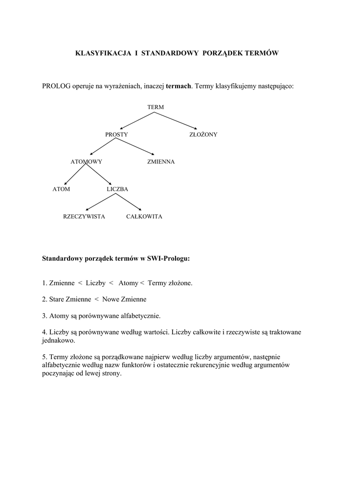 KLASYFIKACJA I STANDARDOWY PORZĄDEK TERMÓW PROLOG operuje na wyrażeniach, inaczej termach. Termy klasyfikujemy następująco: TERM PROSTY ATOMOWY ATOM RZECZYWISTA ZŁOŻONY ZMIENNA LICZBA CAŁKOWITA Standardowy porządek termów w SWI-Prologu: 1. Zmienne < Liczby < Atomy < Termy złożone. 2. Stare Zmienne < Nowe Zmienne 3. Atomy są porównywane alfabetycznie. 4. Liczby są porównywane według wartości. Liczby całkowite i rzeczywiste są traktowane jednakowo. 5. Termy złożone są porządkowane najpierw według liczby argumentów, następnie alfabetycznie według nazw funktorów i ostatecznie rekurencyjnie według argumentów poczynając od lewej strony. W SWI- Prologu mamy następujące predykaty służące do weryfikowania typu termów: var (+Term) Spełniony, jeżeli Term jest aktualnie zmienną wolną. _________________________________________________________________________________________ nonvar (+Term) Spełniony, jeżeli Term aktualnie nie jest zmienną wolną. _________________________________________________________________________________________ integer (+Term) Spełniony, jeżeli Term jest ukonkretniony liczbą całkowitą. _________________________________________________________________________________________ float (+Term) Spełniony, jeżeli Term jest ukonkretniony liczbą rzeczywistą. _________________________________________________________________________________________ number (+Term) Spełniony, jeżeli Term jest ukonkretniony liczbą całkowitą lub rzeczywistą. _________________________________________________________________________________________ atom (+Term) Spełniony, jeżeli Term jest ukonkretniony atomem. _________________________________________________________________________________________ atomic (+Term) Spełniony, jeżeli Term jest ukonkretniony atomem lub liczbą całkowitą lub rzeczywistą. _________________________________________________________________________________________ compound (+Term) Spełniony, jeżeli Term jest ukonkretniony termem złożonym. _________________________________________________________________________________________ ground (+Term) Spełniony, jeżeli Term nie zawiera zmiennych wolnych. _________________________________________________________________________________________