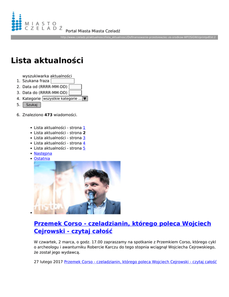 Portal Miasta Miasta Czeladź http://www.czeladz.pl/aktualnosci/lista_aktualnosci/Dofinansowanie-przedsiewziec-ze-srodkow-WFOSiGW/i/printpdf/st:2 Lista aktualności wyszukiwarka aktualności 1. Szukana fraza 2. Data od (RRRR-MM-DD) 3. Data do (RRRR-MM-DD) 4. Kategorie wszystkie kategorie ... ▼ 5. Szukaj 6. Znaleziono 473 wiadomości. Lista aktualności - strona 1 Lista aktualności - strona 2 Lista aktualności - strona 3 Lista aktualności - strona 4 Lista aktualności - strona 5 Następna Ostatnia Przemek Corso - czeladzianin, którego poleca Wojciech Cejrowski - czytaj całość W czwartek, 2 marca, o godz. 17.00 zapraszamy na spotkanie z Przemkiem Corso, którego cykl o archeologu i awanturniku Robercie Karczu do tego stopnia wciągnął Wojciecha Cejrowskiego, że został jego wydawcą. 27 lutego 2017 Przemek Corso - czeladzianin, którego poleca Wojciech Cejrowski - czytaj całość Burmistrz i radni spotkają się z mieszkańcami - czytaj całość Przed nami seria spotkań burmistrza i radnych z mieszkańcami, których motywem przewodnim będzie pytanie "Jak się żyje w Czeladzi?" 27 lutego 2017 Burmistrz i radni spotkają się z mieszkańcami - czytaj całość Ceramika Marity Benke-Gajdy w GSW Elektrownia czytaj całość Życie, codzienność, sztuka, natchnienie, podróż po zakamarkach duszy i umysłu - to niektóre z zagadnień, przybierających formę ceramicznych brył w ekspozycji "Ciągle w drodze". 24 lutego 2017 Ceramika Marity Benke-Gajdy w GSW Elektrownia - czytaj całość Powiadomienie o jakości powietrza w województwie śląskim - czytaj całość Wojewódzki Inspektorat Ochrony Środowiska w Katowicach informuje o jakości powietrza w województwie śląskim w dniach 23-26.02.2017 r. 24 lutego 2017 Powiadomienie o jakości powietrza w województwie śląskim - czytaj całość Pamięci "Żołnierzy Wyklętych" - czytaj całość W najbliższą środę, 1 marca obchodzimy Narodowy Dzień Pamięci "Żołnierzy Wyklętych". W południe w kościele św. Stanisława B.M. nastąpi odsłonięcie tablicy, poświęconej bohaterom antykomunistycznego i niepodległościowego podziemia. 24 lutego 2017 Pamięci "Żołnierzy Wyklętych" - czytaj całość Prognoza niebezpiecznych zjawisk meteorologicznych silny wiatr, oblodzenie - czytaj całość Prognoza niebezpiecznych zjawisk meteorologicznych - silny wiatr i oblodzenie. 24 lutego 2017 Prognoza niebezpiecznych zjawisk meteorologicznych - silny wiatr, oblodzenie czytaj całość Ostrzeżenie meteorologiczne nr 35 - silny wiatr - czytaj całość Instytut Meteorologii i Gospodarki Wodnej prognozuje wystąpienie silnego wiatru o średniej prędkości od 30 km/h do 45 km/h, z porywami do 90 km/h, z zachodu. 23 lutego 2017 Ostrzeżenie meteorologiczne nr 35 - silny wiatr - czytaj całość Powiadomienie o jakości powietrza w województwie śląskim - czytaj całość Wojewódzki Inspektorat Ochrony Środowiska w Katowicach informuje o jakości powietrza w województwie śląskim w dniach 22-24.02.2017 r. 23 lutego 2017 Powiadomienie o jakości powietrza w województwie śląskim - czytaj całość Czeladź oczyma mieszkańców - czytaj całość Jak się żyje w Czeladzi? Odpowiedzi na to i wiele innych pytań poznaliśmy podczas środowego spotkania w Kopalni Kultury. 23 lutego 2017 Czeladź oczyma mieszkańców - czytaj całość Powiadomienie o jakości powietrza w województwie śląskim - czytaj całość Wojewódzki Inspektorat Ochrony Środowiska w Katowicach informuje o jakości powietrza w województwie śląskim w dniach 21-22/23.02.2017 r. 22 lutego 2017 Powiadomienie o jakości powietrza w województwie śląskim - czytaj całość Lista aktualności - strona 1 Lista aktualności - strona 2 Lista aktualności - strona 3 Lista aktualności - strona 4 Lista aktualności - strona 5 Następna Ostatnia
