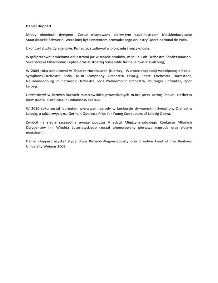 Daniel Huppert Młody niemiecki dyrygent. Został mianowany pierwszym kapelmistrzem Mecklenburgische Staatskapelle Schwerin. Wcześniej był asystentem prowadzącego orkiestry Operá national de Paris. Ukończył studia dyrygenckie. Ponadto, studiował wiolonczelę i muzykologię. Współpracował z wieloma orkiestrami już w trakcie studiów, m.in.: z Loh-Orchestra Sondershausen, Severočeská filharmonie Teplice oraz austriacką ‘ensemble für neue musik’ (Salzburg). W 2009 roku debiutował w Theater Nordhausen (Niemcy). Wkrótce rozpoczął współpracę z RadioSymphony-Orchestra Sofia, MDR Symphony Orchestra Leipzig, State Orchestra Darmstadt, Neubrandenburg Philharmonic Orchestra, Jena Philharmonic Orchestra, Thüringer Sinfoniker, Oper Leipzig. Uczestniczył w licznych kursach mistrzowskich prowadzonych m.in.: przez Jormę Panula, Herberta Blomstedta, Kurta Masur i Johannesa Kalitzke. W 2010 roku został laureatem pierwszej nagrody w konkursie dyrygenckim Symphony-Orchestra Leipzig, a także zwycięzcą German Operetta Prize for Young Conductors of Leipzig Opera. Zwrócił na siebie szczególna uwagę podczas V edycji Międzynarodowego Konkursu Młodych Dyrygentów im. Witolda Lutosławskiego (został uhonorowany pierwszą nagrodą oraz złotym medalem ). Daniel Huppert uzyskał stypendium Richard-Wagner-Society oraz Creative Fund of the Bauhaus University Weimar 2009.