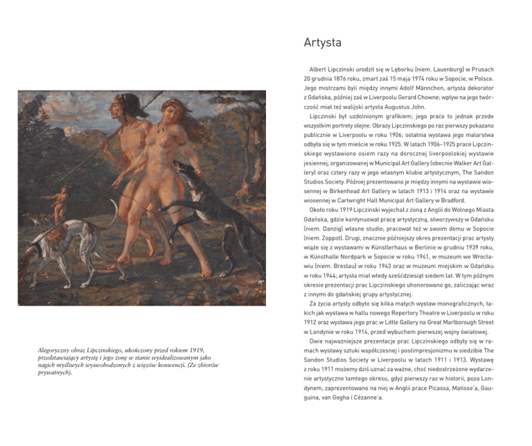 Artysta Albert Lipczinski urodził się w Lęborku (niem. Lauenburg) w Prusach 20 grudnia 1876 roku, zmarł zaś 15 maja 1974 roku w Sopocie, w Polsce. Jego mistrzami byli między innymi Adolf Männchen, artysta dekorator z Gdańska, później zaś w Liverpoolu Gerard Chowne; wpływ na jego twórczość miał też walijski artysta Augustus John. Lipczinski był uzdolnionym grafikiem; jego prace to jednak przede wszystkim portrety olejne. Obrazy Lipczinskiego po raz pierwszy pokazano publicznie w Liverpoolu w roku 1906; ostatnia wystawa jego malarstwa odbyła się w tym mieście w roku 1925. W latach 1906–1925 prace Lipczinskiego wystawiono osiem razy na dorocznej liverpoolskiej wystawie jesiennej, organizowanej w Municipal Art Gallery (obecnie Walker Art Gallery) oraz cztery razy w jego własnym klubie artystycznym, The Sandon Studios Society. Później prezentowano je między innymi na wystawie wiosennej w Birkenhead Art Gallery w latach 1913 i 1914 oraz na wystawie wiosennej w Cartwright Hall Municipal Art Gallery w Bradford. Około roku 1919 Lipczinski wyjechał z żoną z Anglii do Wolnego Miasta Gdańska, gdzie kontynuował pracę artystyczną, stworzywszy w Gdańsku (niem. Danzig) własne studio; pracował też w swoim domu w Sopocie (niem. Zoppot). Drugi, znacznie późniejszy okres prezentacji prac artysty wiąże się z wystawami w Künstlerhaus w Berlinie w grudniu 1939 roku, w Künsthalle Nordpark w Sopocie w roku 1941, w muzeum we Wrocławiu (niem. Breslau) w roku 1943 oraz w muzeum miejskim w Gdańsku w roku 1944; artysta miał wtedy sześćdziesiąt siedem lat. W tym późnym okresie prezentacji prac Lipczinskiego uhonorowano go, zaliczając wraz z innymi do gdańskiej grupy artystycznej. Za życia artysty odbyło się kilka małych wystaw monograficznych, takich jak wystawa w hallu nowego Repertory Theatre w Liverpoolu w roku 1912 oraz wystawa jego prac w Little Gallery na Great Marlborough Street w Londynie w roku 1914, przed wybuchem pierwszej wojny światowej. Dwie najważniejsze prezentacje prac Lipczinskiego odbyły się w raAlegoryczny obraz Lipczinskiego, ukończony przed rokiem 1919, przedstawiający artystę i jego żonę w stanie wyidealizowanym jako nagich myśliwych wyswobodzonych z więzów konwencji. (Ze zbiorów prywatnych). mach wystawy sztuki współczesnej i postimpresjonizmu w siedzibie The Sandon Studios Society w Liverpoolu w latach 1911 i 1913. Wystawę z roku 1911 możemy dziś uznać za ważne, choć niedostrzeżone wydarzenie artystyczne tamtego okresu, gdyż pierwszy raz w historii, poza Londynem, zaprezentowano na niej w Anglii prace Picassa, Matisse’a, Gauguina, van Gogha i Cézanne’a. Wstęp Książka, którą mają Państwo w ręku, jest opowieścią o bohemie artystycznej i o historii miłości artysty Alberta Lipczinskiego oraz jego fascynującej żony Elizabeth, historii uwikłanej w burzliwe dzieje środowisk i ruchów społecznych Liverpoolu. Kreśląc obraz wybranych ważnych motywów i wydarzeń długiego i bogatego życia, jakie było udziałem artysty, wprowadza czytelnika w niektóre wątki jego zapomnianej sztuki i talentu. Lipczinski jest nieznanym szerszym kręgom odbiorców twórcą portretów, o którym dotąd nie pisano. Pionierska praca, której się podjął autor, doprowadziła go do frapujących odkryć tak w angielskim Liverpoolu, jak i w Polsce – w Sopocie i w Gdańsku. Przebyty szlak ukazał mu zmienne losy człowieka, który stał się obcy we własnej ojczyźnie, człowieka, którego życie pod wieloma względami stanowi uniwersalne przesłanie, mówiące nam o doświadczeniu tożsamości europejskiej XX stulecia. Choć niniejsza praca prezentuje też niektóre z nieznanych dotąd dzieł tego artysty, jej tematem jest przede wszystkim niezwykłość doświadczenia tego artysty i jego epoki. Albert i Elizabeth nie mogą sobie rościć prawa do sławy czy istotnego znaczenia w dziejach; bywali przede wszystkim gośćmi przy stołach innych, dopasowując się w swych wędrówkach do gustów i poczynań gospodarzy. Doświadczenie Lipczinskiego, będące przede wszystkim doświadczeniem przybysza z zewnątrz, daje nam sposobność spojrzenia na nowo, niekonwencjonalnie na znane brytyjskiemu czytelnikowi sytuacje. Patrząc wraz z nim, możemy dostrzec wyjątkowość klubu artystycznego, do którego należał, The Sandon Studios Society w Liverpoolu, jednoczącego swych członków w duchu twórczego braterstwa; możemy też poczuć smak romantycznej przygody przeżywanej przez artystę z Cyganami w północnej Walii i doświadczyć kondycji człowieka, który znalazł się na obrzeżach rewolucyjnych ruchów społecznych w przedwojennym Liverpoolu. Doświadczenia Lipczinskiego pozwalają nam też zrozumieć gorycz wykluczenia doznanego w nowym państwie polskim, w którego granicach znalazła się jego mała ojczyzna w wyniku drugiej wojny światowej. Podczas wydarzeń, w których uczestniczyli Albert i Elizabeth, rzadko wymieniano ich imiona, a jeżeli już padały, to jedynie mi-