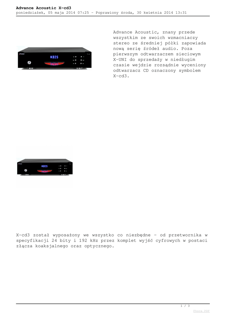 Advance Acoustic X-cd3 poniedziałek, 05 maja 2014 07:25 - Poprawiony środa, 30 kwietnia 2014 13:31 Advance Acoustic, znany przede wszystkim ze swoich wzmacniaczy stereo ze średniej półki zapowiada nową serię źródeł audio. Poza pierwszym odtwarzaczem sieciowym X-UNI do sprzedaży w niedługim czasie wejdzie rozsądnie wyceniony odtwarzacz CD oznaczony symbolem X-cd3. X-cd3 został wyposażony we wszystko co niezbędne – od przetwornika w specyfikacji 24 bity i 192 kHz przez komplet wyjść cyfrowych w postaci złącza koaksjalnego oraz optycznego. 1 / 3 Phoca PDF Advance Acoustic X-cd3 poniedziałek, 05 maja 2014 07:25 - Poprawiony środa, 30 kwietnia 2014 13:31 Wyróżnikiem X-cd3 na tle konkurencji jest niecodzienne pasmo przenoszenia, które sięga aż 45.000Hz! Podobnie jak X-UNI podobnie i X-cd3 wyposażono w szczelinowy napęd Sanyo HD850, który jest montowany w dużo droższych urządzeniach CD renomowanych, brytyjskich producentów. X-cd3 jest klasycznym odtwarzaczem CD, stąd producent postanowił nie wyposażać go w złącza USB dla komputerów lub pendrvive'ów. Te funkcje u Francuzów zostały oddelegowane do wzmacniaczy X-i60 oraz X-i90. . Cena i specyfikacja Advance Acoustic X-cd3 2 / 3 Phoca PDF Advance Acoustic X-cd3 poniedziałek, 05 maja 2014 07:25 - Poprawiony środa, 30 kwietnia 2014 13:31 3 / 3 Phoca PDF