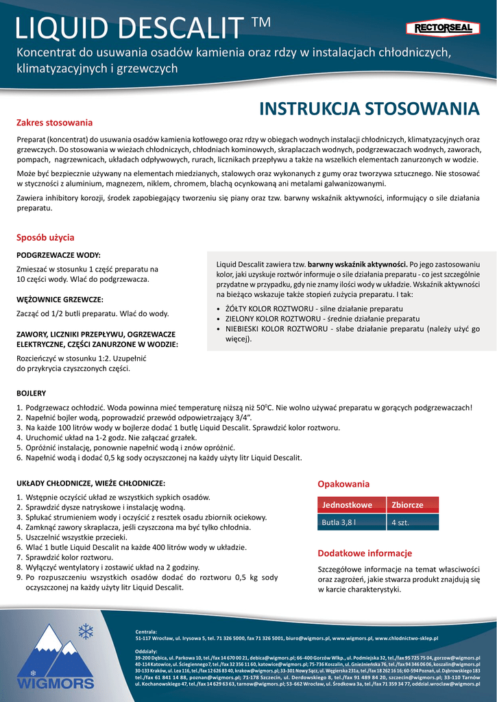 INSTRUKCJA STOSOWANIA Zakres stosowania Preparat (koncentrat) do usuwania osadów kamienia kotłowego oraz rdzy w obiegach wodnych instalacji chłodniczych, klimatyzacyjnych oraz grzewczych. Do stosowania w wieżach chłodniczych, chłodniach kominowych, skraplaczach wodnych, podgrzewaczach wodnych, zaworach, pompach, nagrzewnicach, układach odpływowych, rurach, licznikach przepływu a także na wszelkich elementach zanurzonych w wodzie. Może być bezpiecznie używany na elementach miedzianych, stalowych oraz wykonanych z gumy oraz tworzywa sztucznego. Nie stosować w styczności z aluminium, magnezem, niklem, chromem, blachą ocynkowaną ani metalami galwanizowanymi. Zawiera inhibitory korozji, środek zapobiegający tworzeniu się piany oraz tzw. barwny wskaźnik aktywności, informujący o sile działania preparatu. Sposób użycia PODGRZEWACZE WODY: Zmieszać w stosunku 1 część preparatu na 10 części wody. Wlać do podgrzewacza. WĘŻOWNICE GRZEWCZE: Zacząć od 1/2 butli preparatu. Wlać do wody. ZAWORY, LICZNIKI PRZEPŁYWU, OGRZEWACZE ELEKTRYCZNE, CZĘŚCI ZANURZONE W WODZIE: Liquid Descalit zawiera tzw. barwny wskaźnik aktywności. Po jego zastosowaniu kolor, jaki uzyskuje roztwór informuje o sile działania preparatu - co jest szczególnie przydatne w przypadku, gdy nie znamy ilości wody w układzie. Wskaźnik aktywności na bieżąco wskazuje także stopień zużycia preparatu. I tak: • ŻÓŁTY KOLOR ROZTWORU - silne działanie preparatu • ZIELONY KOLOR ROZTWORU - średnie działanie preparatu • NIEBIESKI KOLOR ROZTWORU - słabe działanie preparatu (należy użyć go więcej). Rozcieńczyć w stosunku 1:2. Uzupełnić do przykrycia czyszczonych części. BOJLERY 1. Podgrzewacz ochłodzić. Woda powinna mieć temperaturę niższą niż 500C. Nie wolno używać preparatu w gorących podgrzewaczach! 2. Napełnić bojler wodą, poprowadzić przewód odpowietrzający 3/4”. 3. Na każde 100 litrów wody w bojlerze dodać 1 butlę Liquid Descalit. Sprawdzić kolor roztworu. 4. Uruchomić układ na 1-2 godz. Nie załączać grzałek. 5. Opróżnić instalację, ponownie napełnić wodą i znów opróżnić. 6. Napełnić wodą i dodać 0,5 kg sody oczyszczonej na każdy użyty litr Liquid Descalit. UKŁADY CHŁODNICZE, WIEŻE CHŁODNICZE: 1. Wstępnie oczyścić układ ze wszystkich sypkich osadów. 2. Sprawdzić dysze natryskowe i instalację wodną. 3. Spłukać strumieniem wody i oczyścić z resztek osadu zbiornik ociekowy. 4. Zamknąć zawory skraplacza, jeśli czyszczona ma być tylko chłodnia. 5. Uszczelnić wszystkie przecieki. 6. Wlać 1 butle Liquid Descalit na każde 400 litrów wody w układzie. 7. Sprawdzić kolor roztworu. 8. Wyłączyć wentylatory i zostawić układ na 2 godziny. 9. Po rozpuszczeniu wszystkich osadów dodać do roztworu 0,5 kg sody oczyszczonej na każdy użyty litr Liquid Descalit. Opakowania Dodatkowe informacje Szczegółowe informacje na temat własciwości oraz zagrożeń, jakie stwarza produkt znajdują się w karcie charakterystyki. Centrala: 51-117 Wrocław, ul. Irysowa 5, tel. 71 326 5000, fax 71 326 5001, [email protected], www.wigmors.pl, www.chlodnictwo-sklep.pl Oddziały: 39-200 Dębica, ul. Parkowa 10, tel./fax 14 670 00 21, [email protected]; 66-400 Gorzów Wlkp., ul. Podmiejska 32, tel./fax 95 725 75 04, [email protected] 40-114 Katowice, ul. Ściegiennego 7, tel./fax 32 356 11 60, [email protected]; 75-736 Koszalin, ul. Gnieźnieńska 76, tel./fax 94 346 06 06, [email protected] 30-133 Kraków, ul. Lea 116, tel./fax 12 626 83 40, [email protected]; 33-301 Nowy Sącz, ul. Węgierska 231a, tel./fax 18 262 16 16; 60-594 Poznań, ul. Dąbrowskiego 183 tel./fax 61 841 14 88, [email protected]; 71-178 Szczecin, ul. Derdowskiego 8, tel./fax 91 489 84 20, [email protected]; 33-110 Tarnów ul. Kochanowskiego 47, tel./fax 14 629 63 63, [email protected]; 53-662 Wrocław, ul. Środkowa 3a, tel./fax 71 359 34 77, [email protected]
