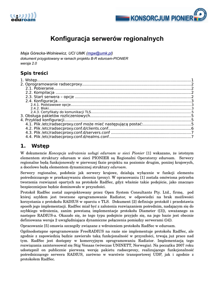 Konfiguracja serwerów regionalnych Maja Górecka-Wolniewicz, UCI UMK ([email protected]) dokument przygotowany w ramach projektu B-R eduroam-PIONIER wersja 2.0 Spis treści 1. Wstęp.................................................................................................................................1 2. Oprogramowanie radsecproxy...........................................................................................2 2.1. Pobieranie...................................................................................................................2 2.2. Kompilacja ..................................................................................................................2 2.3. Start serwera – opcje .................................................................................................2 2.4. Konfiguracja................................................................................................................3 2.4.1. Podstawowe opcje...................................................................................................................3 2.4.2. Bloki.........................................................................................................................................3 2.4.3. Certyfikaty do komunikacji TLS................................................................................................5 3. Obsługa pakietów rozliczeniowych.....................................................................................5 4. Przykład konfiguracji..........................................................................................................5 4.1. Plik /etc/radsecproxy.conf może mieć następującą postać:........................................5 4.2. Plik /etc/radsecproxy.conf.d/clients.conf.....................................................................6 4.3. Plik /etc/radsecproxy.conf.d/servers.conf ...................................................................7 4.4. Plik /etc/radsecproxy.conf.d/realms.conf.....................................................................7 1. Wstęp W dokumencie Koncepcja wdrożenia usługi eduroam w sieci Pionier [1] wskazano, że istotnym elementem struktury eduroam w sieci PIONIER są Regionalni Operatorzy eduroam. Serwery regionalne będą funkcjonowały w pierwszej fazie projektu na poziomie drugim, poniżej krajowych, a docelowo będą elementem dynamicznej struktury eduroam. Serwery regionalne, podobnie jak serwery krajowe, działają wyłącznie w funkcji elementu pośredniczącego w przekazywaniu zlecenia (proxy). W opracowaniu [1] została omówiona potrzeba tworzenia rozwiązań opartych na protokole RadSec, gdyż właśnie takie podejście, jako znacząco bezpieczniejsze będzie dominowało w przyszłości. Protokół RadSec został zaprojektowany przez Open System Consultants Pty. Ltd., firmę, pod której szyldem jest tworzone oprogramowanie Radiator, w odpowiedzi na brak możliwości korzystania z protokołu RADIUS w oparciu o TLS. Dokument [2] definiuje protokół i przedstawia sposób jego implementacji. RadSec miał być z założenia rozwiązaniem pośrednim, nadającym się do szybkiego wdrożenia, zanim powstaną implementacje protokołu Diameter ([3]), uważanego za następce RADIUSa. Okazało się, że tego typu podejście przyjęło się, na jego bazie jest obecnie definiowana wersja 2 uwzględniająca dynamiczne połączenia pomiędzy serwerami ([4]). Opracowanie [5] omawia szczegóły związane z wdrożeniem protokołu RadSec w eduroam. Ogólnodostępne oprogramowanie FreeRADIUS na razie nie implementuje protokołu RadSec, ale zgodnie z zapowiedzią będzie zawierało taką funkcjonalność w przyszłości, trwają już prace nad tym. RadSec jest dostępny w komercyjnym oprogramowaniu Radiator. Implementacją tego rozwiązania zainteresował się Stig Venaas (wówczas UNINETT, Norwegia). Na początku 2007 roku udostępnił on publicznie pierwszą wersję pakietu radsecproxy, realizującego funkcjonalność pośredniczącego serwera RADIUS, zarówno w warstwie transportowej UDP, jak i zgodnie z protokołem RadSec. 2. Oprogramowanie radsecproxy Obecna wersja oprogramowania to 1.3. Obszerne informacje o pakiecie są dostępne na stronach http://software.uninett.no/radsecproxy. Gdy projekt radsecproxy startował, podstawowym założeniem było zbudowanie oprogramowania pełniącego funkcję pośredniczącego serwera, które będzie oszczędne z punktu widzenia zasobów serwera, wydajne i proste w konfiguracji. Początkowo serwer pośredniczący miał wyłącznie udostępniać połączenia za pośrednictwem protokołu RadSec (RADIUS poprzez TCP), gdyż właśnie tego typu rozwiązań brakowało, jednak szybko stwierdzono, że przydatna będzie również funkcjonalność typowego serwera pośredniczącego RADIUS. Dzięki temu oprogramowanie radsecproxy jest idealne w miejscach, gdzie jedynym zadaniem serwera jest przekazywanie pakietów do właściwego serwera. Taką rolę spełniają serwery krajowe i regionalne w polskiej usłudze eduroam. Pakiet radsecproxy wspiera zarówno IPv4, jak i IPv6. 2.1. Pobieranie Oprogramowanie można pobrać ze strony: http://software.uninett.no/radsecproxy/index.php?page=download Jest dostępna zarówno wersja źródłowa, jak i binaria dla konkretnych systemów. Ponieważ oprogramowanie ciągle rozwija się, warto korzystać z repozytorium SVN, np. poprzez polecenie: svn co https://svn.testnett.uninett.no/radsecproxy Obecnie stabilną wersją jest 1.3. Dla tej wersji w kwietniu 2009 została zgłoszona poprawka modyfikująca sposób logowania informacji dotyczącej odpowiedzi Access-Accept / AccessReject. Wszystkie serwery regionalne powinny działać na oprogramowaniu zawierającym tę poprawkę. Do chwili pojawienia się kolejnej wersji, należy więc pobierać oprogramowanie radsecproxy z repozytorium podwersji (SVN): svn co https://svn.testnett.uninett.no/radsecproxy/branches/release-1.3 2.2. Kompilacja Je