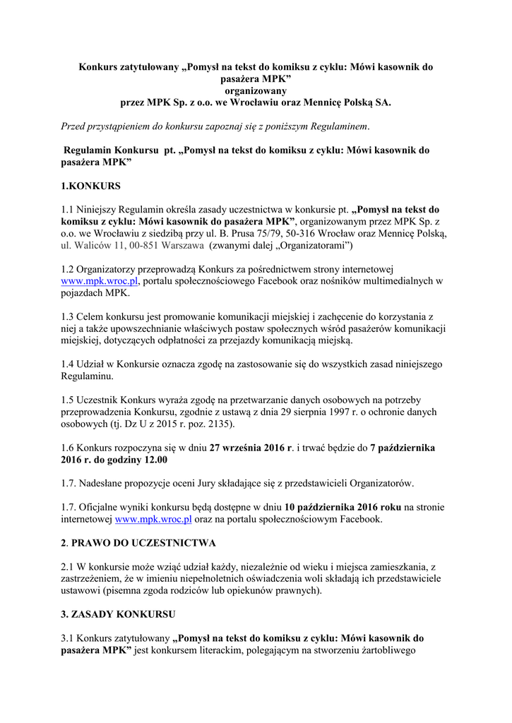 Konkurs zatytułowany „Pomysł na tekst do komiksu z cyklu: Mówi kasownik do pasażera MPK” organizowany przez MPK Sp. z o.o. we Wrocławiu oraz Mennicę Polską SA. Przed przystąpieniem do konkursu zapoznaj się z poniższym Regulaminem. Regulamin Konkursu pt. „Pomysł na tekst do komiksu z cyklu: Mówi kasownik do pasażera MPK” 1.KONKURS 1.1 Niniejszy Regulamin określa zasady uczestnictwa w konkursie pt. „Pomysł na tekst do komiksu z cyklu: Mówi kasownik do pasażera MPK”, organizowanym przez MPK Sp. z o.o. we Wrocławiu z siedzibą przy ul. B. Prusa 75/79, 50-316 Wrocław oraz Mennicę Polską, ul. Waliców 11, 00-851 Warszawa (zwanymi dalej „Organizatorami”) 1.2 Organizatorzy przeprowadzą Konkurs za pośrednictwem strony internetowej www.mpk.wroc.pl, portalu społecznościowego Facebook oraz nośników multimedialnych w pojazdach MPK. 1.3 Celem konkursu jest promowanie komunikacji miejskiej i zachęcenie do korzystania z niej a także upowszechnianie właściwych postaw społecznych wśród pasażerów komunikacji miejskiej, dotyczących odpłatności za przejazdy komunikacją miejską. 1.4 Udział w Konkursie oznacza zgodę na zastosowanie się do wszystkich zasad niniejszego Regulaminu. 1.5 Uczestnik Konkurs wyraża zgodę na przetwarzanie danych osobowych na potrzeby przeprowadzenia Konkursu, zgodnie z ustawą z dnia 29 sierpnia 1997 r. o ochronie danych osobowych (tj. Dz U z 2015 r. poz. 2135). 1.6 Konkurs rozpoczyna się w dniu 27 września 2016 r. i trwać będzie do 7 października 2016 r. do godziny 12.00 1.7. Nadesłane propozycje oceni Jury składające się z przedstawicieli Organizatorów. 1.7. Oficjalne wyniki konkursu będą dostępne w dniu 10 października 2016 roku na stronie internetowej www.mpk.wroc.pl oraz na portalu społecznościowym Facebook. 2. PRAWO DO UCZESTNICTWA 2.1 W konkursie może wziąć udział każdy, niezależnie od wieku i miejsca zamieszkania, z zastrzeżeniem, że w imieniu niepełnoletnich oświadczenia woli składają ich przedstawiciele ustawowi (pisemna zgoda rodziców lub opiekunów prawnych). 3. ZASADY KONKURSU 3.1 Konkurs zatytułowany „Pomysł na tekst do komiksu z cyklu: Mówi kasownik do pasażera MPK” jest konkursem literackim, polegającym na stworzeniu żartobliwego utworu/utworów w postaci krótkiego tekstu/tekstów (maksymalnie 45-znaków) do charakterystycznych dla tej formy literackiej dymków, które wraz z grafiką satyryczną stworzą cykl obrazkowy zwany historyjką komiksową. 4. NAGRODY 4.1 Jury konkursu, wybrane przez Organizatorów przewidziało nagrody dla 10 autorów najciekawszych utworów. 4.2 Spośród autorów, o których mowa w pkt. 4.1 Regulaminu 6 najlepszych autorów wskazanych przez Jury otrzyma nagrody w postaci czytników e-booków marki Kindle oraz 30-dniowe bilety komunikacji miejskiej na wszystkie linie wraz z gadżetami reklamowymi MPK. 4.3 Dodatkowo Jury wyróżni 4 pozostałych autorów przyznaniem nagrody w postaci 30dniowego biletu komunikacji miejskiej na wszystkie linie wraz z gadżetami reklamowymi MPK. 4.2 Najciekawsze utwory, wybranych przez jury autorów, zostaną użyte podczas kampanii promocyjnych MPK Wrocław. 4.3 Autorzy, których utwory zostaną nagrodzone, odbiorą nagrody osobiście w siedzibie MPK, tj. we Wrocławiu przy ul. B. Prusa 75-79 w Biurze Obsługi Pasażera w terminie od 11 października 2016 r. do 28 października 2016 r. 4.4 Organizatorzy nie ponoszą odpowiedzialności za brak możliwości przekazania nagrody z przyczyn leżących po stronie Uczestnika, a w szczególności w przypadku niepodania/podania błędnych lub niepełnych danych osobowych/kontaktowych. 4.5 W przypadku nieodebrania nagrody w ustalonym terminie lub braku kontaktu z uczestnikiem traci on prawo do nagrody. 4.6 Organizatorzy nie ponoszą odpowiedzialności za funkcjonowanie sieci Internet, za pośrednictwem której Organizatorzy kontaktują się z uczestnikiem Konkursu. 4.7 Nagrody nie podlegają zamianie na inne lub na ich równowartość pieniężną. 4.8 Organizatorzy informują, iż niniejszy Konkurs jest konkursem z dziedziny kultury i sztuki, a jednorazowa wartość przyznanych w nim nagród nie przekracza kwoty 760 zł. Zgodnie więc z art.21 ust.1 pkt 68 Ustawy z dnia 26.07.1991 r. o podatku dochodowym od osób fizycznych (t.j.Dz. U. z 2012 r. poz. 361, z późniejszymi zmianami) przyznane w Konkursie nagrody podlegają zwolnieniu z podatku dochodowego od osób fizycznych. 5. ZGŁOSZENIE DO KONKURSU 5.1 Zgłoszeniem do konkursu jest przesłanie propozycji krótkiego utworu/utworów opisanych w pkt 3.1 niniejszego regulaminu i nadesłanie na adres e-mail [email protected] z podaniem imienia, nazwiska oraz adresu e-mail autora w terminie przewidzianym w niniejszym regulaminie. 5.2 Nadesłane utwory nie mogą naruszać praw autorskich osób trzecich. W razie naruszenia przez uczestnika konkursu praw autorskich osób trzecich, ponosi on pełną odpowiedzialność za ich naruszenie. 5.3 Organizatorzy mogą wykluczyć uczestnika z Konkursu w przypadku naruszenia przez uczestnika postanowień niniejszego Regulaminu. 5.4 Organizatorzy nabywają autorskie prawa majątkowe do korzystania z utworu/utworów zgłoszonych do konkursu przez uczestników konkursu w zakresie pól eksploatacji znanych w dniu zakończenia konkursu, w szczególności w zakresie: a) rozpowszechniania w sposób inny niż określony powyżej – przez publiczne wystawienie, wyświetlenie, a także publiczne udostępnianie w taki sposób, aby każdy mógł mieć do nich dostęp w miejscu i czasie przez siebie wybranym, b) prawa obrotu (rozporządzania) w kraju i za granicą, w szczególności dalszego obrotu i rozporządzania autorskimi prawami majątkowymi do całości lub części haseł, c) sporządzania wersji obcojęzycznych i tłumaczeń na inne języki niż polski, d) wprowadzania do pamięci komputerów, do sieci multimedialnych (bezpośredniego porozumiewania się), w tym w szczególności Internetu,