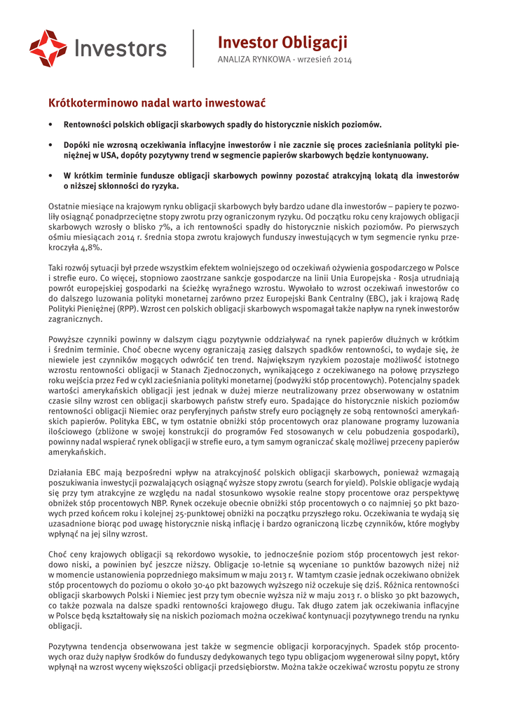Investor Obligacji ANALIZA RYNKOWA - wrzesień 2014 Krótkoterminowo nadal warto inwestować • Rentowności polskich obligacji skarbowych spadły do historycznie niskich poziomów. • Dopóki nie wzrosną oczekiwania inflacyjne inwestorów i nie zacznie się proces zacieśniania polityki pieniężnej w USA, dopóty pozytywny trend w segmencie papierów skarbowych będzie kontynuowany. • W krótkim terminie fundusze obligacji skarbowych powinny pozostać atrakcyjną lokatą dla inwestorów o niższej skłonności do ryzyka. Ostatnie miesiące na krajowym rynku obligacji skarbowych były bardzo udane dla inwestorów – papiery te pozwoliły osiągnąć ponadprzeciętne stopy zwrotu przy ograniczonym ryzyku. Od początku roku ceny krajowych obligacji skarbowych wzrosły o blisko 7%, a ich rentowności spadły do historycznie niskich poziomów. Po pierwszych ośmiu miesiącach 2014 r. średnia stopa zwrotu krajowych funduszy inwestujących w tym segmencie rynku przekroczyła 4,8%. Taki rozwój sytuacji był przede wszystkim efektem wolniejszego od oczekiwań ożywienia gospodarczego w Polsce i strefie euro. Co więcej, stopniowo zaostrzane sankcje gospodarcze na linii Unia Europejska - Rosja utrudniają powrót europejskiej gospodarki na ścieżkę wyraźnego wzrostu. Wywołało to wzrost oczekiwań inwestorów co do dalszego luzowania polityki monetarnej zarówno przez Europejski Bank Centralny (EBC), jak i krajową Radę Polityki Pieniężnej (RPP). Wzrost cen polskich obligacji skarbowych wspomagał także napływ na rynek inwestorów zagranicznych. Powyższe czynniki powinny w dalszym ciągu pozytywnie oddziaływać na rynek papierów dłużnych w krótkim i średnim terminie. Choć obecne wyceny ograniczają zasięg dalszych spadków rentowności, to wydaje się, że niewiele jest czynników mogących odwrócić ten trend. Największym ryzykiem pozostaje możliwość istotnego wzrostu rentowności obligacji w Stanach Zjednoczonych, wynikającego z oczekiwanego na połowę przyszłego roku wejścia przez Fed w cykl zacieśniania polityki monetarnej (podwyżki stóp procentowych). Potencjalny spadek wartości amerykańskich obligacji jest jednak w dużej mierze neutralizowany przez obserwowany w ostatnim czasie silny wzrost cen obligacji skarbowych państw strefy euro. Spadające do historycznie niskich poziomów rentowności obligacji Niemiec oraz peryferyjnych państw strefy euro pociągnęły ze sobą rentowności amerykańskich papierów. Polityka EBC, w tym ostatnie obniżki stóp procentowych oraz planowane programy luzowania ilościowego (zbliżone w swojej konstrukcji do programów Fed stosowanych w celu pobudzenia gospodarki), powinny nadal wspierać rynek obligacji w strefie euro, a tym samym ograniczać skalę możliwej przeceny papierów amerykańskich. Działania EBC mają bezpośredni wpływ na atrakcyjność polskich obligacji skarbowych, ponieważ wzmagają poszukiwania inwestycji pozwalających osiągnąć wyższe stopy zwrotu (search for yield). Polskie obligacje wydają się przy tym atrakcyjne ze względu na nadal stosunkowo wysokie realne stopy procentowe oraz perspektywę obniżek stóp procentowych NBP. Rynek oczekuje obecnie obniżki stóp procentowych o co najmniej 50 pkt bazowych przed końcem roku i kolejnej 25-punktowej obniżki na początku przyszłego roku. Oczekiwania te wydają się uzasadnione biorąc pod uwagę historycznie niską inflację i bardzo ograniczoną liczbę czynników, które mogłyby wpłynąć na jej silny wzrost. Choć ceny krajowych obligacji są rekordowo wysokie, to jednocześnie poziom stóp procentowych jest rekordowo niski, a powinien być jeszcze niższy. Obligacje 10-letnie są wyceniane 10 punktów bazowych niżej niż w momencie ustanowienia poprzedniego maksimum w maju 2013 r. W tamtym czasie jednak oczekiwano obniżek stóp procentowych do poziomu o około 30-40 pkt bazowych wyższego niż oczekuje się dziś. Różnica rentowności obligacji skarbowych Polski i Niemiec jest przy tym obecnie wyższa niż w maju 2013 r. o blisko 30 pkt bazowych, co także pozwala na dalsze spadki rentowności krajowego długu. Tak długo zatem jak oczekiwania inflacyjne w Polsce będą kształtowały się na niskich poziomach można oczekiwać kontynuacji pozytywnego trendu na rynku obligacji. Pozytywna tendencja obserwowana jest także w segmencie obligacji korporacyjnych. Spadek stóp procentowych oraz duży napływ środków do funduszy dedykowanych tego typu obligacjom wygenerował silny popyt, który wpłynął na wzrost wyceny większości obligacji przedsiębiorstw. Można także oczekiwać wzrostu popytu ze strony Investor Obligacji ANALIZA RYNKOWA - wrzesień 2014 OFE, dla których obligacje korporacyjne stanowią element stabilizujący stopę zwrotu z portfela. W warunkach ograniczonej liczby potencjalnych emitentów sytuacja ta pozwala na pozyskanie istotnie tańszego finansowania przez przedsiębiorstwa, przez co należy oczekiwać dalszego obniżenia dochodowości nowych emisji. Przy takiej tendencji presja na wartość obligacji już wyemitowanych powinna się utrzymać. Obligacje korporacyjne są w zdecydowanej większości zmiennokuponowe, co nie pozwala zarabiać na spadkach stóp procentowych. W momencie obniżek stóp procentowych spadnie także stawka WIBOR, co obniży wartość kuponu i tym samym dochodowość. Nie można wykluczyć jednak na przełomie roku korekty na rynku obligacji skarbowych, w mniejszym stopniu na rynku obligacji korporacyjnych, które przez zmienną formę oprocentowania są zabezpieczone przed ryzykiem stóp procentowych. Wydaje się, że korekty można oczekiwać w sytuacji gdy: • zdyskontowany zostanie pełny dostosowawczy cykl obniżek stóp procentowych NBP, • poprawie ulegnie otoczenie makroekonomiczne oraz istotnie wzrośnie inflacja, • 10-letnie obligacje skarbowe osiągną rentowności na poziomie 2,40-2,50%, • nastąpi silny wzrost rentowności obligacji amerykańskich, który p