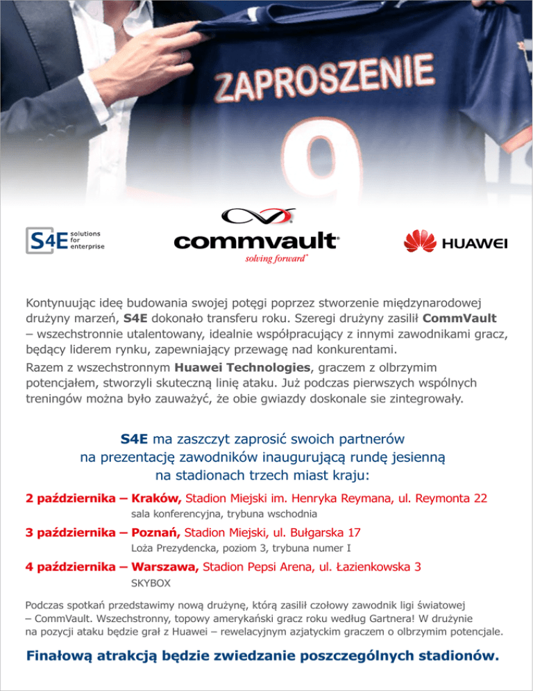 Kontynuując ideę budowania swojej potęgi poprzez stworzenie międzynarodowej drużyny marzeń, S4E dokonało transferu roku. Szeregi drużyny zasilił CommVault – wszechstronnie utalentowany, idealnie współpracujący z innymi zawodnikami gracz, będący liderem rynku, zapewniający przewagę nad konkurentami. Razem z wszechstronnym Huawei Technologies, graczem z olbrzymim potencjałem, stworzyli skuteczną linię ataku. Już podczas pierwszych wspólnych treningów można było zauważyć, że obie gwiazdy doskonale sie zintegrowały. S4E ma zaszczyt zaprosić swoich partnerów na prezentację zawodników inaugurującą rundę jesienną na stadionach trzech miast kraju: 2 października – Kraków, Stadion Miejski im. Henryka Reymana, ul. Reymonta 22 sala konferencyjna, trybuna wschodnia 3 października – Poznań, Stadion Miejski, ul. Bułgarska 17 Loża Prezydencka, poziom 3, trybuna numer I 4 października – Warszawa, Stadion Pepsi Arena, ul. Łazienkowska 3 Skybox Podczas spotkań przedstawimy nową drużynę, którą zasilił czołowy zawodnik ligi światowej – CommVault. Wszechstronny, topowy amerykański gracz roku według Gartnera! W drużynie na pozycji ataku będzie grał z Huawei – rewelacyjnym azjatyckim graczem o olbrzymim potencjale. Finałową atrakcją będzie zwiedzanie poszczególnych stadionów. Planowana strategia: 8 4 7 1 9 5 3 11 6 2 1 10.00: N owi dostawcy w ofercie S4E Józef Kącki, S4E 2 10.15: CommVault business overview – prezentacja firmy Ryszard Regucki, CommVault 3 10.45: Simpana 10 – nowe spojrzenie na zarządzanie danymi - backup serwerów i aplikacji - zintegrowana archiwizacja - integracja z macierzami - backup stacji roboczych i urządzeń mobilnych Jerzy Janowski, CommVault 4 11.30: Dlaczego Simpana? Jerzy Janowski, CommVault 5 11.45: przerwa kawowa 10 6 12.00: Wygraj z Huawei i rośnij z Huawei – Progam Partnerski Huawei Grzegorz Jaksim, Huawei 7 12.15: Jak CommVault integruje się z Huawei? Maciej Kieliszek, S4E 8 12.45: Przewagi konkurencyjne w portfolio Huawei Maciej Kieliszek, S4E 9 13.15: eSight software do zarządzania całym portfolio Huawei Wojciech Caban, S4E 10 13.30: lunch 11 14.30: zwiedzanie stadionu Warunkiem uczestnictwa w bezpłatnych spotkaniach, podczas których nasi zawodnicy zaprezentują swoje największe atuty, jest rejestracja na stronie www.s4e.pl/roadshow2013