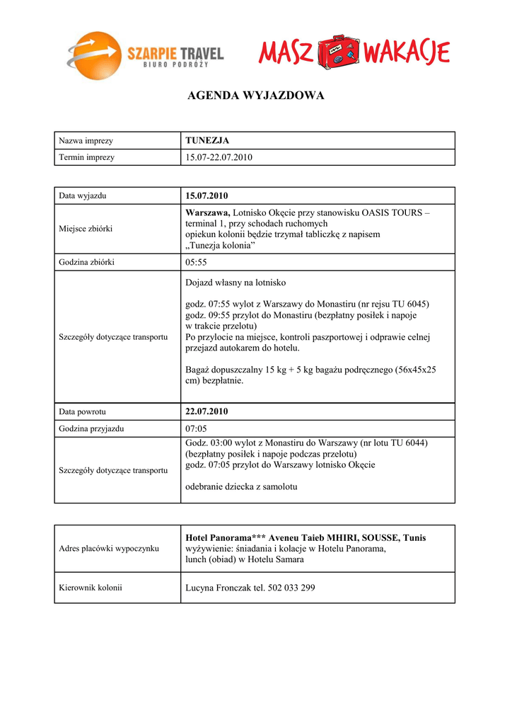 AGENDA WYJAZDOWA Nazwa imprezy TUNEZJA Termin imprezy 15.07-22.07.2010 Data wyjazdu 15.07.2010 Miejsce zbiórki Warszawa, Lotnisko Okęcie przy stanowisku OASIS TOURS – terminal 1, przy schodach ruchomych opiekun kolonii będzie trzymał tabliczkę z napisem „Tunezja kolonia” Godzina zbiórki 05:55 Dojazd własny na lotnisko Szczegóły dotyczące transportu godz. 07:55 wylot z Warszawy do Monastiru (nr rejsu TU 6045) godz. 09:55 przylot do Monastiru (bezpłatny posiłek i napoje w trakcie przelotu) Po przylocie na miejsce, kontroli paszportowej i odprawie celnej przejazd autokarem do hotelu. Bagaż dopuszczalny 15 kg + 5 kg bagażu podręcznego (56x45x25 cm) bezpłatnie. Data powrotu 22.07.2010 Godzina przyjazdu 07:05 Godz. 03:00 wylot z Monastiru do Warszawy (nr lotu TU 6044) (bezpłatny posiłek i napoje podczas przelotu) godz. 07:05 przylot do Warszawy lotnisko Okęcie Szczegóły dotyczące transportu odebranie dziecka z samolotu Adres placówki wypoczynku Hotel Panorama*** Aveneu Taieb MHIRI, SOUSSE, Tunis wyżywienie: śniadania i kolacje w Hotelu Panorama, lunch (obiad) w Hotelu Samara Kierownik kolonii Lucyna Fronczak tel. 502 033 299 Koordynator transportu Maciej Kozakiewicz tel. 697 050 702 (telefon działa tylko w dniu wyjazdu i powrotu z kolonii) -Paszport ważny minimum 6 miesięcy od daty powrotu, legitymację szkolną, kartę kwalifikacyjna jeżeli nie została wcześniej oddana w biurze Uczestnik wypoczynku powinien -strój kąpielowy, krem do opalania z filtrem, obuwie i strój sportowy, nakrycie głowy zabrać ze sobą: Nieobowiązkowe kieszonkowe każdy uczestnik zabiera według własnego uznania (nasza sugestia to 50-60 USD) Informacja o wycieczkach fakultatywnych: Tunis – Bardo – Kartagina- Sidi Bou Said - koszt wycieczki ok.70 USD Życzymy udanego wypoczynku i wspaniałej zabawy