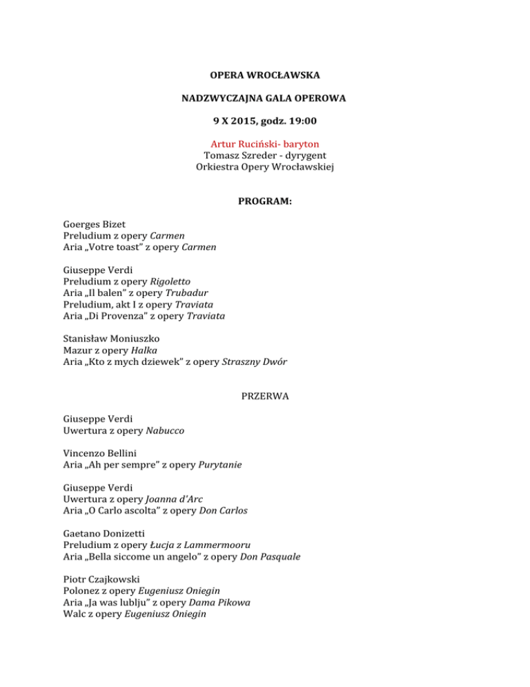 OPERA WROCŁAWSKA NADZWYCZAJNA GALA OPEROWA 9 X 2015, godz. 19:00 Artur Ruciński- baryton Tomasz Szreder - dyrygent Orkiestra Opery Wrocławskiej PROGRAM: Goerges Bizet Preludium z opery Carmen Aria „Votre toast” z opery Carmen Giuseppe Verdi Preludium z opery Rigoletto Aria „Il balen” z opery Trubadur Preludium, akt I z opery Traviata Aria „Di Provenza” z opery Traviata Stanisław Moniuszko Mazur z opery Halka Aria „Kto z mych dziewek” z opery Straszny Dwór PRZERWA Giuseppe Verdi Uwertura z opery Nabucco Vincenzo Bellini Aria „Ah per sempre” z opery Purytanie Giuseppe Verdi Uwertura z opery Joanna d'Arc Aria „O Carlo ascolta” z opery Don Carlos Gaetano Donizetti Preludium z opery Łucja z Lammermooru Aria „Bella siccome un angelo” z opery Don Pasquale Piotr Czajkowski Polonez z opery Eugeniusz Oniegin Aria „Ja was lublju” z opery Dama Pikowa Walc z opery Eugeniusz Oniegin Aria „Wy mnie pisali” z opery Eugeniusz Oniegin