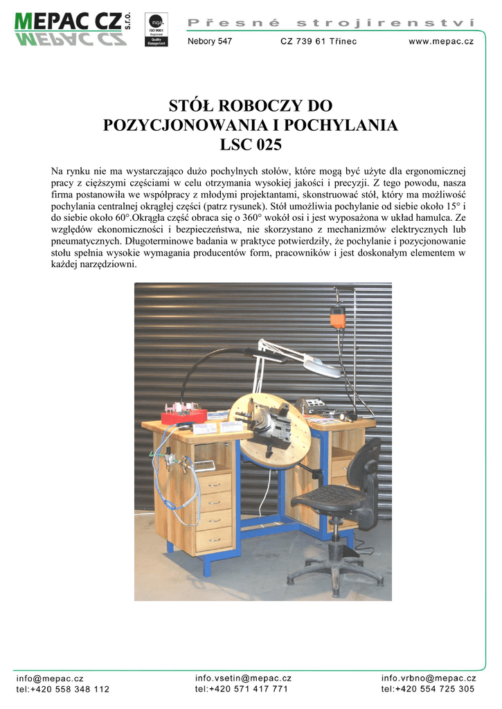 STÓŁ ROBOCZY DO POZYCJONOWANIA I POCHYLANIA LSC 025 Na rynku nie ma wystarczająco dużo pochylnych stołów, które mogą być użyte dla ergonomicznej pracy z cięższymi częściami w celu otrzymania wysokiej jakości i precyzji. Z tego powodu, nasza firma postanowiła we współpracy z młodymi projektantami, skonstruować stół, który ma możliwość pochylania centralnej okrągłej części (patrz rysunek). Stół umożliwia pochylanie od siebie około 15° i do siebie około 60°.Okrągła część obraca się o 360° wokół osi i jest wyposażona w układ hamulca. Ze względów ekonomiczności i bezpieczeństwa, nie skorzystano z mechanizmów elektrycznych lub pneumatycznych. Długoterminowe badania w praktyce potwierdziły, że pochylanie i pozycjonowanie stołu spełnia wysokie wymagania producentów form, pracowników i jest doskonałym elementem w każdej narzędziowni. O firmach MEPAC CZ s.r.o. i MEPAC SK s.r.o.: Nasza firma zajmuje się dziedziną precyzyjnej obróbki powierzchni, gdzie w dziale sprzedaży narzędzi i przyrządów prezentujemy w sumie 17 zagranicznych firm na Czeskim i Słowackim rynku, oprócz tego dostarczamy również do Francji, Polski, Węgier i Rumunii. U firm, które zaopatrujemy, działamy, jako bezpośredni dostawca, następnie oferujemy doradztwo dla naszych klientów a na rzecz gwarancji zabezpieczenia przyrządów zapewniamy również gwarancyjny i pogwarancyjny serwis. Proponowany asortyment pokrywa głównie zakres „Produkcja narzędzi i form“ i zawiera: - Diamentowe i CBN pilniki igłowe i kształtowe, w tym specjalne, bardzo cienkiej grubości pilniki. 0,4 mm - Trzpienie diamentowe i CBN galwaniczne element sprzęgający o średnicach od 0,4 mm trzpień o śr. 2, 35mm - CBN ceramiczne tarcze z spoiwem do precyzyjnego szlifowania - Obrotowe frezy na trzpieniu 3, 6, lub 8 mm - Frezy do obróbki maszynowej (średnice od 0,1 do materiałów o twardości do 60 HRc, grafitu, miedzi, ...) - Al2O3 i SiC ścierne ciała na pr.3mm macierzystych i 6 mm - Al2O3 i SiC tarcze ścierne i koła do szlifowania wewnętrznych i zewnętrznych - Specjalne tarcze ścierne z tzw. niebieskim korundem - Tarcze diamentowe o standardowych kształtach (1A1, ...) lub specjalnych kształtach - Obciągacz diamentowy - Pasty diamentowe, i rozpuszczalników do past diamentowy - Wapno wiedeńskie i tusze do tuszowania - Trzpienie do docierania, polerowania i tarcze filcowe dla past diamentowych - Ściernice lamelowe na trzpieniu, tarcze i talerzyki - Tarcze do cięcia już od miniaturowych wielkości - Mini szczotki na trzpieniu 2.35mm do połyskowej i matowej powierzchni - Szwajcarskie igłowe, kształtowe i warsztatowe stalowe pilniki Baiter - Amerykańskie kamienie szlifierskie Gesswein do szlifowania powierzchni - Grafitowe kamienie szlifierskie i kamienie szlifierskie Bellstone o ziarnistości aż 4000 - Japońskie elastyczne narzędzia ścierne (2 ogólnoświatowe patenty – szlifuje i poleruje jednocześnie) (ponad 10000 rodzajów już od średnicy 2mm na trzpieniu 3mm, ziarnistości od 80 do 3000) - Cały asortyment firmy Diprofil (przyczepiane silniki, wały giętkie, …) – wykonujemy naprawy starszych typów - Pilarki i szlifiarki z napędem silnikowym – prowadzimy naprawy starszych typów - Części zamienne do nadstawek, włącznie z tulejkami mocującymi - Precyzyjne blachy ze stali hartowanej, o grubości od 0, 005mm do 2, 00mm (o dokładności od 0, 001mm) - Materiały Ampco (specjalne stopy brązu, włącznie z brązem berylowym) do wyrobu wkładek do form i łożysk ślizgowych –pręty o przekroju kolistym i prostokątnym - Japońskie ultradźwiękowe polerki systemów NSK, ROYAL, UC500 a UC550 - Mikrosilniki i systemy wymiennych nasadek, wykonujemy naprawy starszych typów - Angielskie szlifierki i polerki systemu Kemet, tarczowe narzędzia szlifierskie UVM - Systemy mikro napawania Protec - Spoiwa do mikro napawania - Płótna i papiery ścierne (o ziarnistości 2000) w arkuszach i rolkach (płótna) - Japońskie pilniki z włókien szklanych (o grubościach od 0, 5mm do 3mm) o przekroju prostokątnym i kolistym - Uchwyty do pilników z włókien szklanych - Precyzyjne niemieckie światła z umocowaniem do stołu lub na formę - Narzędziowe okulary, lupy i stereomikroskopy (lupy włącznie z pomiarowym obrazem) - Szlifierki pneumatyczne i pilniki do precyzyjnej obróbki powierzchni - Stoły do polerowania z obrotowym i nachylanym stołem, kompletne wyposażenie szlifierskiego stanowiska pracy - Natryskowe kabiny ……………………………………. i wiele innych Na życzenie dostarczamy specjalne katalogi i poradzimy jak rozwiązać Wasz problem. Możecie także zwrócić się do naszych regionalnych przedstawicieli, którzy Wam bezpośrednio w Waszej firmie pomogą w wyborze. Może Was odwiedzić z naszym sklepem objazdowym z bardzo szerokim asortymentem towarów, które Waszym pracownikom umożliwi fizycznie wypróbować w praktyce interesujących przyrządów i narzędzi i tak sprawdzić, czy są odpowiednim rozwiązaniem Waszego problemu. Ten oto sposób jest dla użytkownika znacznie lepszy i korzystniejszy niż kupować według papierowych informacji. Wierzymy, że z naszej oferty wybierzecie coś dla siebie i będziecie zadowoleni. Opis i dane techniczne Stół ten jest zbudowany z konstrukcji metalowej i twardego drewna. Stół jest wytrzymały i ergonomiczny. Maksymalne obciążenie stołu wynosi 400 kg. Pochył stołu odbywa się za pomocą śruby trapezowej i uchwytu. Przedmioty obrabiane mogą być mocowane do części kołowej przy pomocy urządzeń zaciskowych M 10. W tym celu w części obrotowej jest 32 otworów gwintowanych. Górny blat stołu umożliwia dołączenie światła, silników przyczepnych i innych narzędzi. Wysokość stołu Szerokość stołu Głębokość stołu Rysunek 1 900 mm 1400 mm 750 mm Stół roboczy jest wykonany z drewna bukowego o grubości 40 mm. Po obu stronach po cztery szuflady z poje