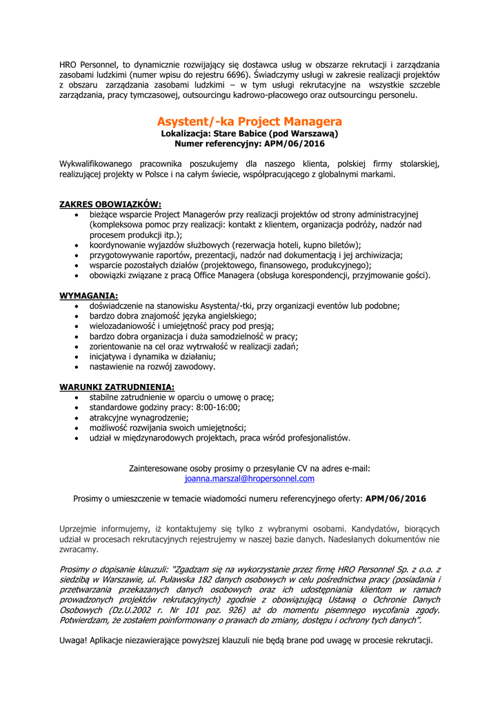 HRO Personnel, to dynamicznie rozwijający się dostawca usług w obszarze rekrutacji i zarządzania zasobami ludzkimi (numer wpisu do rejestru 6696). Świadczymy usługi w zakresie realizacji projektów z obszaru zarządzania zasobami ludzkimi – w tym usługi rekrutacyjne na wszystkie szczeble zarządzania, pracy tymczasowej, outsourcingu kadrowo-płacowego oraz outsourcingu personelu. Asystent/-ka Project Managera Lokalizacja: Stare Babice (pod Warszawą) Numer referencyjny: APM/06/2016 Wykwalifikowanego pracownika poszukujemy dla naszego klienta, polskiej firmy stolarskiej, realizującej projekty w Polsce i na całym świecie, współpracującego z globalnymi markami. ZAKRES OBOWIĄZKÓW: bieżące wsparcie Project Managerów przy realizacji projektów od strony administracyjnej (kompleksowa pomoc przy realizacji: kontakt z klientem, organizacja podróży, nadzór nad procesem produkcji itp.); koordynowanie wyjazdów służbowych (rezerwacja hoteli, kupno biletów); przygotowywanie raportów, prezentacji, nadzór nad dokumentacją i jej archiwizacja; wsparcie pozostałych działów (projektowego, finansowego, produkcyjnego); obowiązki związane z pracą Office Managera (obsługa korespondencji, przyjmowanie gości). WYMAGANIA: doświadczenie na stanowisku Asystenta/-tki, przy organizacji eventów lub podobne; bardzo dobra znajomość języka angielskiego; wielozadaniowość i umiejętność pracy pod presją; bardzo dobra organizacja i duża samodzielność w pracy; zorientowanie na cel oraz wytrwałość w realizacji zadań; inicjatywa i dynamika w działaniu; nastawienie na rozwój zawodowy. WARUNKI ZATRUDNIENIA: stabilne zatrudnienie w oparciu o umowę o pracę; standardowe godziny pracy: 8:00-16:00; atrakcyjne wynagrodzenie; możliwość rozwijania swoich umiejętności; udział w międzynarodowych projektach, praca wśród profesjonalistów. Zainteresowane osoby prosimy o przesyłanie CV na adres e-mail: [email protected] Prosimy o umieszczenie w temacie wiadomości numeru referencyjnego oferty: APM/06/2016 Uprzejmie informujemy, iż kontaktujemy się tylko z wybranymi osobami. Kandydatów, biorących udział w procesach rekrutacyjnych rejestrujemy w naszej bazie danych. Nadesłanych dokumentów nie zwracamy. Prosimy o dopisanie klauzuli: "Zgadzam się na wykorzystanie przez firmę HRO Personnel Sp. z o.o. z siedzibą w Warszawie, ul. Puławska 182 danych osobowych w celu pośrednictwa pracy (posiadania i przetwarzania przekazanych danych osobowych oraz ich udostępniania klientom w ramach prowadzonych projektów rekrutacyjnych) zgodnie z obowiązującą Ustawą o Ochronie Danych Osobowych (Dz.U.2002 r. Nr 101 poz. 926) aż do momentu pisemnego wycofania zgody. Potwierdzam, że zostałem poinformowany o prawach do zmiany, dostępu i ochrony tych danych". Uwaga! Aplikacje niezawierające powyższej klauzuli nie będą brane pod uwagę w procesie rekrutacji.