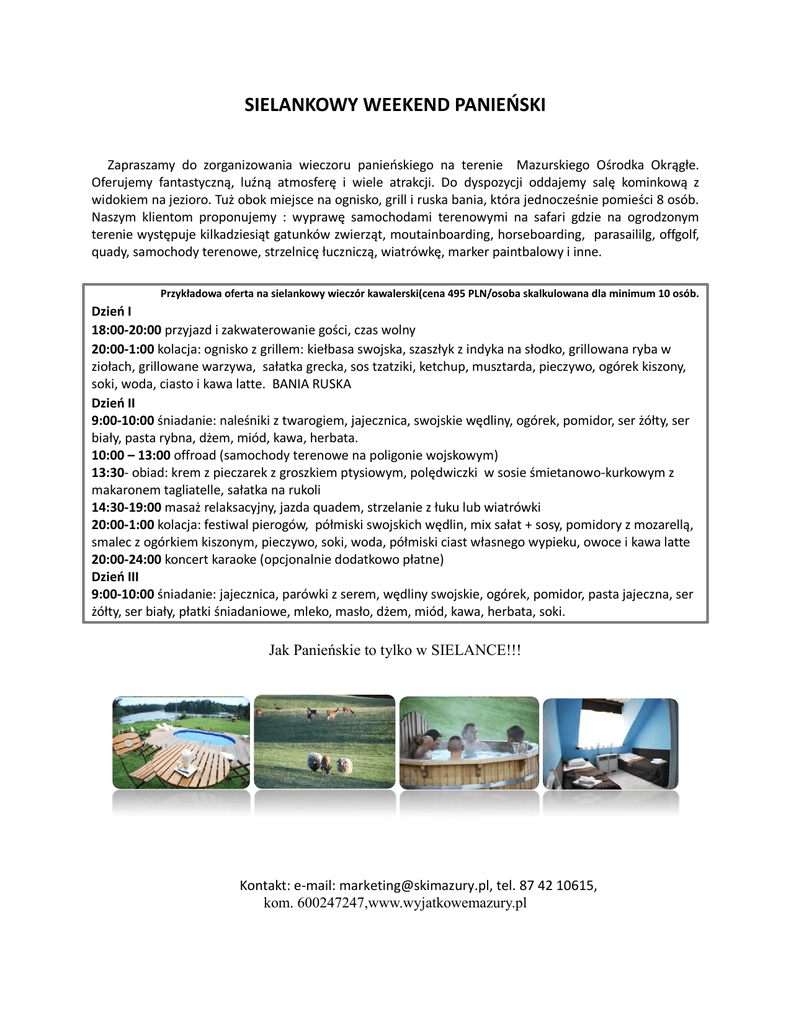 SIELANKOWY WEEKEND PANIEŃSKI Zapraszamy do zorganizowania wieczoru panieńskiego na terenie Mazurskiego Ośrodka Okrągłe. Oferujemy fantastyczną, luźną atmosferę i wiele atrakcji. Do dyspozycji oddajemy salę kominkową z widokiem na jezioro. Tuż obok miejsce na ognisko, grill i ruska bania, która jednocześnie pomieści 8 osób. Naszym klientom proponujemy : wyprawę samochodami terenowymi na safari gdzie na ogrodzonym terenie występuje kilkadziesiąt gatunków zwierząt, moutainboarding, horseboarding, parasaililg, offgolf, quady, samochody terenowe, strzelnicę łuczniczą, wiatrówkę, marker paintbalowy i inne. Przykładowa oferta na sielankowy wieczór kawalerski(cena 495 PLN/osoba skalkulowana dla minimum 10 osób. Dzień I 18:00-20:00 przyjazd i zakwaterowanie gości, czas wolny 20:00-1:00 kolacja: ognisko z grillem: kiełbasa swojska, szaszłyk z indyka na słodko, grillowana ryba w ziołach, grillowane warzywa, sałatka grecka, sos tzatziki, ketchup, musztarda, pieczywo, ogórek kiszony, soki, woda, ciasto i kawa latte. BANIA RUSKA Dzień II 9:00-10:00 śniadanie: naleśniki z twarogiem, jajecznica, swojskie wędliny, ogórek, pomidor, ser żółty, ser biały, pasta rybna, dżem, miód, kawa, herbata. 10:00 – 13:00 offroad (samochody terenowe na poligonie wojskowym) 13:30- obiad: krem z pieczarek z groszkiem ptysiowym, polędwiczki w sosie śmietanowo-kurkowym z makaronem tagliatelle, sałatka na rukoli 14:30-19:00 masaż relaksacyjny, jazda quadem, strzelanie z łuku lub wiatrówki 20:00-1:00 kolacja: festiwal pierogów, półmiski swojskich wędlin, mix sałat + sosy, pomidory z mozarellą, smalec z ogórkiem kiszonym, pieczywo, soki, woda, półmiski ciast własnego wypieku, owoce i kawa latte 20:00-24:00 koncert karaoke (opcjonalnie dodatkowo płatne) Dzień III 9:00-10:00 śniadanie: jajecznica, parówki z serem, wędliny swojskie, ogórek, pomidor, pasta jajeczna, ser żółty, ser biały, płatki śniadaniowe, mleko, masło, dżem, miód, kawa, herbata, soki. Jak Panieńskie to tylko w SIELANCE!!! Kontakt: e-mail: [email protected], tel. 87 42 10615, kom. 600247247,www.wyjatkowemazury.pl
