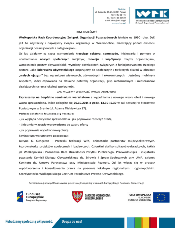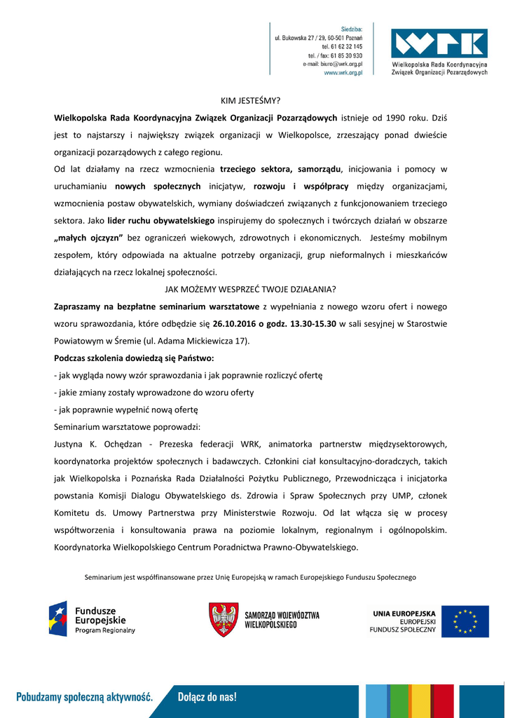 KIM JESTEŚMY? Wielkopolska Rada Koordynacyjna Związek Organizacji Pozarządowych istnieje od 1990 roku. Dziś jest to najstarszy i największy związek organizacji w Wielkopolsce, zrzeszający ponad dwieście organizacji pozarządowych z całego regionu. Od lat działamy na rzecz wzmocnienia trzeciego sektora, samorządu, inicjowania i pomocy w uruchamianiu nowych społecznych inicjatyw, rozwoju i współpracy między organizacjami, wzmocnienia postaw obywatelskich, wymiany doświadczeń związanych z funkcjonowaniem trzeciego sektora. Jako lider ruchu obywatelskiego inspirujemy do społecznych i twórczych działań w obszarze „małych ojczyzn” bez ograniczeń wiekowych, zdrowotnych i ekonomicznych. Jesteśmy mobilnym zespołem, który odpowiada na aktualne potrzeby organizacji, grup nieformalnych i mieszkańców działających na rzecz lokalnej społeczności. JAK MOŻEMY WESPRZEĆ TWOJE DZIAŁANIA? Zapraszamy na bezpłatne seminarium warsztatowe z wypełniania z nowego wzoru ofert i nowego wzoru sprawozdania, które odbędzie się 26.10.2016 o godz. 13.30-15.30 w sali sesyjnej w Starostwie Powiatowym w Śremie (ul. Adama Mickiewicza 17). Podczas szkolenia dowiedzą się Państwo: - jak wygląda nowy wzór sprawozdania i jak poprawnie rozliczyć ofertę - jakie zmiany zostały wprowadzone do wzoru oferty - jak poprawnie wypełnić nową ofertę Seminarium warsztatowe poprowadzi: Justyna K. Ochędzan - Prezeska federacji WRK, animatorka partnerstw międzysektorowych, koordynatorka projektów społecznych i badawczych. Członkini ciał konsultacyjno-doradczych, takich jak Wielkopolska i Poznańska Rada Działalności Pożytku Publicznego, Przewodnicząca i inicjatorka powstania Komisji Dialogu Obywatelskiego ds. Zdrowia i Spraw Społecznych przy UMP, członek Komitetu ds. Umowy Partnerstwa przy Ministerstwie Rozwoju. Od lat włącza się w procesy współtworzenia i konsultowania prawa na poziomie lokalnym, regionalnym i ogólnopolskim. Koordynatorka Wielkopolskiego Centrum Poradnictwa Prawno-Obywatelskiego. Seminarium jest współfinansowane przez Unię Europejską w ramach Europejskiego Funduszu Społecznego
