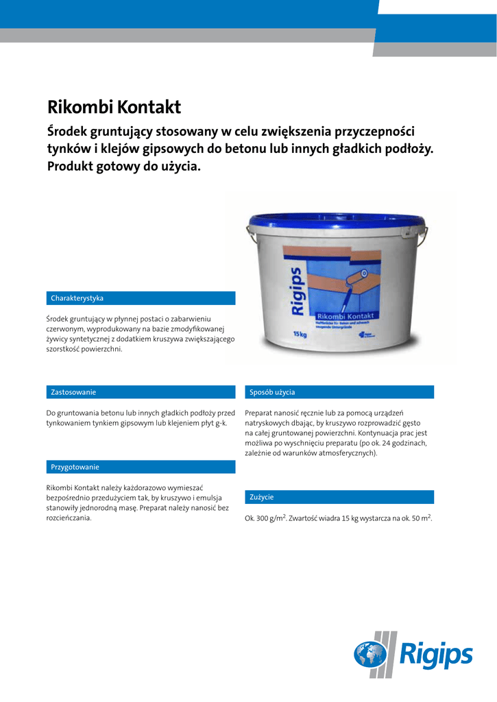 Rikombi Kontakt Środek gruntujący stosowany w celu zwiększenia przyczepności tynków i klejów gipsowych do betonu lub innych gładkich podłoży. Produkt gotowy do użycia. Charakterystyka Środek gruntujący w płynnej postaci o zabarwieniu czerwonym, wyprodukowany na bazie zmodyfikowanej żywicy syntetycznej z dodatkiem kruszywa zwiększającego szorstkość powierzchni. Zastosowanie Do gruntowania betonu lub innych gładkich podłoży przed tynkowaniem tynkiem gipsowym lub klejeniem płyt g-k. Sposób użycia Preparat nanosić ręcznie lub za pomocą urządzeń natryskowych dbając, by kruszywo rozprowadzić gęsto na całej gruntowanej powierzchni. Kontynuacja prac jest możliwa po wyschnięciu preparatu (po ok. 24 godzinach, zależnie od warunków atmosferycznych). Przygotowanie Rikombi Kontakt należy każdorazowo wymieszać bezpośrednio przedużyciem tak, by kruszywo i emulsja stanowiły jednorodną masę. Preparat należy nanosić bez rozcieńczania. Zużycie Ok. 300 g/m2. Zwartość wiadra 15 kg wystarcza na ok. 50 m2. Wskazówki •stosować na suchym, czystym, nie zamarzniętym podłożu, •stosować w temp. powyżej +5°C, •narzędzia umyć bezpośrednio po użyciu, •składować w chłodnym miejscu, w temperaturze dodatniej, •dopuszczalny okres składowania wynosi 12 miesięcy Bezpieczeństwo Produkt jest nietoksyczny w trakcie użycia i podczas eksploatacji, mimo to należy stosować odpowiednie środki ochronne. W przypadku dostania się mieszanki do oczu należy przemyć je czystą wodą. Produkt należy przechowywać w miejscu niedostępnym dla dzieci. Atest higieniczny HK/B/0544/03/2009 Saint-Gobain Construction Products Polska Sp. z o.o. Biuro Rigips w Warszawie ul. Cybernetyki 21 02-677 Warszawa Tel. +48 22 457 14 57 lub 8 Fax +48 22 457 14 55 Biuro Informacji Technicznej Rigips 0 801 328 788 www.rigips.pl Dane zawarte w niniejszej ulotce stanowią wyłącznie opis produktu. Są to ogólne wskazówki oparte na naszej wiedzy i doświadczeniach i nie odnoszą się do konkretnych zastosowań. Stale ulepszając i rozwijając oferowane przez naszą firmę produkty, zastrzegamy sobie prawo do zmiany parametrów bez uprzedniego informowania. Prezentowane dane nie mogą stanowić podstawy do jakichkolwiek roszczeń. W razie potrzeby prosimy zwrócić się do Działu Technicznego Rigips. listopad 2009 produkt: Rikombi Kontakt str. 2/2
