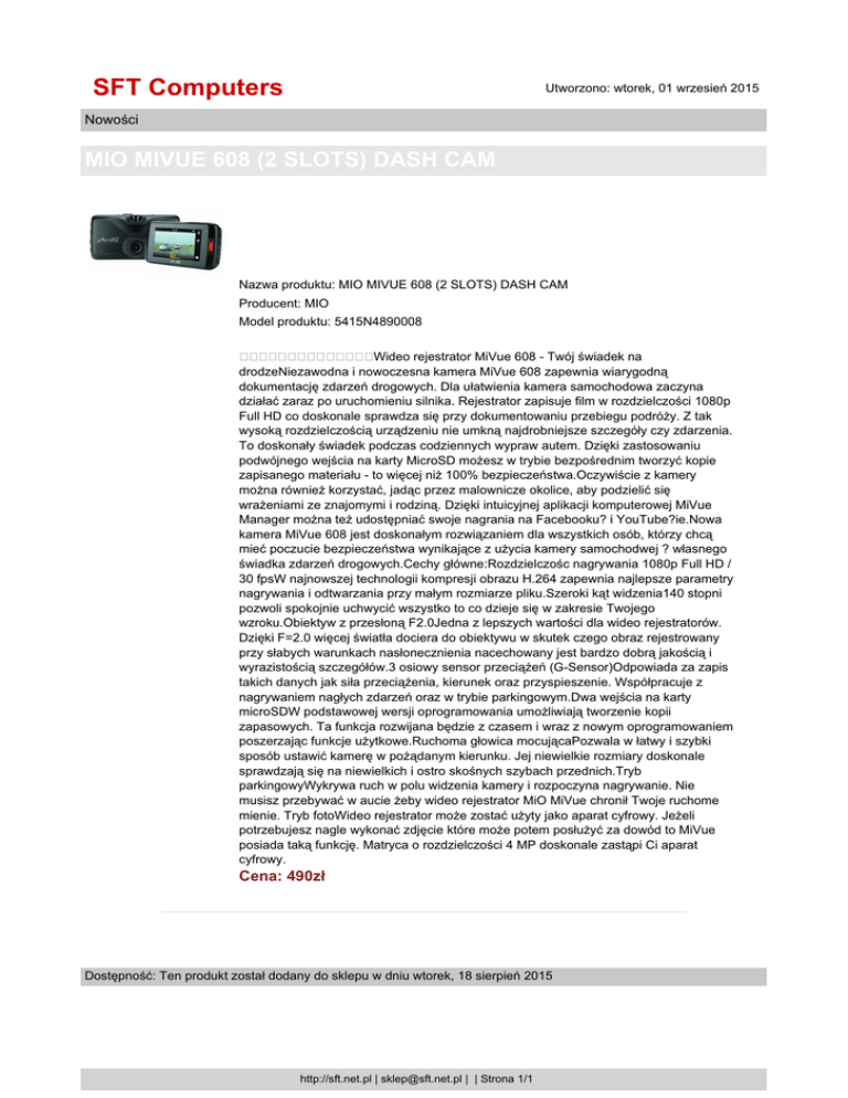SFT Computers Utworzono: wtorek, 01 wrzesień 2015 Nowości MIO MIVUE 608 (2 SLOTS) DASH CAM Nazwa produktu: MIO MIVUE 608 (2 SLOTS) DASH CAM Producent: MIO Model produktu: 5415N4890008 Wideo rejestrator MiVue 608 - Twój świadek na drodzeNiezawodna i nowoczesna kamera MiVue 608 zapewnia wiarygodną dokumentację zdarzeń drogowych. Dla ułatwienia kamera samochodowa zaczyna działać zaraz po uruchomieniu silnika. Rejestrator zapisuje film w rozdzielczości 1080p Full HD co doskonale sprawdza się przy dokumentowaniu przebiegu podróży. Z tak wysoką rozdzielczością urządzeniu nie umkną najdrobniejsze szczegóły czy zdarzenia. To doskonały świadek podczas codziennych wypraw autem. Dzięki zastosowaniu podwójnego wejścia na karty MicroSD możesz w trybie bezpośrednim tworzyć kopie zapisanego materiału - to więcej niż 100% bezpieczeństwa.Oczywiście z kamery można również korzystać, jadąc przez malownicze okolice, aby podzielić się wrażeniami ze znajomymi i rodziną. Dzięki intuicyjnej aplikacji komputerowej MiVue Manager można też udostępniać swoje nagrania na Facebooku? i YouTube?ie.Nowa kamera MiVue 608 jest doskonałym rozwiązaniem dla wszystkich osób, którzy chcą mieć poczucie bezpieczeństwa wynikające z użycia kamery samochodwej ? własnego świadka zdarzeń drogowych.Cechy główne:Rozdzielczośc nagrywania 1080p Full HD / 30 fpsW najnowszej technologii kompresji obrazu H.264 zapewnia najlepsze parametry nagrywania i odtwarzania przy małym rozmiarze pliku.Szeroki kąt widzenia140 stopni pozwoli spokojnie uchwycić wszystko to co dzieje się w zakresie Twojego wzroku.Obiektyw z przesłoną F2.0Jedna z lepszych wartości dla wideo rejestratorów. Dzięki F=2.0 więcej światła dociera do obiektywu w skutek czego obraz rejestrowany przy słabych warunkach nasłonecznienia nacechowany jest bardzo dobrą jakością i wyrazistością szczegółów.3 osiowy sensor przeciążeń (G-Sensor)Odpowiada za zapis takich danych jak siła przeciążenia, kierunek oraz przyspieszenie. Współpracuje z nagrywaniem nagłych zdarzeń oraz w trybie parkingowym.Dwa wejścia na karty microSDW podstawowej wersji oprogramowania umożliwiają tworzenie kopii zapasowych. Ta funkcja rozwijana będzie z czasem i wraz z nowym oprogramowaniem poszerzając funkcje użytkowe.Ruchoma głowica mocującaPozwala w łatwy i szybki sposób ustawić kamerę w pożądanym kierunku. Jej niewielkie rozmiary doskonale sprawdzają się na niewielkich i ostro skośnych szybach przednich.Tryb parkingowyWykrywa ruch w polu widzenia kamery i rozpoczyna nagrywanie. Nie musisz przebywać w aucie żeby wideo rejestrator MiO MiVue chronił Twoje ruchome mienie. Tryb fotoWideo rejestrator może zostać użyty jako aparat cyfrowy. Jeżeli potrzebujesz nagle wykonać zdjęcie które może potem posłużyć za dowód to MiVue posiada taką funkcję. Matryca o rozdzielczości 4 MP doskonale zastąpi Ci aparat cyfrowy. Cena: 490zł Dostępność: Ten produkt został dodany do sklepu w dniu wtorek, 18 sierpień 2015 http://sft.net.pl | [email protected] | | Strona 1/1