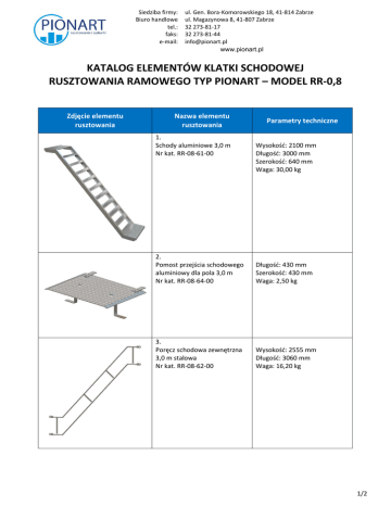 Siedziba firmy: Biuro handlowe tel.: faks: e-mail: ul. Gen. Bora-Komorowskiego 18, 41-814 Zabrze ul. Magazynowa 8, 41-807 Zabrze 32 273-81-17 32 273-81-44 [email protected] www.pionart.pl KATALOG ELEMENTÓW KLATKI SCHODOWEJ RUSZTOWANIA RAMOWEGO TYP PIONART – MODEL RR-0,8 Zdjęcie elementu rusztowania Nazwa elementu rusztowania 1. Schody aluminiowe 3,0 m Nr kat. RR-08-61-00 Parametry techniczne Wysokość: 2100 mm Długość: 3000 mm Szerokość: 640 mm Waga: 30,00 kg 2. Pomost przejścia schodowego aluminiowy dla pola 3,0 m Nr kat. RR-08-64-00 Długość: 430 mm Szerokość: 430 mm Waga: 2,50 kg 3. Poręcz schodowa zewnętrzna 3,0 m stalowa Nr kat. RR-08-62-00 Wysokość: 2555 mm Długość: 3060 mm Waga: 16,20 kg 1/2 Siedziba firmy: Biuro handlowe tel.: faks: e-mail: Zdjęcie elementu rusztowania ul. Gen. Bora-Komorowskiego 18, 41-814 Zabrze ul. Magazynowa 8, 41-807 Zabrze 32 273-81-17 32 273-81-44 [email protected] www.pionart.pl Nazwa elementu rusztowania Parametry techniczne 4. Poręcz schodowa wewnętrzna stalowa Nr kat. RR-08-63-00 Wysokość: 2560 mm Długość: 1520 mm Waga: 13,50 kg 5. Konsola 0,50 m poręczy przejścia schodowego Nr kat. RR-08-65-00 Wysokość: 460 mm Szerokość: 560 mm Waga: 4,00 kg 6. Złącze ze sworzniem do mocowania deski burtowej Nr kat. RR-08-66-00 Wysokość: 140 mm Szerokość: 120 mm Waga: 0,90 kg 2/2