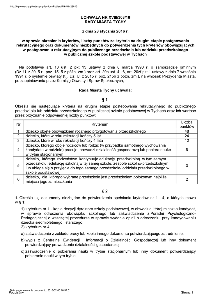 http://bip.umtychy.pl/index.php?action=PobierzPlik&id=288151 UCHWAŁA NR XVIII/303/16 RADY MIASTA TYCHY z dnia 28 stycznia 2016 r. w sprawie określenia kryteriów, liczby punktów za kryteria na drugim etapie postępowania rekrutacyjnego oraz dokumentów niezbędnych do potwierdzenia tych kryteriów obowiązujących w postępowaniu rekrutacyjnym do publicznego przedszkola lub oddziału przedszkolnego w publicznej szkole podstawowej w Tychach Na podstawie art. 18 ust. 2 pkt 15 ustawy z dnia 8 marca 1990 r. o samorządzie gminnym (Dz. U. z 2015 r., poz. 1515 z późn. zm.) oraz art. 20c ust. 4 i 6, art. 20zf pkt 1 ustawy z dnia 7 września 1991 r. o systemie oświaty (t.j. Dz. U. z 2015 r. poz. 2156 z późn. zm.), na wniosek Prezydenta Miasta, po zaopiniowaniu przez Komisję Oświaty i Spraw Społecznych, Rada Miasta Tychy uchwala: §1 Określa się następujące kryteria na drugim etapie postepowania rekrutacyjnego do publicznego przedszkola lub oddziału przedszkolnego w publicznej szkole podstawowej w Tychach oraz ich wartość przez przyznanie odpowiedniej liczby punktów: Nr Kryterium 1 2 3 dziecko objęte obowiązkiem rocznego przygotowania przedszkolnego dziecko, które w roku rekrutacji kończy 5 lat dziecko, które w roku rekrutacji kończy 4 lata dziecko, którego oboje rodziców lub rodzic (w przypadku samotnego wychowania kandydata w rodzinie) pracuje, prowadzi działalność gospodarczą lub pobiera naukę w trybie stacjonarnym dziecko, którego rodzeństwo kontynuuje edukację przedszkolną w tym samym przedszkolu, edukację szkolną w tej samej szkole, zespole szkolno-przedszkolnym lub ubiega się o przyjęcie do tego samego przedszkola/ oddziału przedszkolnego w szkole podstawowej dziecko, dla którego wybrane przedszkole jest przedszkolem położonym najbliżej miejsca jego zamieszkania 4 5 6 Liczba punktów 48 24 12 6 3 2 §2 1. Określa się dokumenty niezbędne do potwierdzenia spełniania kryteriów nr 1 i 4, o których mowa w § 1: 1) kryterium nr 1 - kopia decyzji dyrektora szkoły podstawowej, w obwodzie której mieszka kandydat, w sprawie odroczenia obowiązku szkolnego lub zaświadczenie z Poradni PsychologicznoPedagogicznej o wszczętej procedurze w sprawie wydania opinii o odroczeniu, przy kandydowaniu dziecka siedmioletniego i starszego; 2) kryterium nr 4: a) zaświadczenie z zakładu pracy lub kopia innego dokumentu potwierdzającego zatrudnienie, b) wypis z Centralnej Ewidencji i Informacji o Działalności Gospodarczej lub inny dokument potwierdzający prowadzenie działalności gospodarczej, c) zaświadczenie o pobieraniu nauki w trybie stacjonarnym lub inny dokument potwierdzający pobieranie nauki w tym trybie. Data wygenerowania dokumentu: 2016-02-05 10:57:51 Podpisany Strona 1 http://bip.umtychy.pl/index.php?action=PobierzPlik&id=288151 2. Dokumentem potwierdzającym spełnianie pozostałych kryteriów, o których mowa w § 1 jest wniosek o przyjęcie dziecka do publicznego przedszkola/oddziału przedszkolnego w szkole podstawowej wraz z zawartymi w nim oświadczeniami składanymi pod rygorem odpowiedzialności karnej za składanie fałszywych zeznań. 3. W przypadku dokumentów, o których mowa w ust. 1 pkt 2) na potwierdzenie spełnienia kryterium nr 4 przez oboje rodziców należy złożyć jeden z tych dokumentów dla każdego z rodziców z osobna, a w przypadku rodzica samotnie wychowującego dziecko wystarczające jest przedłożenie jednego z tych dokumentów. §3 Wykonanie uchwały powierza się Prezydentowi Miasta Tychy. §4 Uchwała wchodzi w życie po upływie 14 dni od dnia ogłoszenia w Dzienniku Urzędowym Województwa Śląskiego. Przewodniczący Rady Miasta Tychy Maciej Gramatyka Data wygenerowania dokumentu: 2016-02-05 10:57:51 Podpisany Powered by TCPDF (www.tcpdf.org) Strona 2